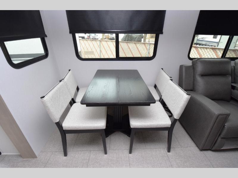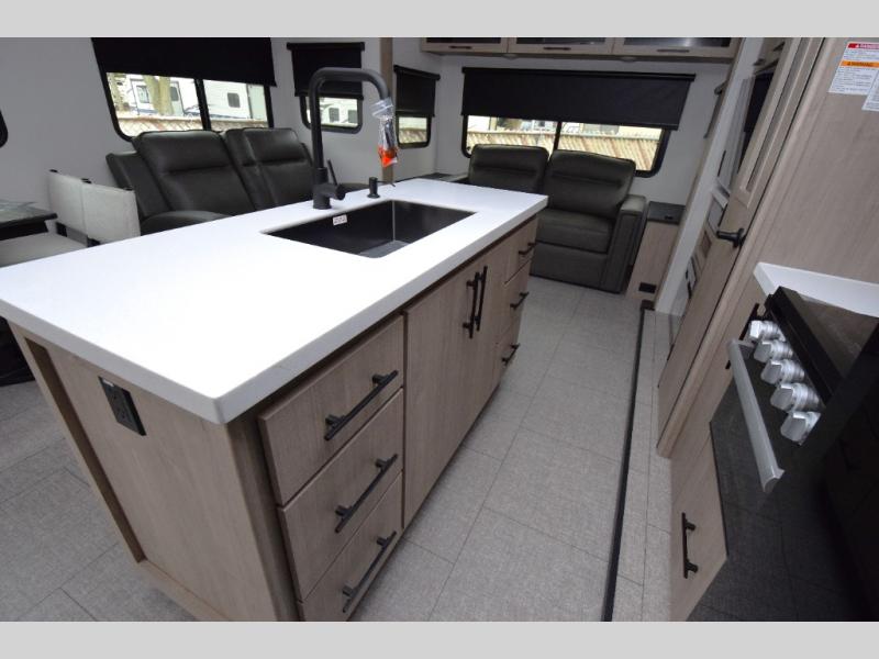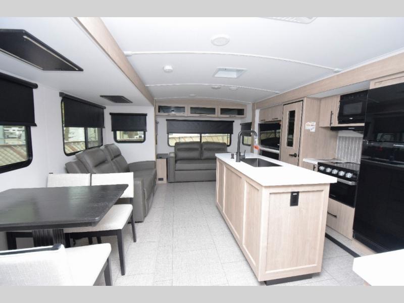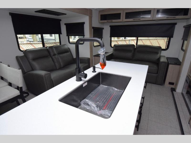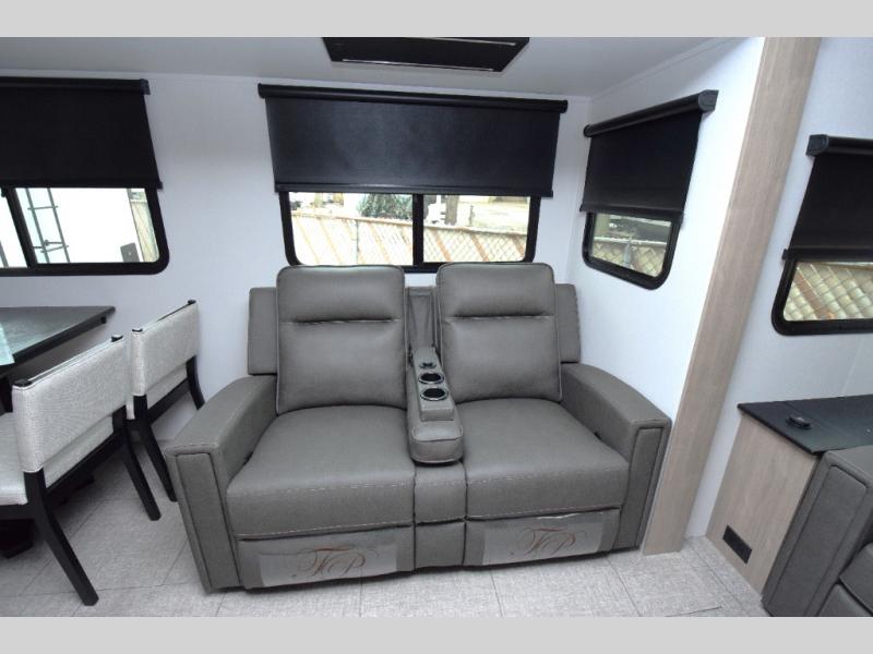 Spacious Living Area: With opposing slides, the interior offers ample room to relax. Enjoy the cozy tri-fold sofa and luxurious theater seating, making it perfect for movie nights or game time with friends.