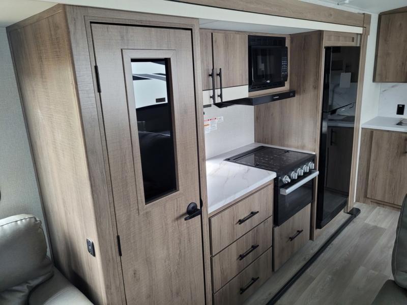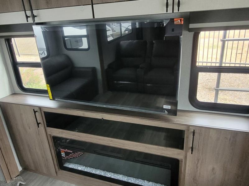The rear living room on this Imagine travel trailer is just what you'll want when you're looking for a little down time. This room has opposing tri-fold sofas within slides, theater seating, a 50" LED HDTV, and a 48" fireplace. Another place that you can sit down at is the free-standing dinette. You can sit here with a fresh cup of coffee in the afternoon as you map out your hike for tomorrow. The kitchen offers you a microwave, a three-burner range with oven, a 10-cubic foot 12V double door refrigerator, and pantry to help you make meals, and there is a private bedroom with a 60" x 80" bed to rest on at the end of the day.