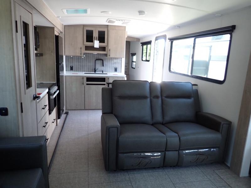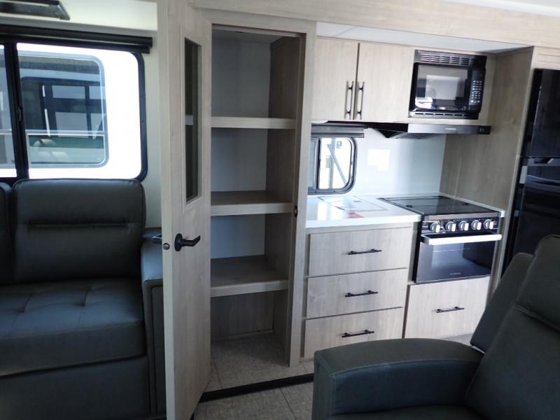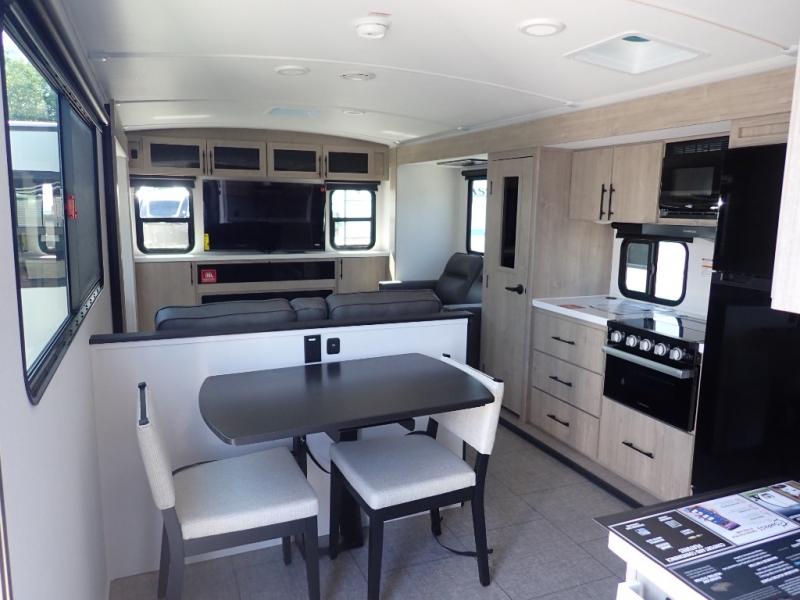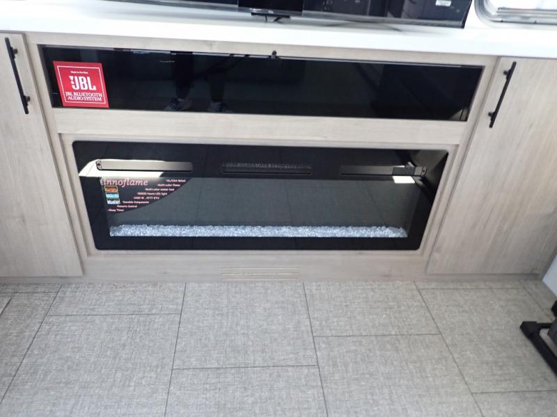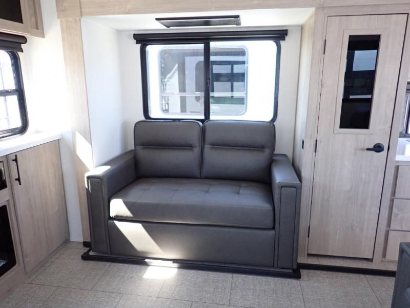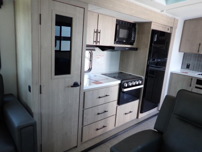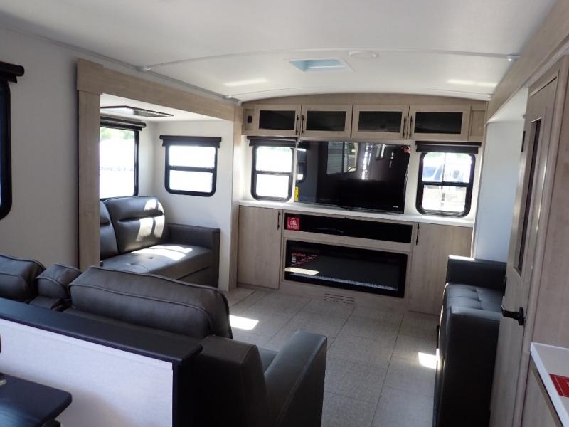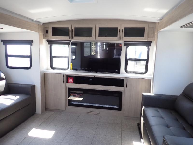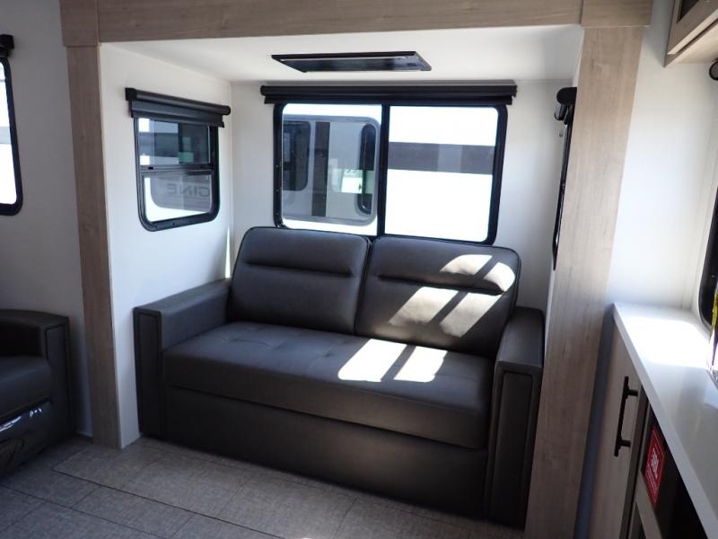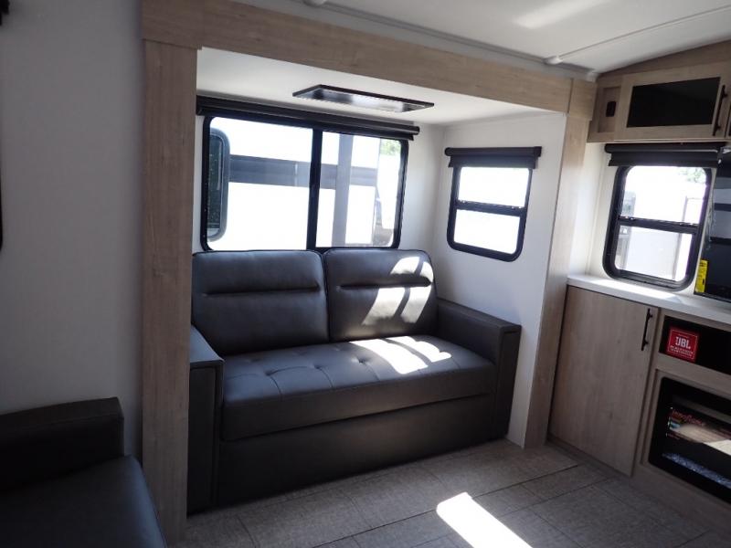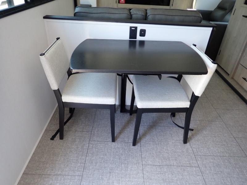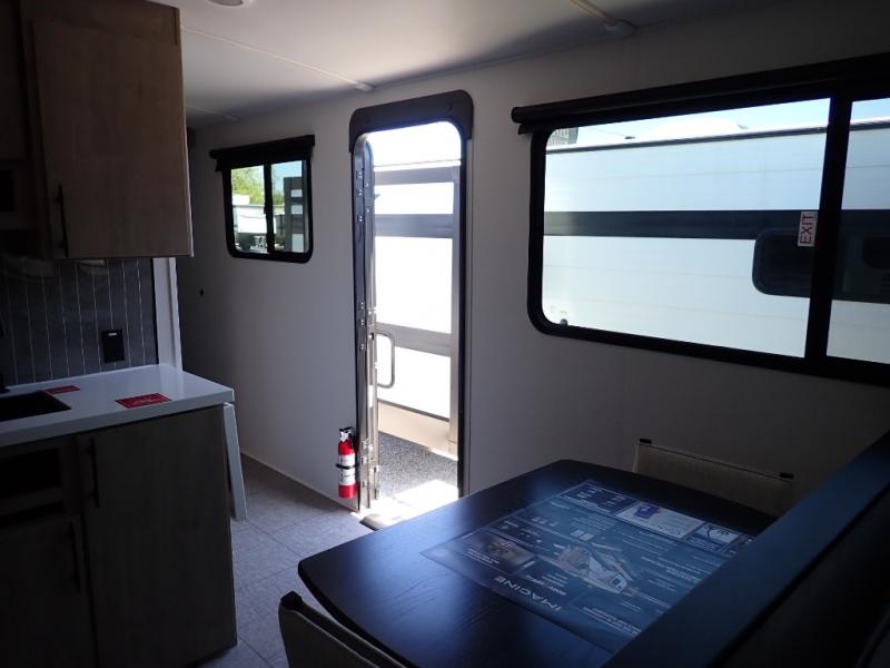 The rear living room on this Imagine travel trailer is just what you'll want when you're looking for a little down time. This room has opposing tri-fold sofas within slides, theater seating, a 50" LED HDTV, and a 48" fireplace. Another place that you can sit down at is the free-standing dinette. You can sit here with a fresh cup of coffee in the afternoon as you map out your hike for tomorrow. The kitchen offers you a microwave, a three-burner range with oven, a 10-cubic foot 12V double door refrigerator, and pantry to help you make meals, and there is a private bedroom with a 60" x 80" bed to rest on at the end of the day.