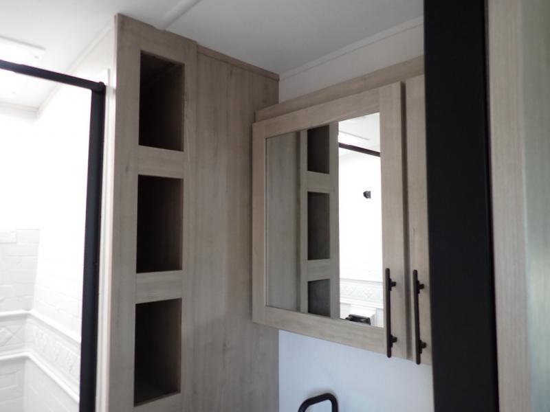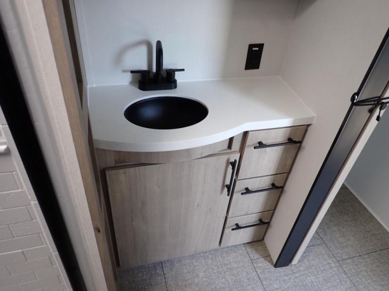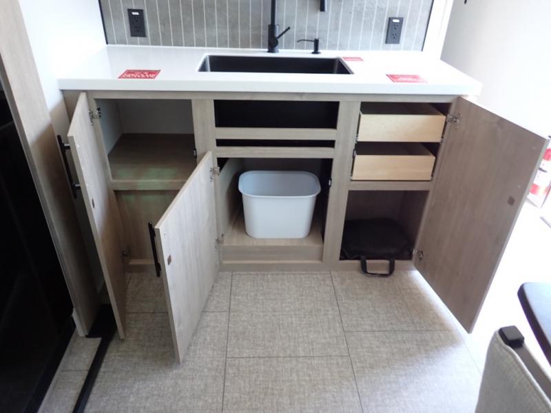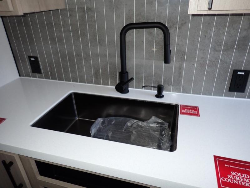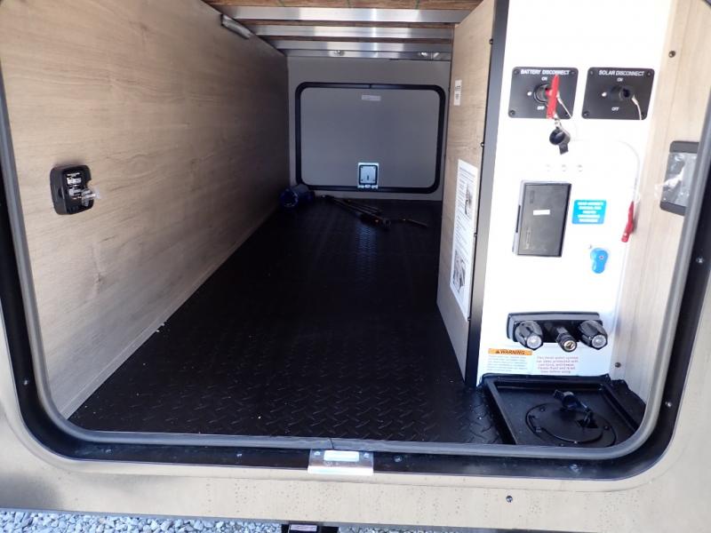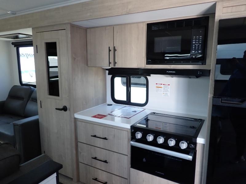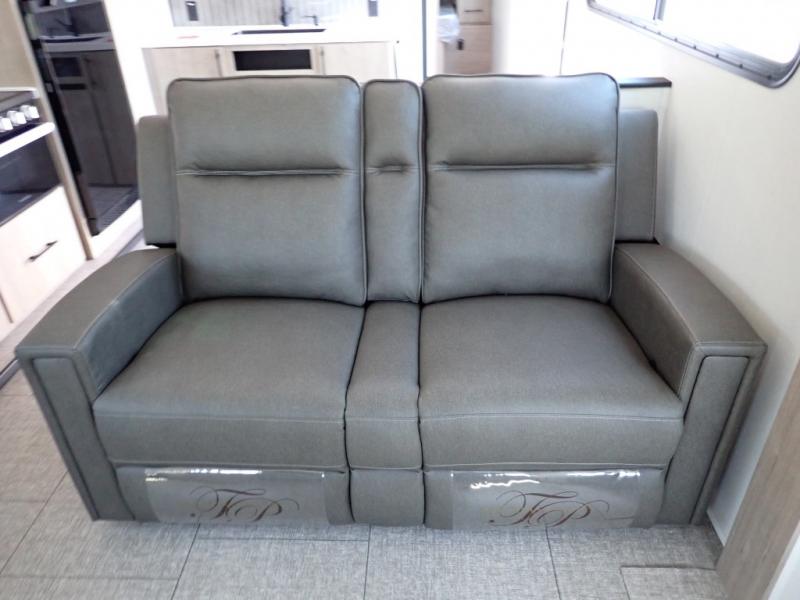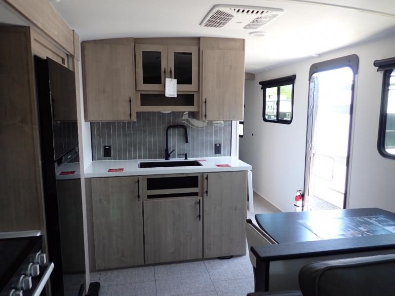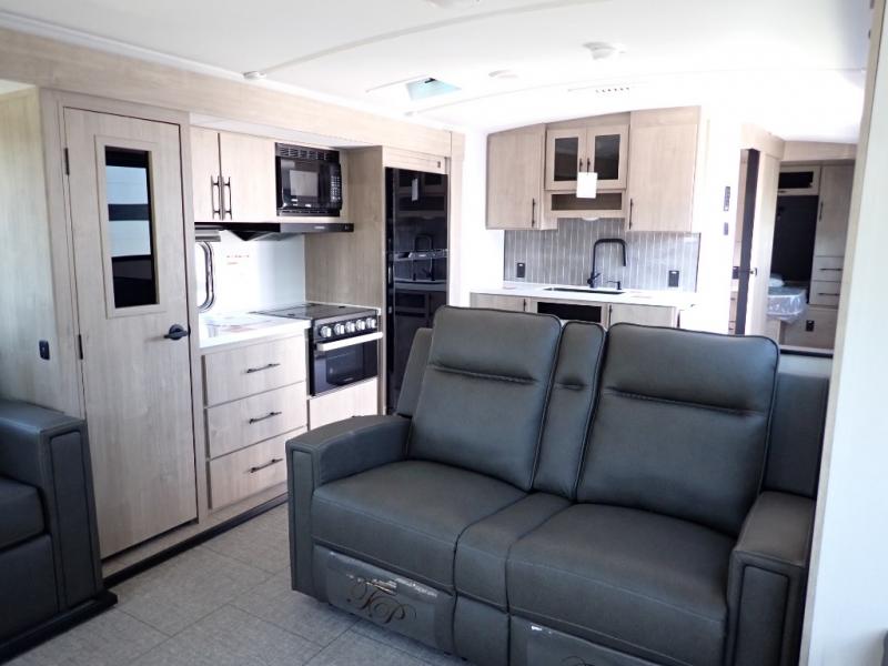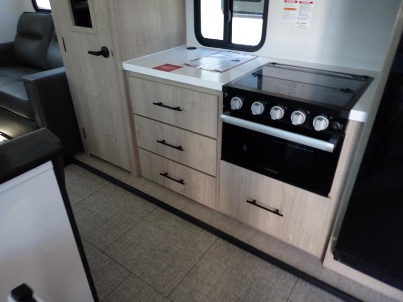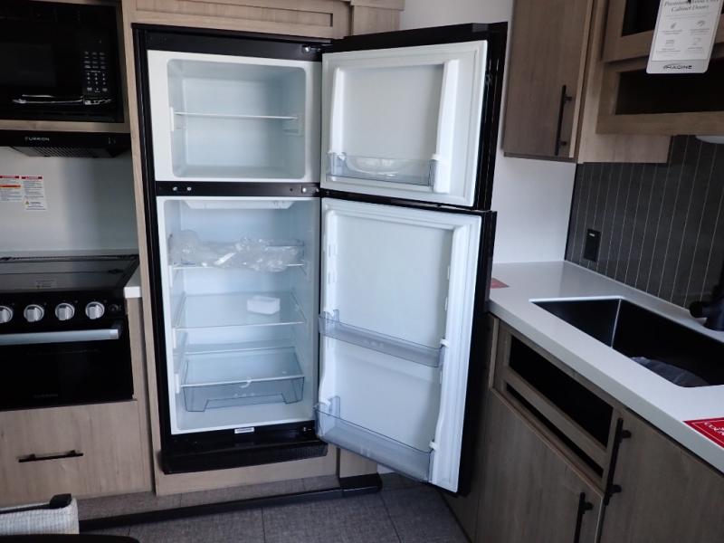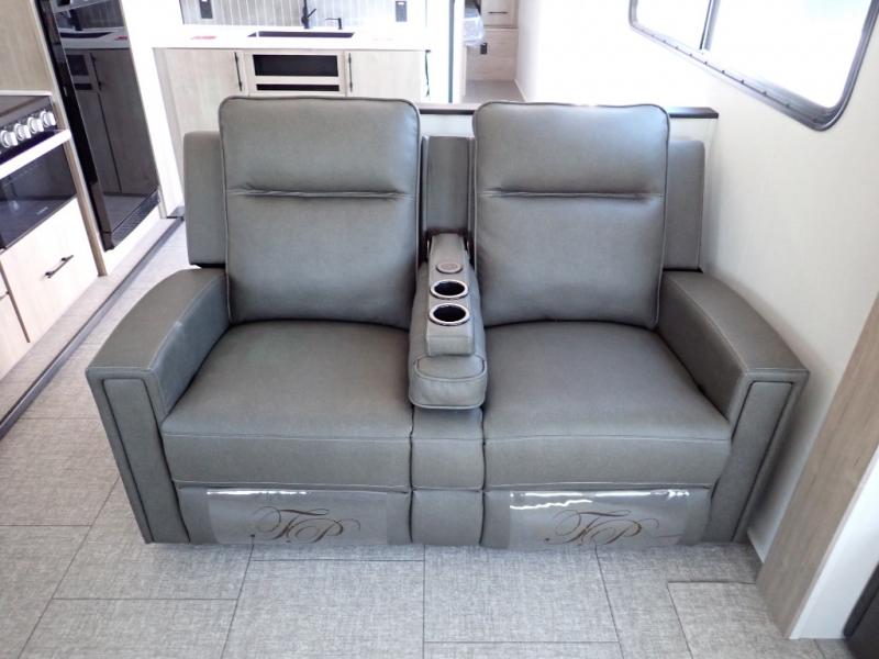 The rear living room on this Imagine travel trailer is just what you'll want when you're looking for a little down time. This room has opposing tri-fold sofas within slides, theater seating, a 50" LED HDTV, and a 48" fireplace. Another place that you can sit down at is the free-standing dinette. You can sit here with a fresh cup of coffee in the afternoon as you map out your hike for tomorrow. The kitchen offers you a microwave, a three-burner range with oven, a 10-cubic foot 12V double door refrigerator, and pantry to help you make meals, and there is a private bedroom with a 60" x 80" bed to rest on at the end of the day.