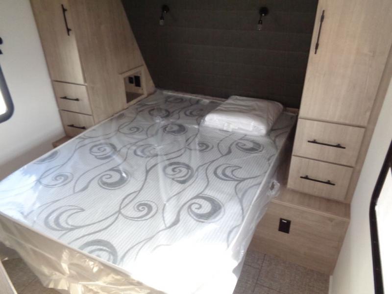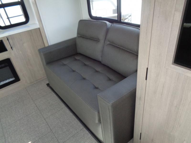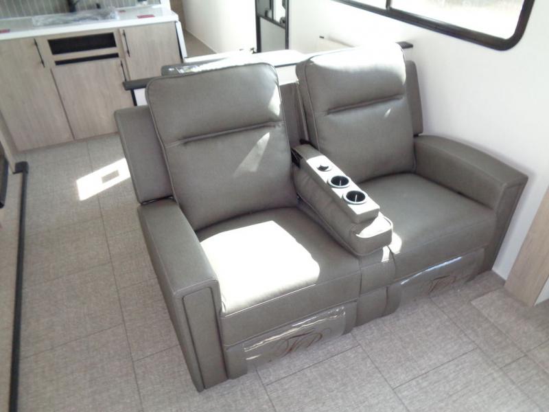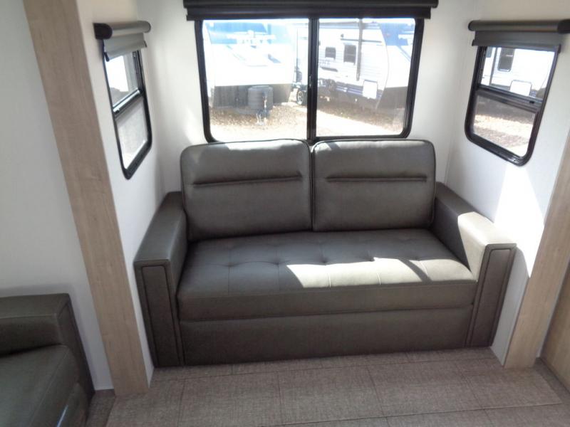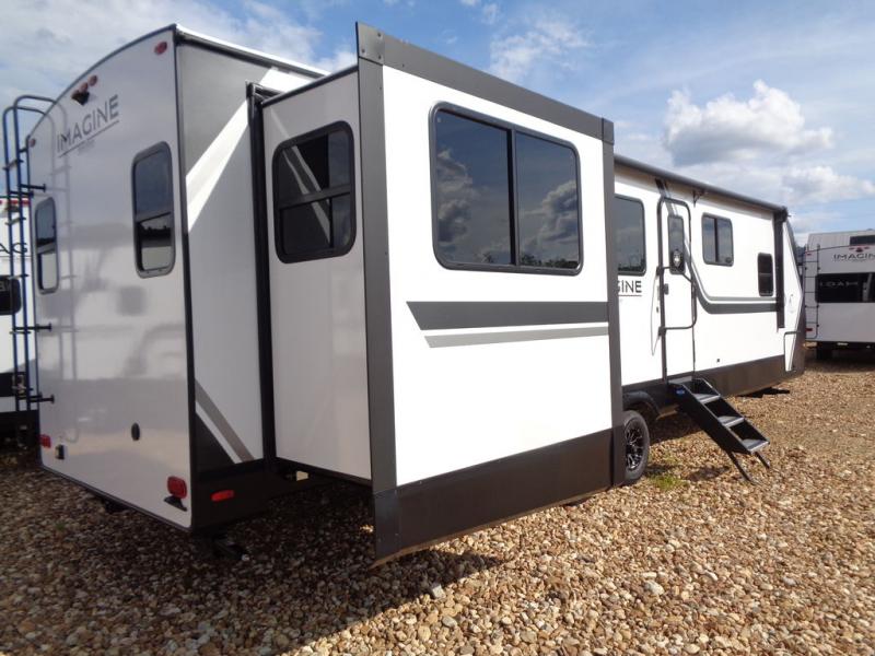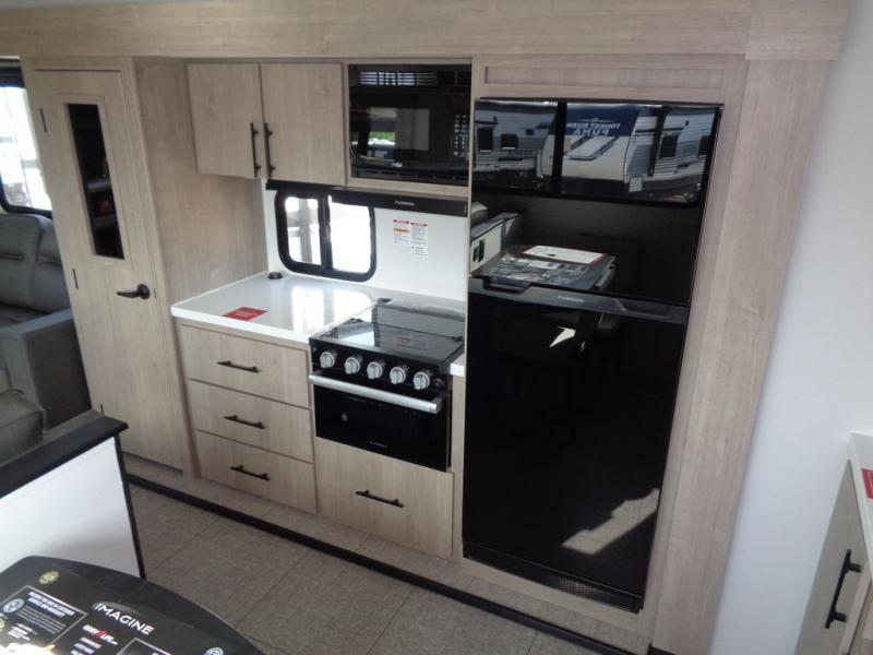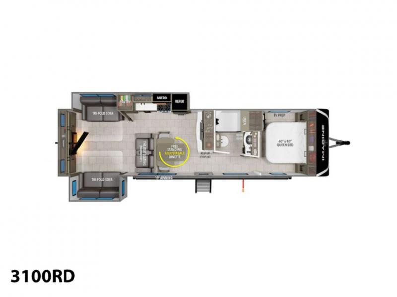 The rear living room on this Imagine travel trailer is just what you'll want when you're looking for a little down time. This room has opposing tri-fold sofas within slides, theater seating, and a LED HDTV. Another place that you can sit down at is the free-standing adjustable dinette. You can sit here with a fresh cup of coffee in the afternoon as you map out your hike for tomorrow. The kitchen offers you a flip-up countertop extension, a microwave, a three-burner range with oven, a 10-cubic foot 12V refrigerator, and pantry to help you make meals, and there is a private bedroom with a 60" x 80" bed to rest on at the end of the day.