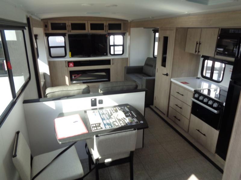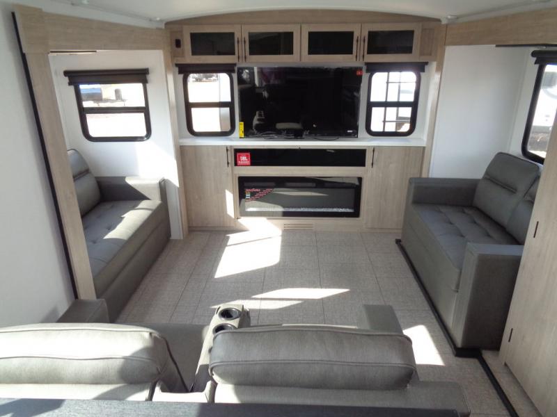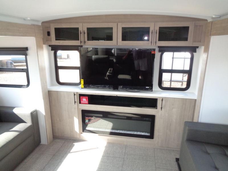 BRYNLEE TEAK INTERIOR, GOODYEAR TIRES, ABS AXLE ASSEMBLY W/SWAY CONTROL, FIREPLACE, 50 AMP SERVICE-WIRED & FRAMED FOR 2ND A/C, FREE STANDING TABLE & CHAIRS, 2ND A/C DUCTED-Gadsden store- Reduced to $45,998 plus tax, title, and doc!
