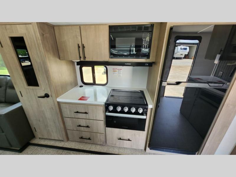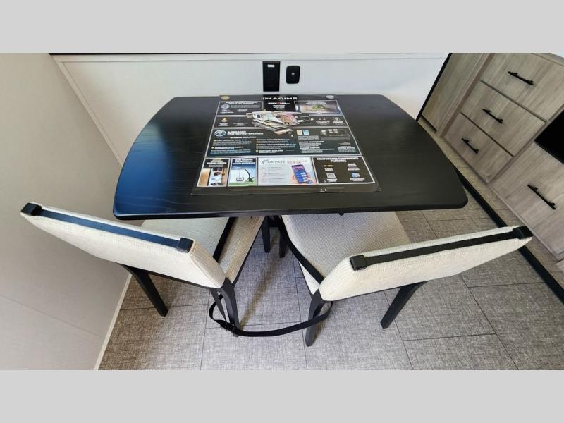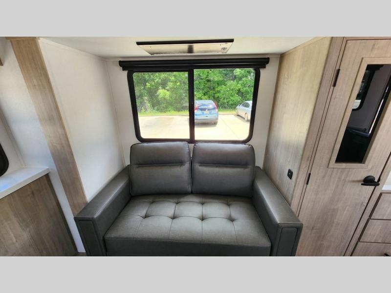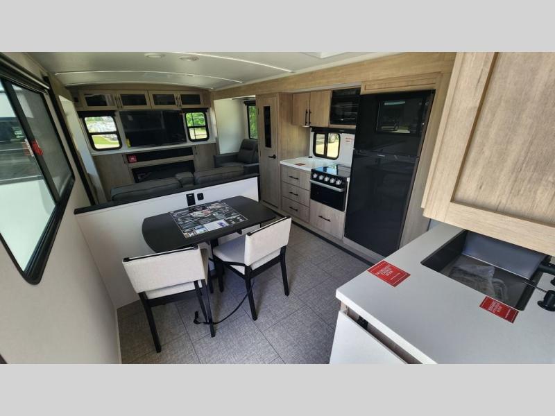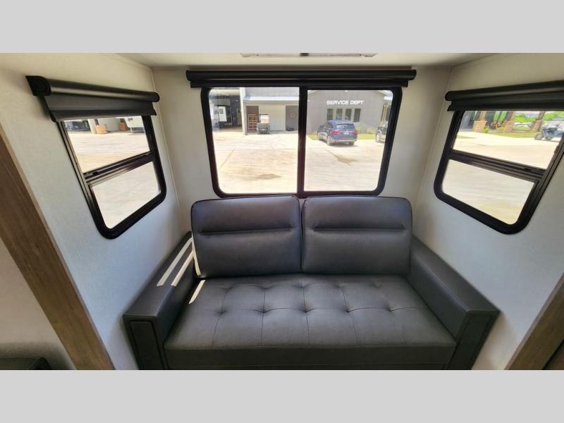 The rear living room on this Imagine travel trailer is just what you'll want when you're looking for a little down time. This room has opposing tri-fold sofas within slides, theater seating, and a LED HDTV. Another place that you can sit down at is the free-standing adjustable dinette. You can sit here with a fresh cup of coffee in the afternoon as you map out your hike for tomorrow. The kitchen offers you a flip-up countertop extension, a microwave, a three-burner range with oven, a 10-cubic foot 12V refrigerator, and pantry to help you make meals, and there is a private bedroom with a 60" x 80" bed to rest on at the end of the day.