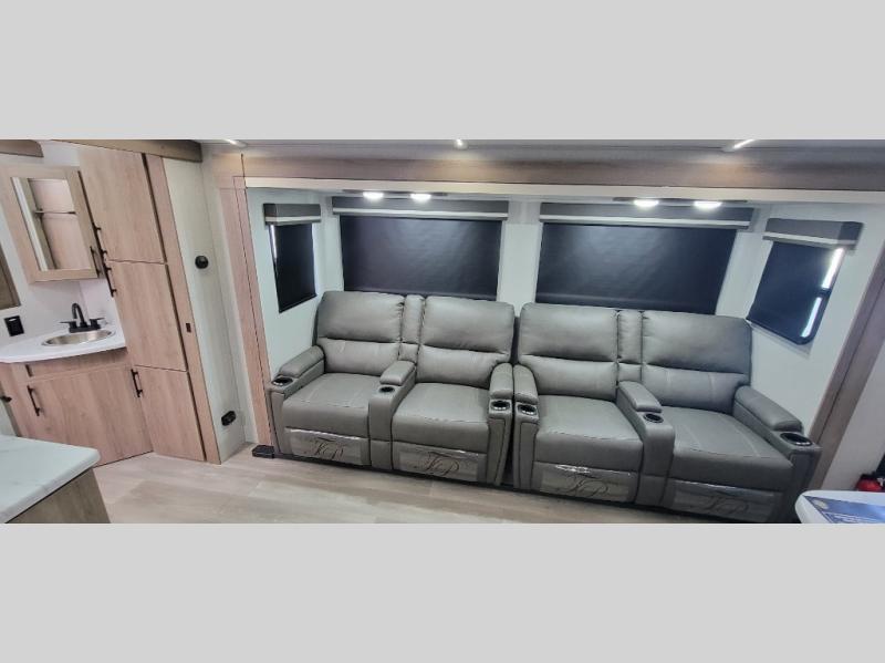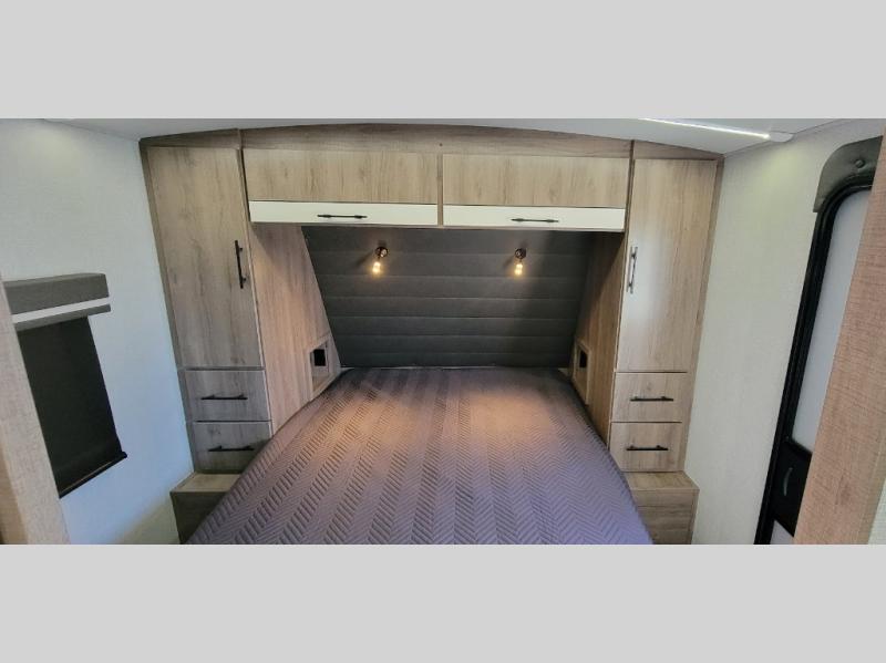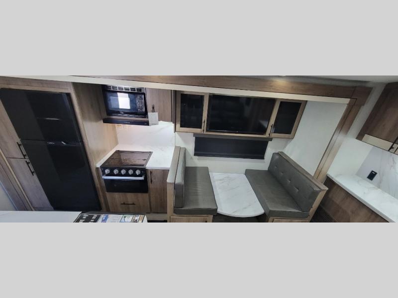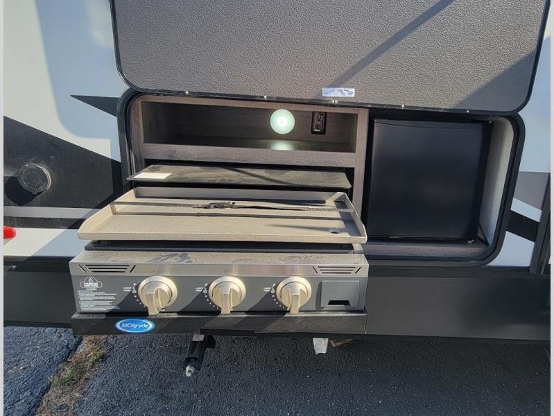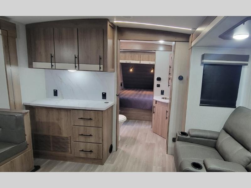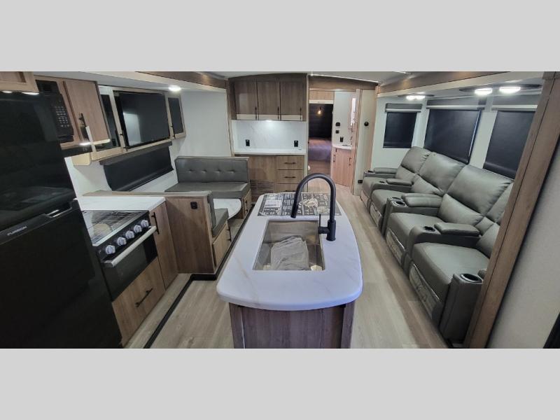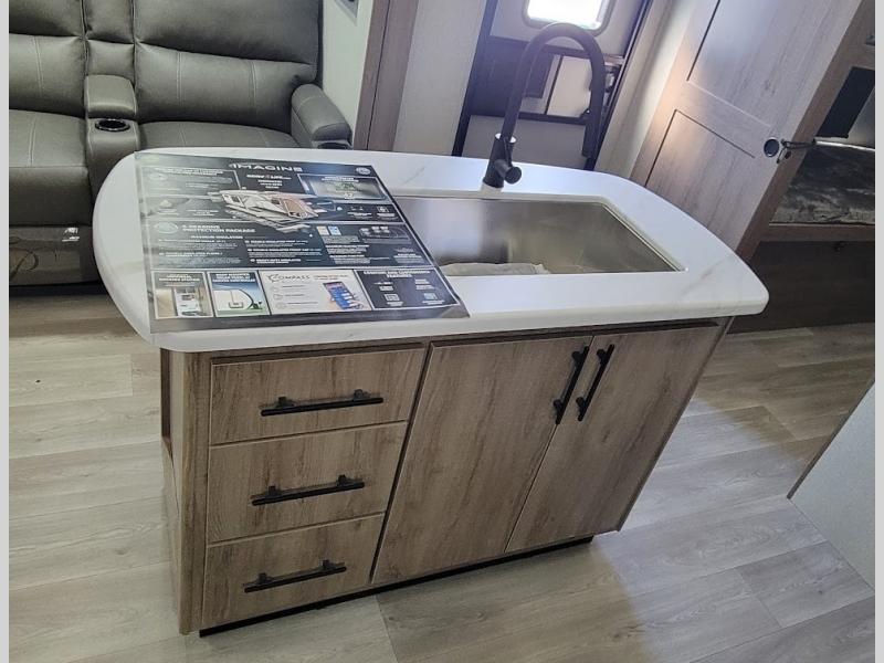 A great travel trailer for larger families or those that enjoy traveling with a few friends! This Imagine quad bunk model features two private bedrooms, with the master up front including a private entry/exit door just beyond a spacious walk-through bathroom that features a 30" x 36" shower with skylight to bring in more natural lighting each day, plus a toilet, sink and linen storage. In the kitchen, a nice island for food prep and cleaning up makes it easy to be part of the conversation in the room while you get meals ready for everyone. Speaking of food prep, how about the outside griddle and 1.6 cu. ft. refrigerator which is perfect for cooking outside, or for making late night snacks when all are enjoying the evening under the stars or in lawn chairs under one of two 9' 6" awnings with LED lighting. Your kids can bring along extra guests with the added sleeping that a quad bunk model provides. And, there is plenty of storage in the private bunkroom with drawers beneath for their things, plus a rear baggage door that is 42" x 22" for even more storage space for extra toys and gear.