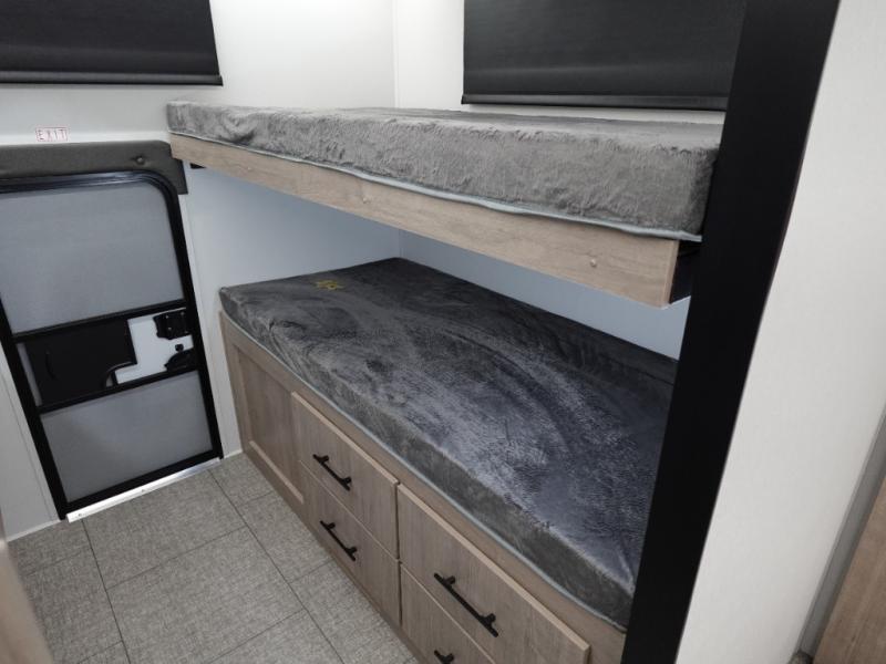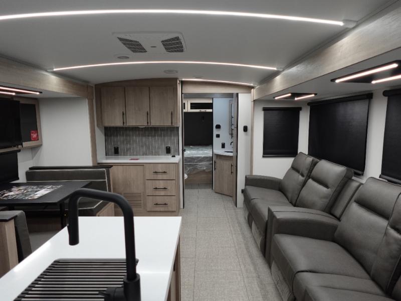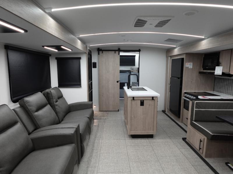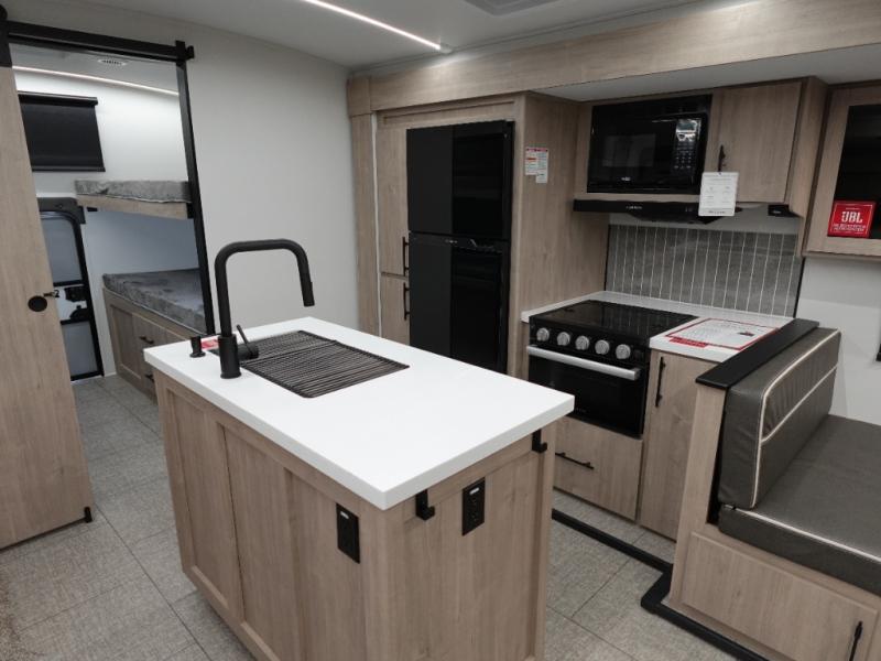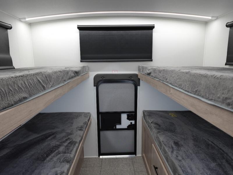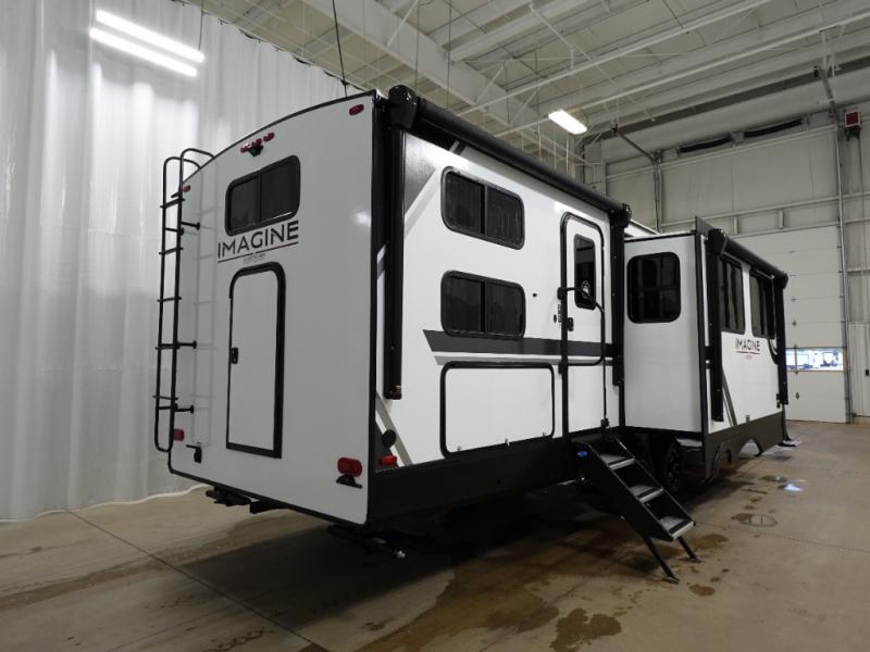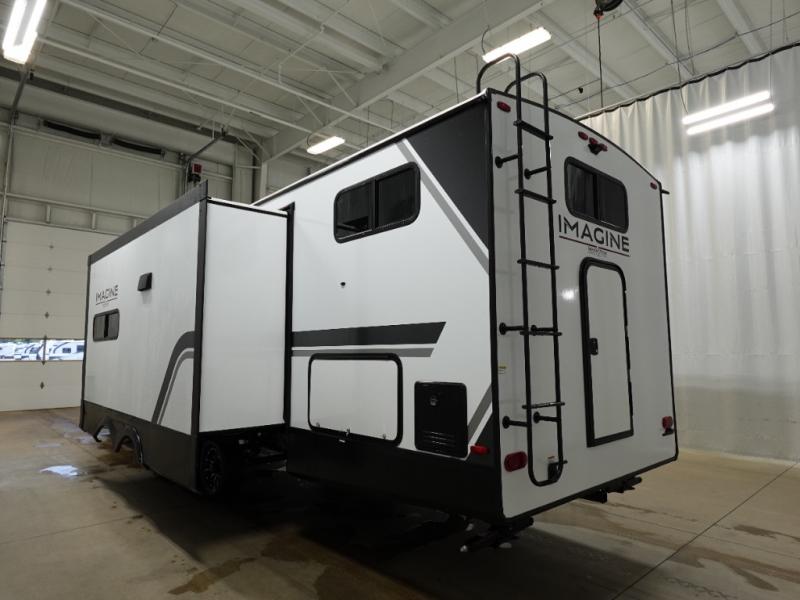 A great travel trailer for larger families or those that enjoy traveling with a few friends! This Imagine quad bunk model features two private bedrooms, with the master up front including a private entry/exit door just beyond a spacious walk-through bathroom that features a 30" x 36" shower with skylight to bring in more natural lighting each day, plus a toilet, sink and linen storage. In the kitchen, a nice island for food prep and cleaning up makes it easy to be part of the conversation in the room while you get meals ready for everyone. Speaking of food prep, how about the outside griddle and 1.6 cu. ft. refrigerator which is perfect for cooking outside, or for making late night snacks when all are enjoying the evening under the stars or in lawn chairs under one of two 9' 6" awnings with LED lighting. Your kids can bring along extra guests with the added sleeping that a quad bunk model provides!