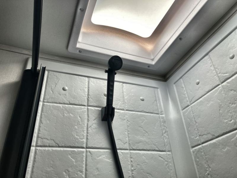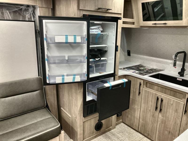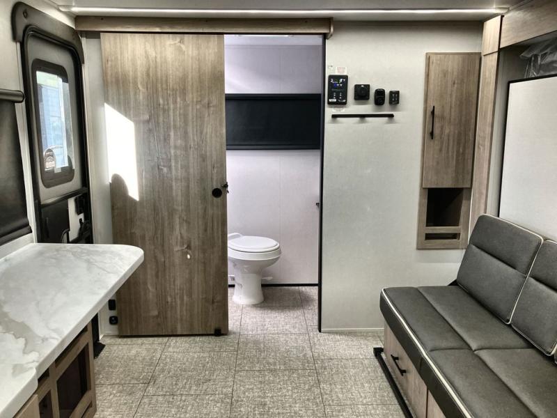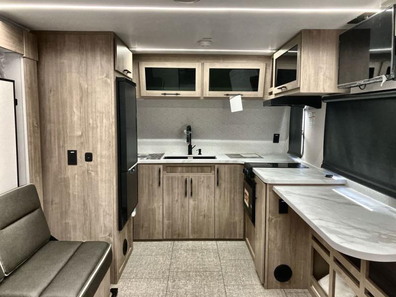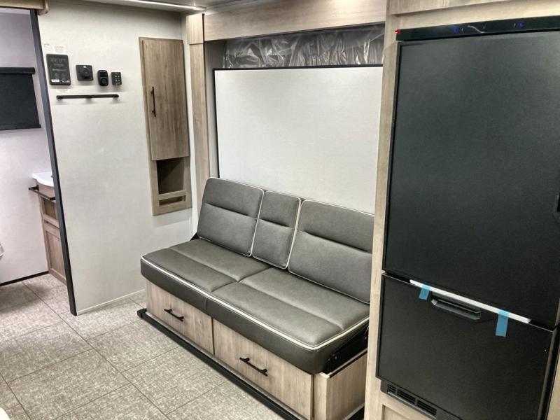 This simple, but cozy travel trailer is sure to meet all of your camping needs. There is a full rear bath with a shower skylight and wardrobe to keep your things tidy. The front kitchen includes ample counter space to prep meals and a bar tabletop dinette with three stools you are sure to love. A two burner cooktop also comes standard, along with a convection microwave, and an exterior griddle for when you want to cook outdoors under the 12' awning! The versatile Murphy bed provides seating and sleeping space each day, and the hi-definition LED TV across from the bed will let you watch movies at night.