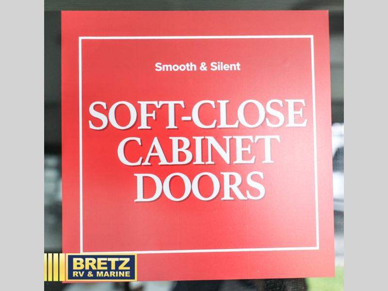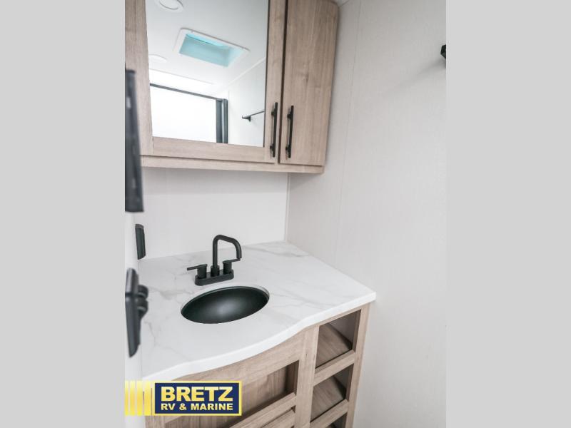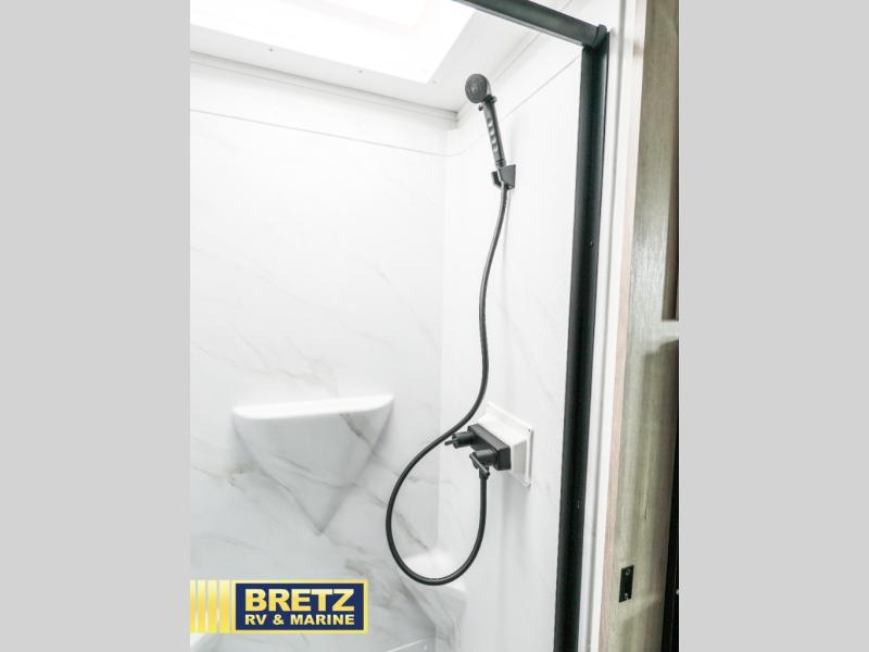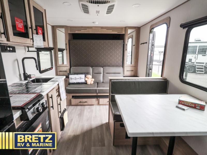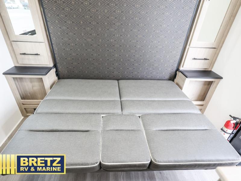 Start looking for your favorite campground to take this travel trailer to! After a fun day at the beach, you can rinse the sand out of your hair with the walk-in shower with a skylight in the full rear bathroom. Depending on what time you enter the unit will determine whether you see the Murphy bed or sofa with drawers underneath and wardrobes on either side of it. The booth dinette is not only great for enjoying meals prepared with the two burner cooktop or outside griddle, but also for transforming into an extra sleeping space!
