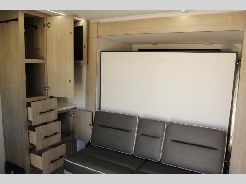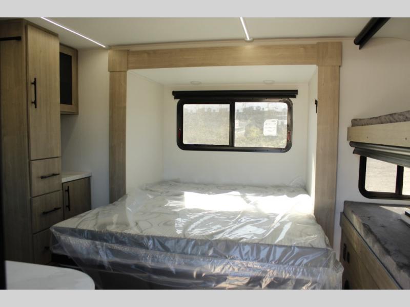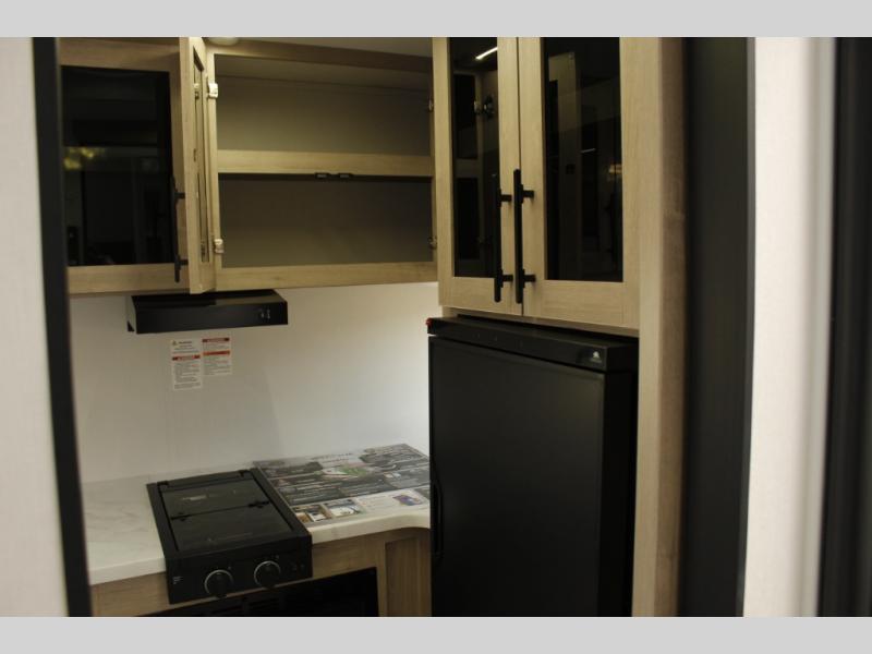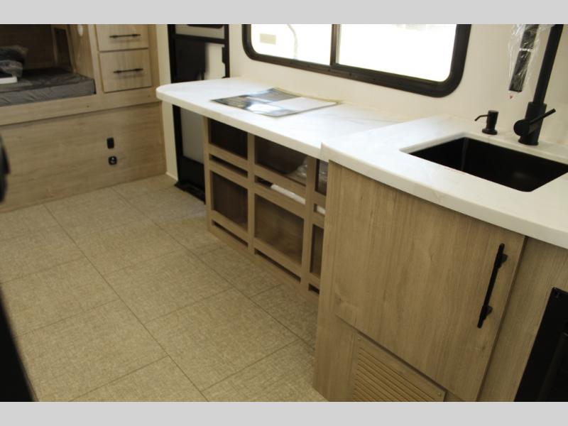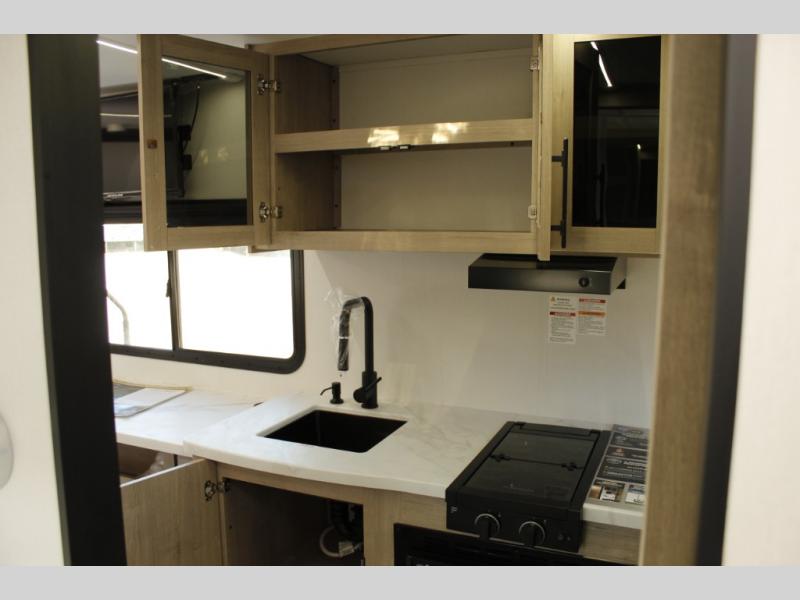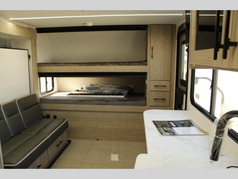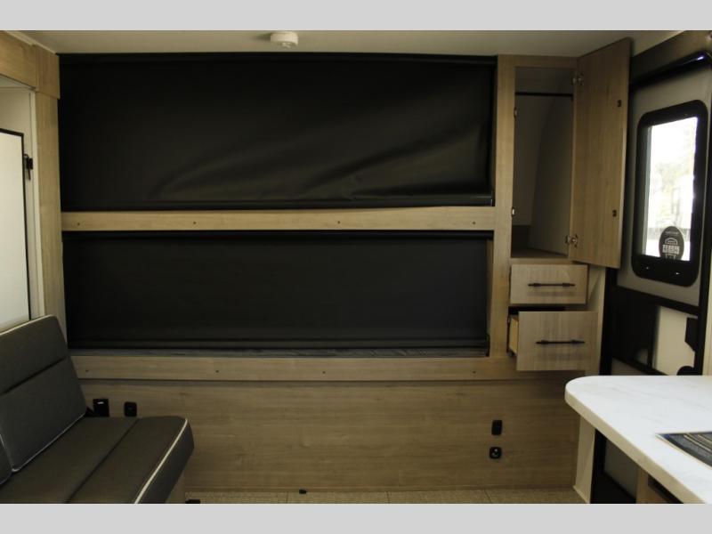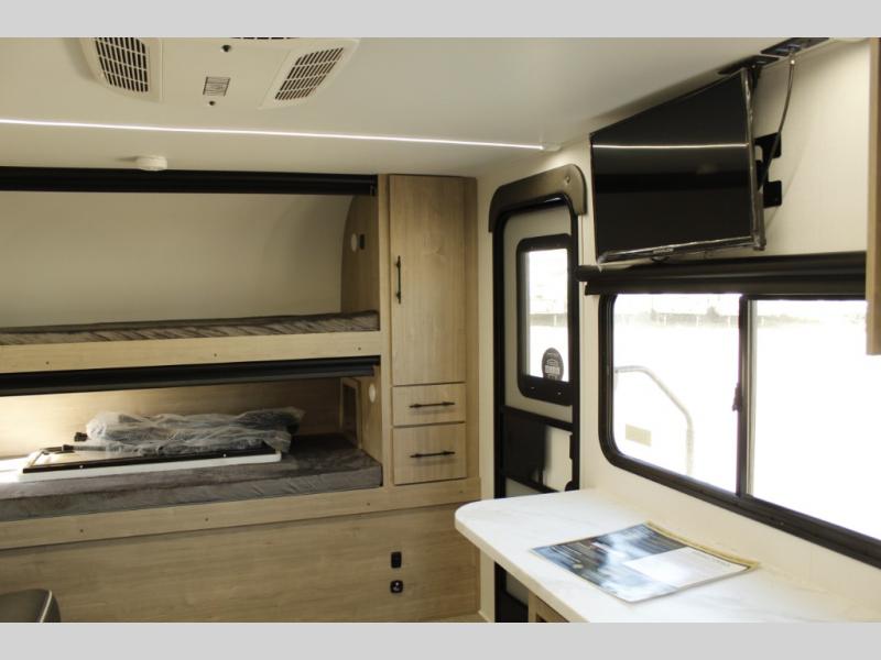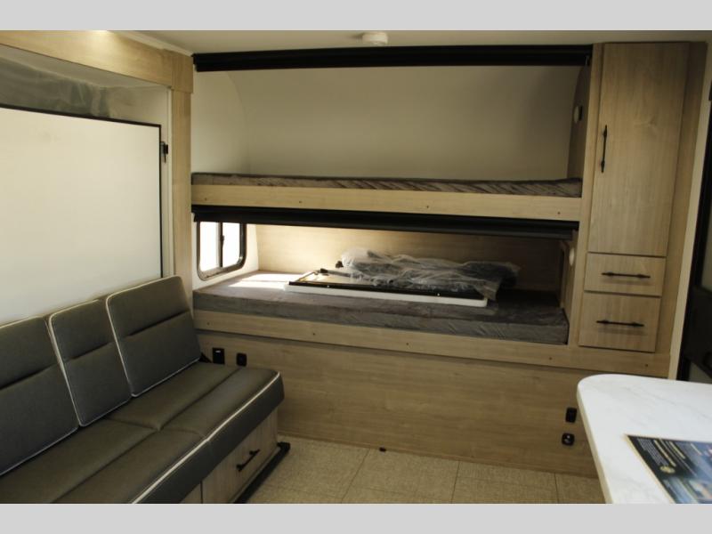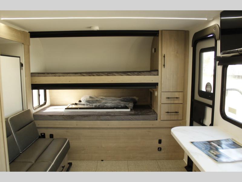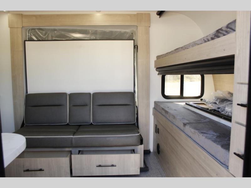 Head to far-off adventures in this lightweight travel trailer that can sleep four each night. There are front bunk beds with pull-down privacy blinds and a wardrobe to keep clothes tidy. You'll enjoy the Murphy bed slide out for seating and sleeping space, and there is also a removable table here and two drawers for storage. The full kitchen includes a two burner cooktop, a convection microwave, plus a 12V refrigerator for food storage. You can dine each day at the bar tabletop with three stools, or take your plate outdoors to sit under the 12' power awning with LED lights.