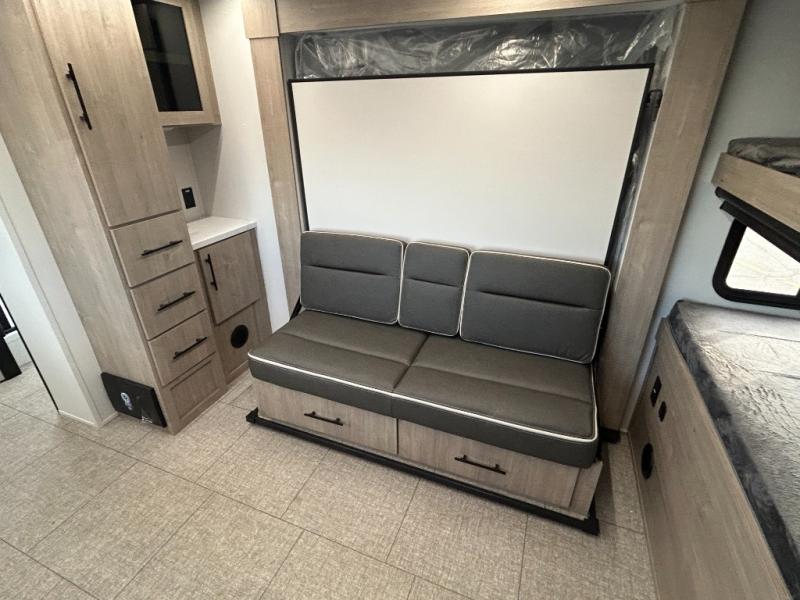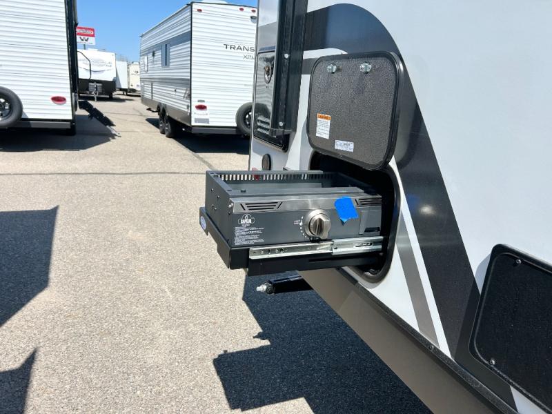 Head to far-off adventures in this lightweight travel trailer that can sleep four each night. There are front bunk beds with pull-down privacy blinds and a wardrobe to keep clothes tidy. You'll enjoy the Murphy bed slide out for seating and sleeping space, and there is also a removable table here and two drawers for storage. The full kitchen includes a two burner cooktop, a convection microwave, plus a 12V refrigerator for food storage. You can dine each day at the bar tabletop with three stools, or take your plate outdoors to sit under the 12' power awning with LED lights.