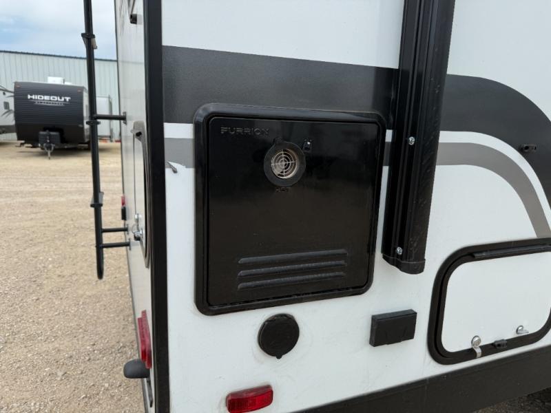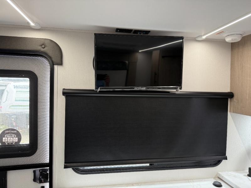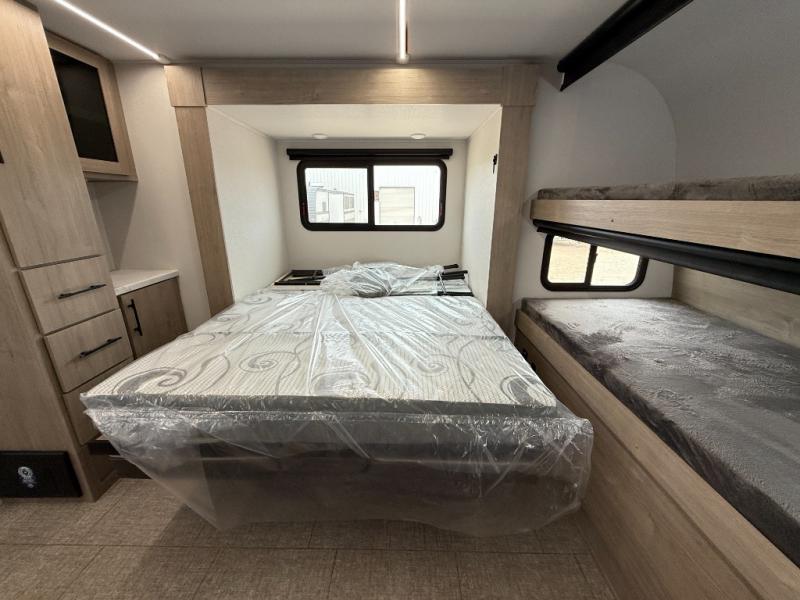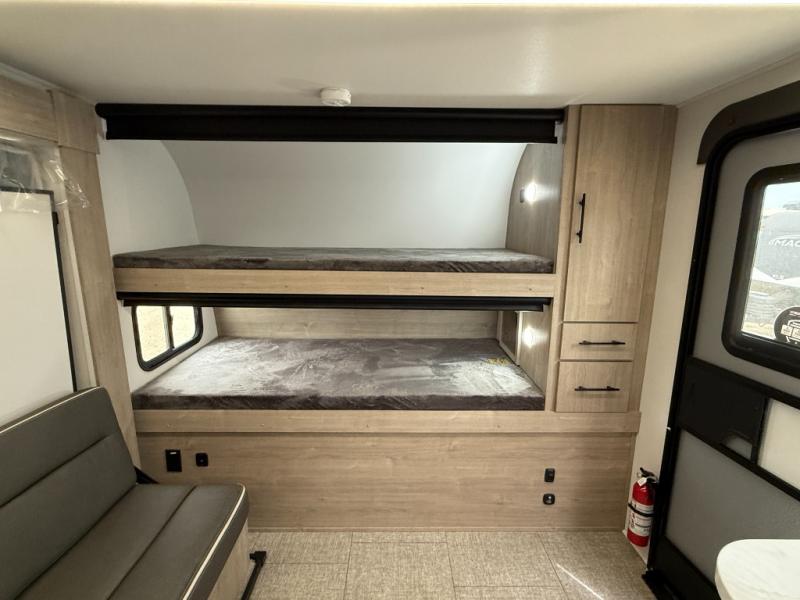Head to far-off adventures in this lightweight travel trailer that can sleep four each night. There are front bunk beds with pull-down privacy blinds and a wardrobe to keep clothes tidy. You'll enjoy the Murphy bed slide out for seating and sleeping space, and there is also a removable table here and two drawers for storage. The full kitchen includes a two burner cooktop, a convection microwave, plus a 12V refrigerator for food storage. You can dine each day at the bar tabletop with three stools, or take your plate outdoors to sit under the 12' power awning with LED lights.