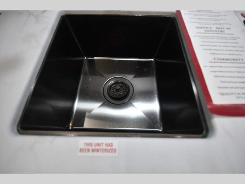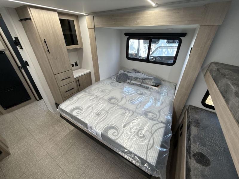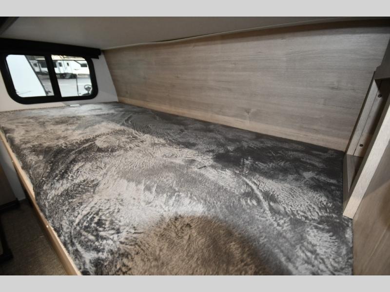 Head to far-off adventures in this lightweight travel trailer that can sleep four each night. There are front bunk beds with pull-down privacy blinds and a wardrobe to keep clothes tidy. You'll enjoy the Murphy bed slide out for seating and sleeping space, and there is also a removable table here and two drawers for storage. The full kitchen includes a two burner cooktop, a convection microwave, plus a 12V refrigerator for food storage. You can dine each day at the bar tabletop with three stools, or take your plate outdoors to sit under the 12' power awning with LED lights.