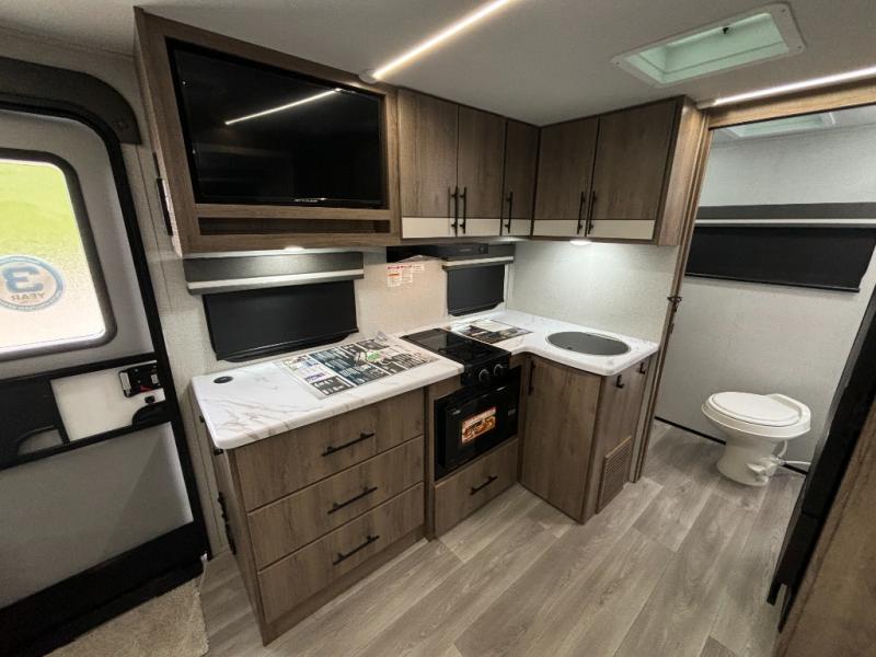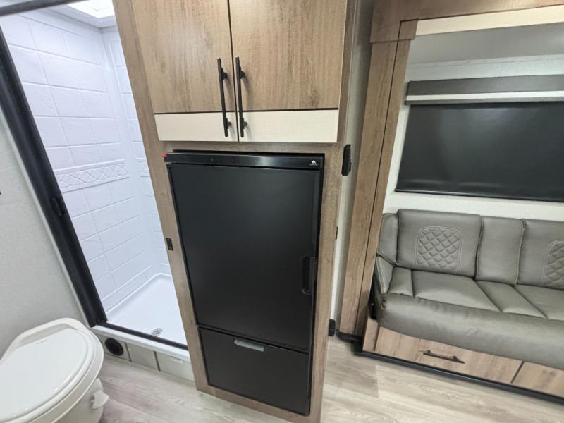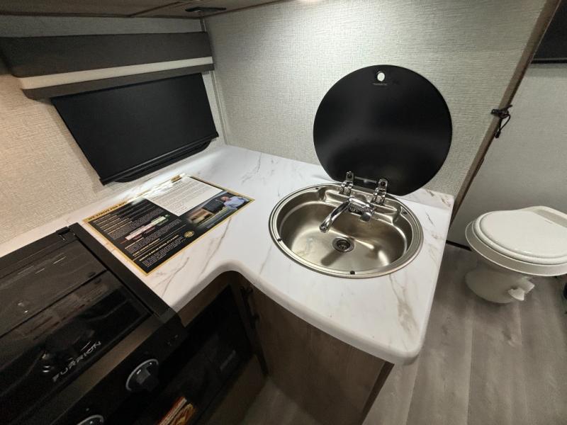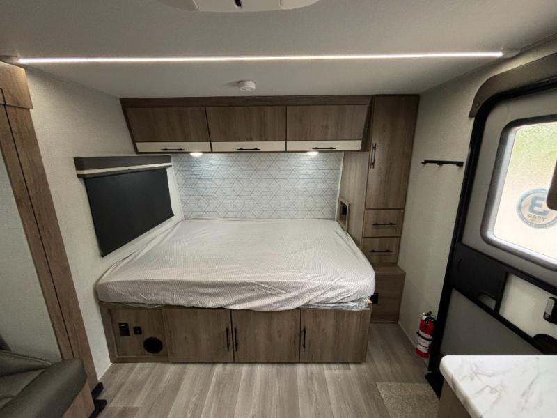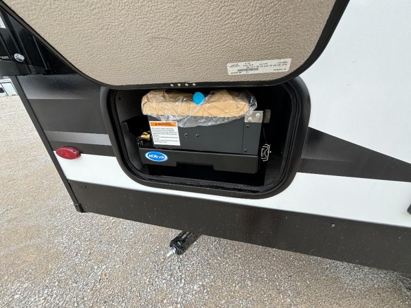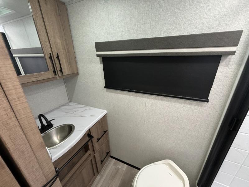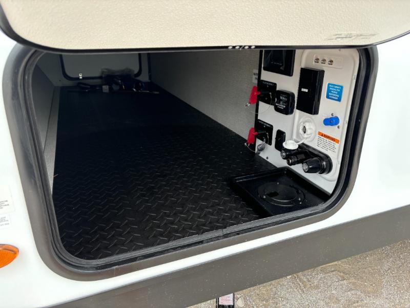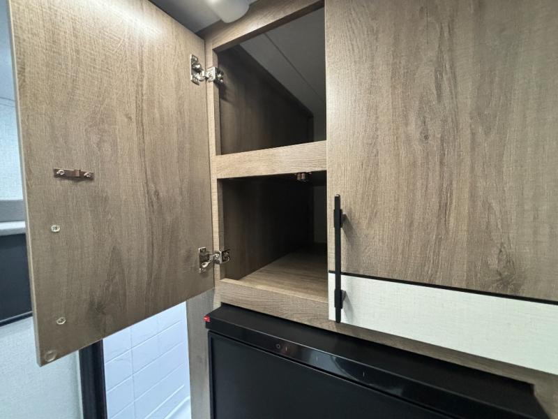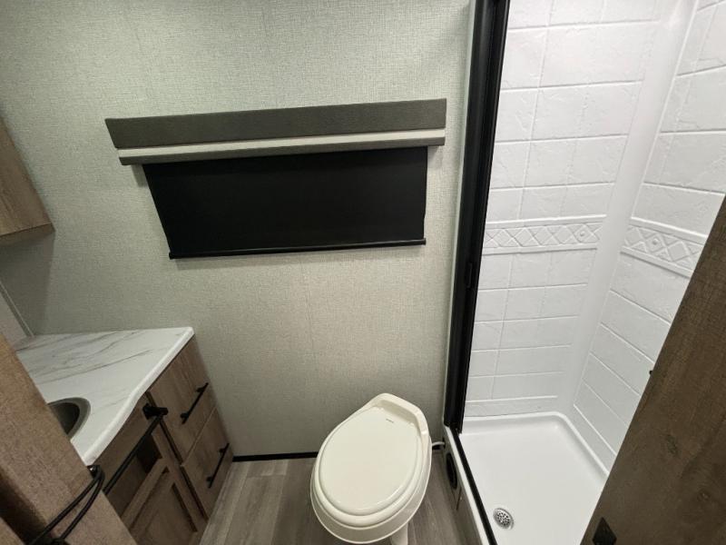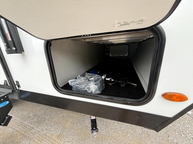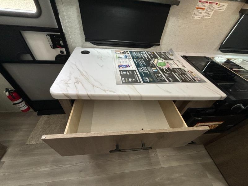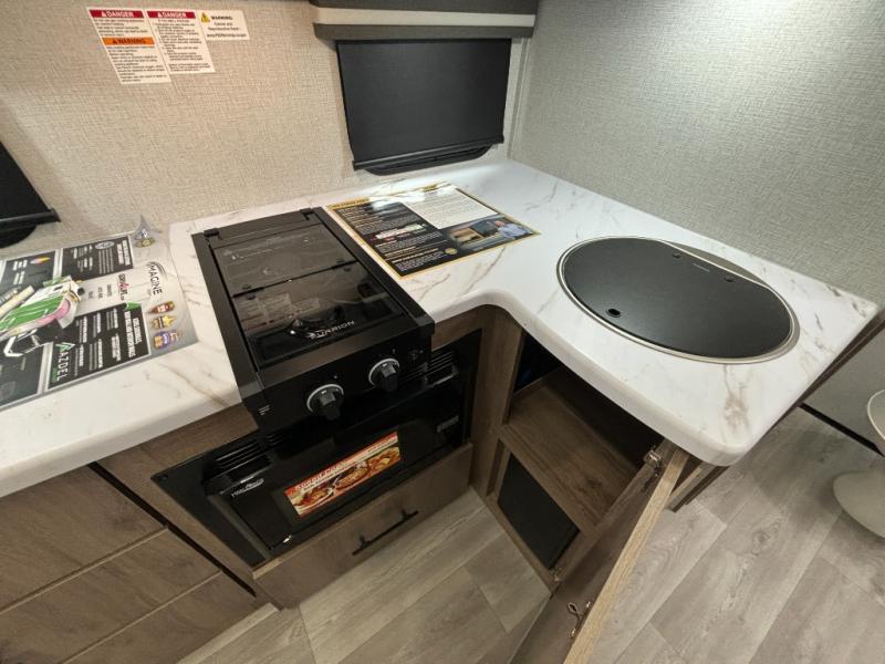 Pack your bags and head out on a fun camping trip in this travel trailer! The front queen bed offers a comfortable place to sleep at night, as well as the roll-over sleeper sofa slide with drawers for storage. You can hang your jacket up on one of the coat hooks when you enter, and then start preparing a delicious meal on the two burner cooktop. You even have an outside griddle to fry up the catch of the day. The full rear bathroom has a walk-in shower with skylight to freshen up in and overhead cabinets for your toiletries!