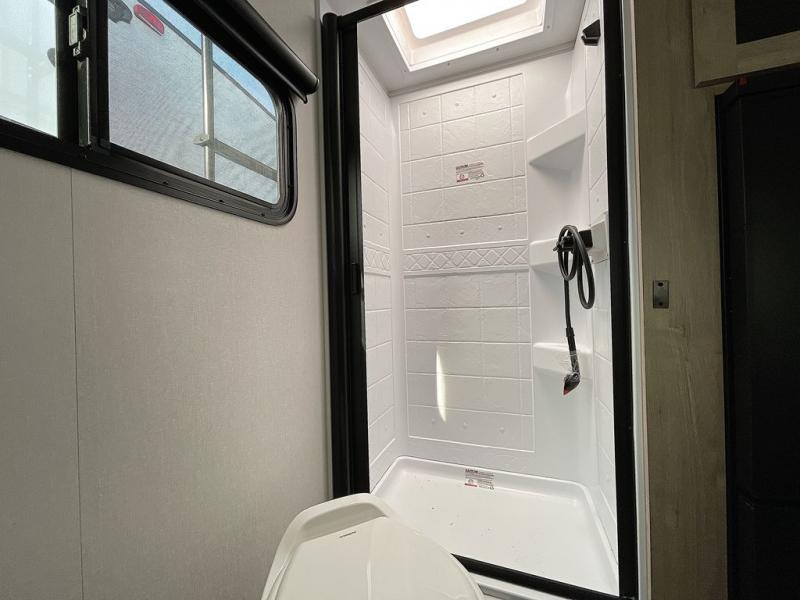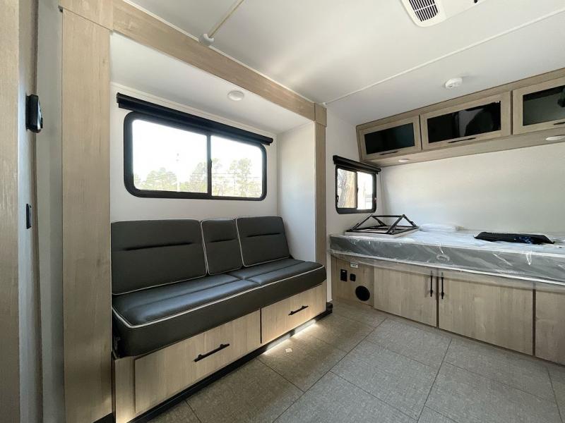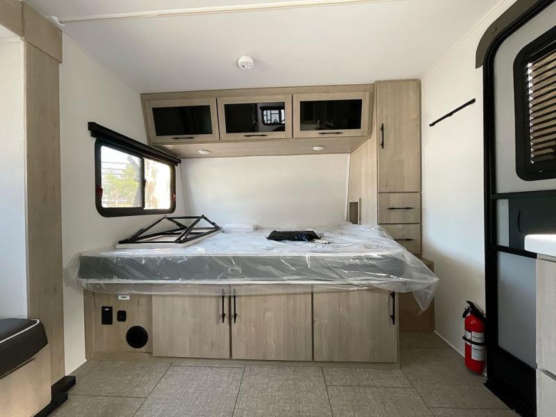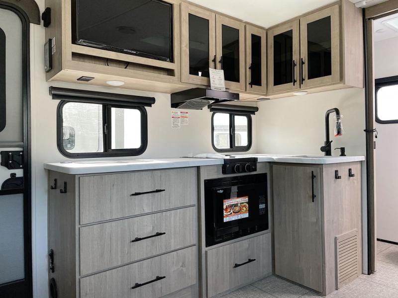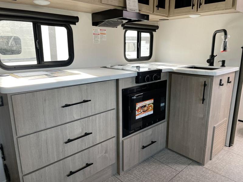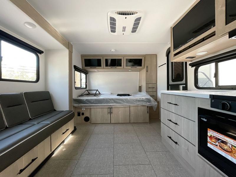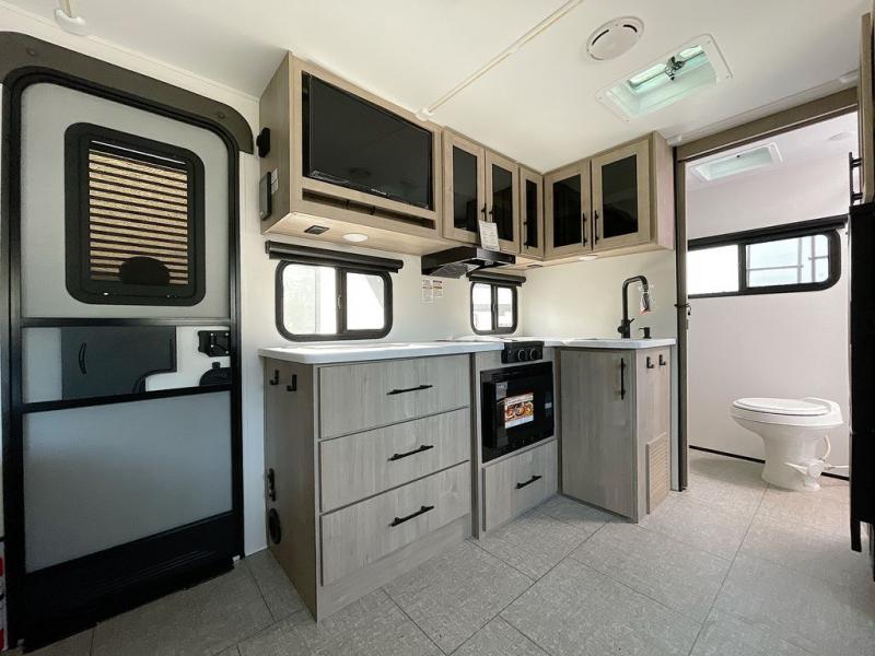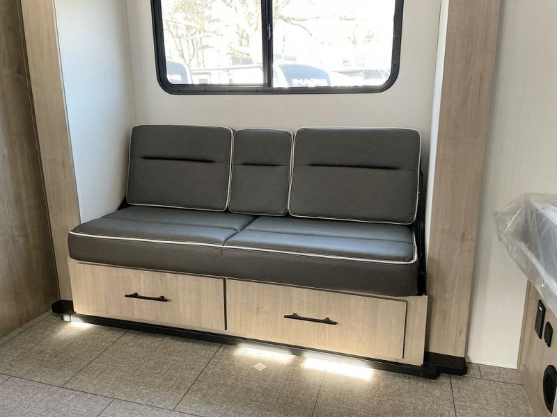 Pack your bags and head out on a fun camping trip in this travel trailer! The front queen bed offers a comfortable place to sleep at night, as well as the roll-over sleeper sofa slide with drawers for storage. You can hang your jacket up on one of the coat hooks when you enter, and then start preparing a delicious meal on the two burner cooktop. You even have an outside griddle to fry up the catch of the day. The full rear bathroom has a walk-in shower with skylight to freshen up in and overhead cabinets for your toiletries!