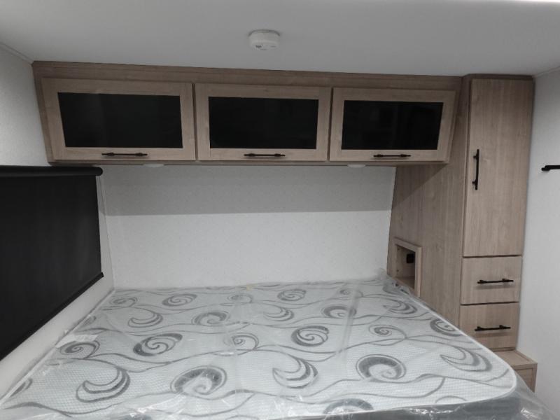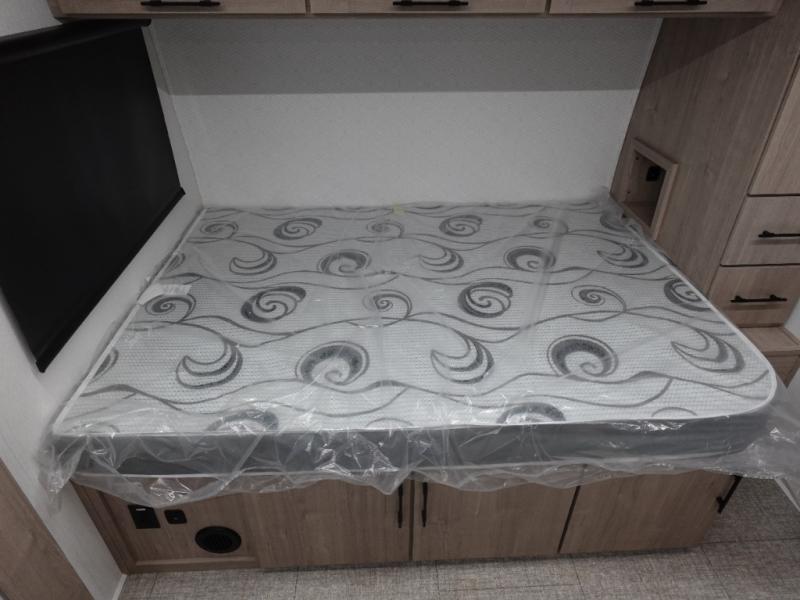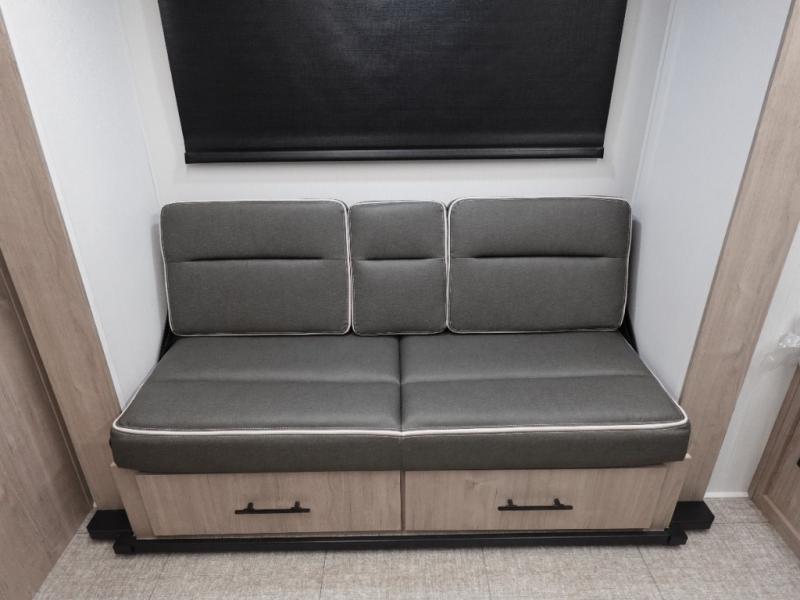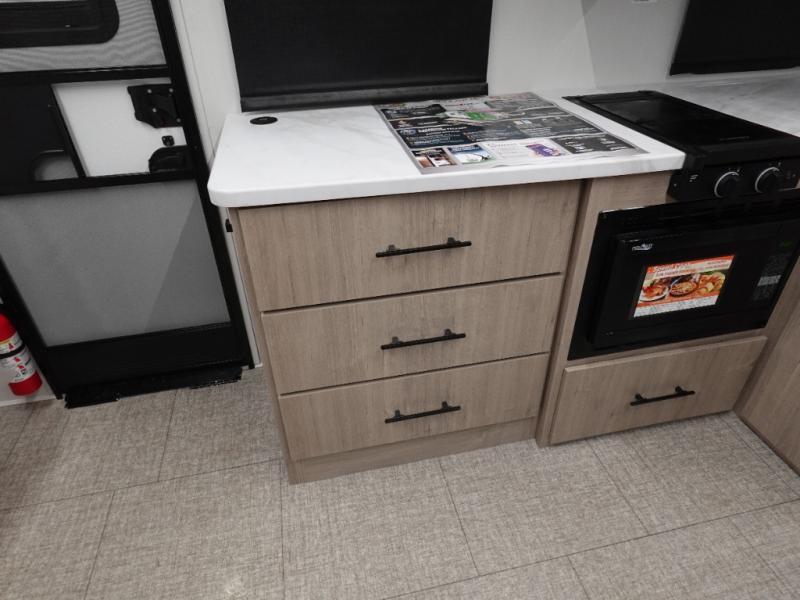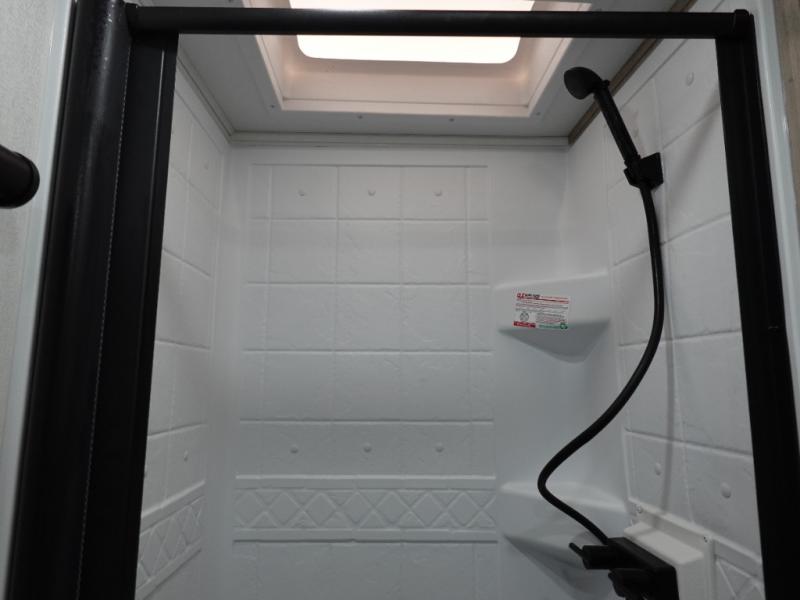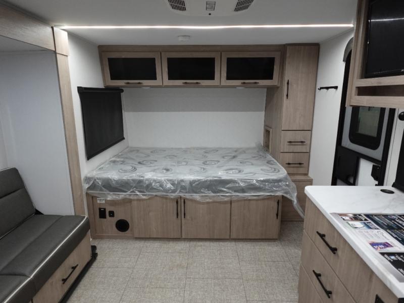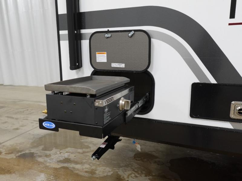 Pack your bags and head out on a fun camping trip in this travel trailer! The front queen bed offers a comfortable place to sleep at night, as well as the roll-over sleeper sofa slide with drawers for storage. You can hang your jacket up on one of the coat hooks when you enter, and then start preparing a delicious meal on the two burner cooktop. You even have an outside griddle to fry up the catch of the day. The full rear bathroom has a walk-in shower with skylight to freshen up in and overhead cabinets for your toiletries!