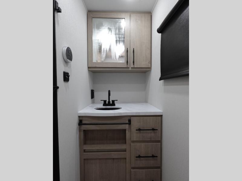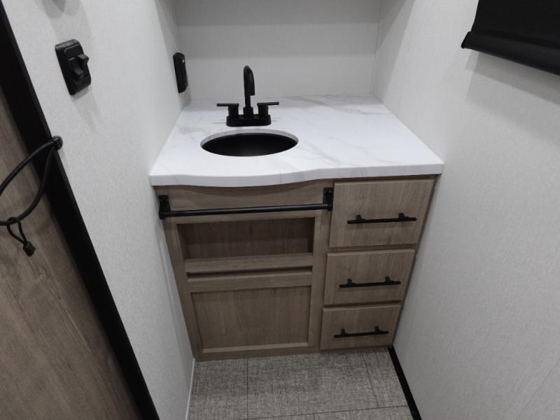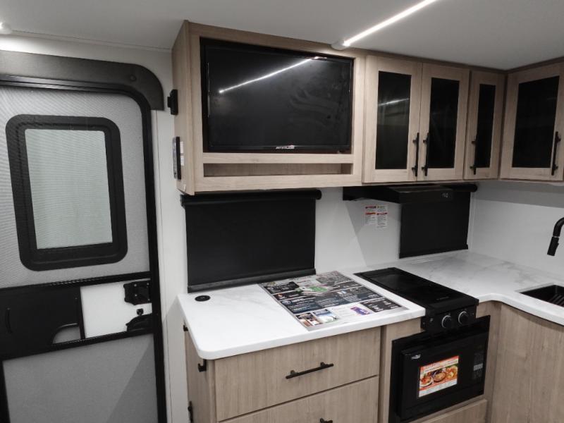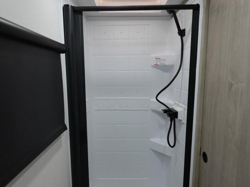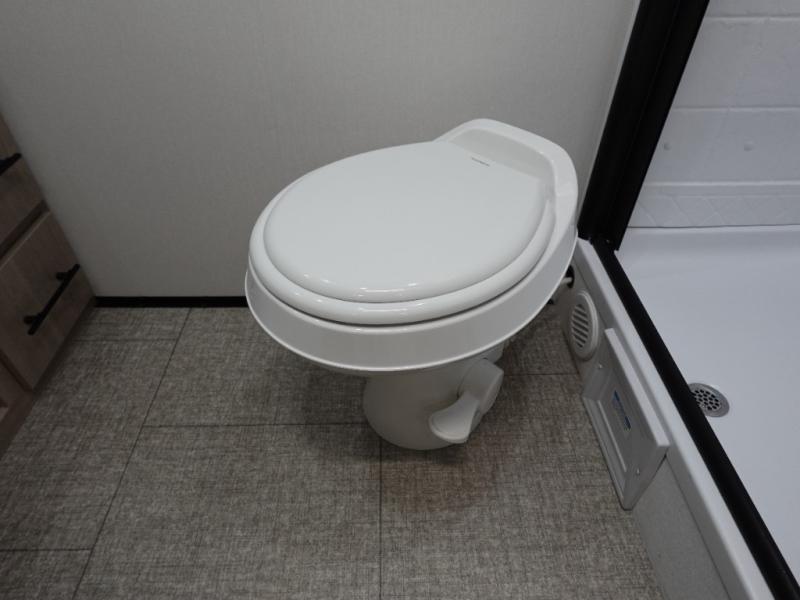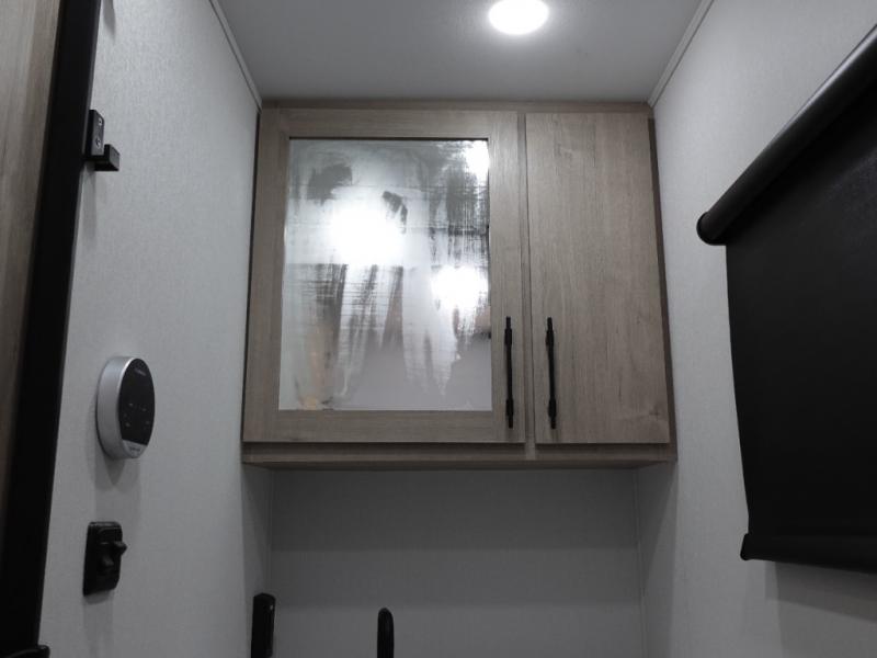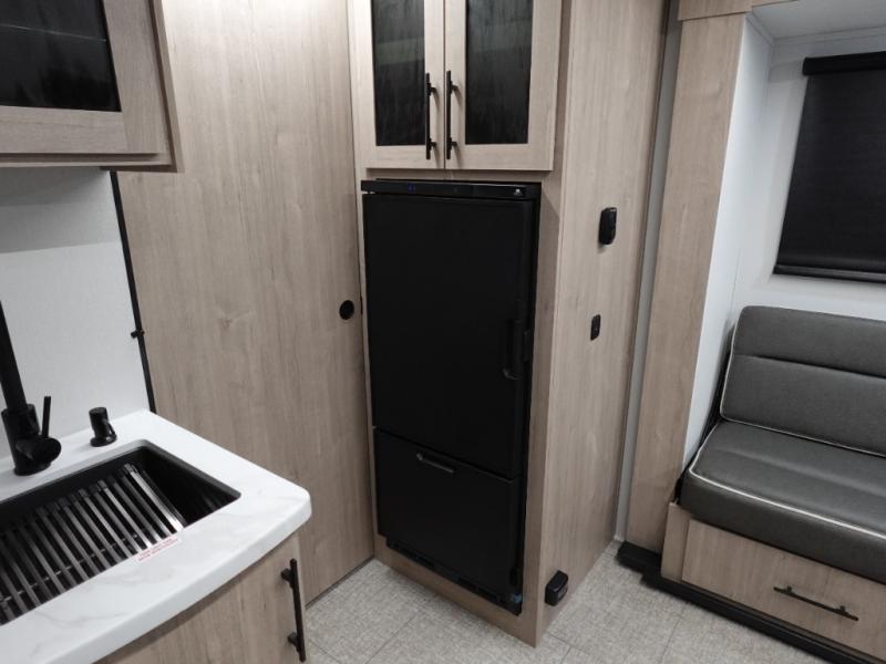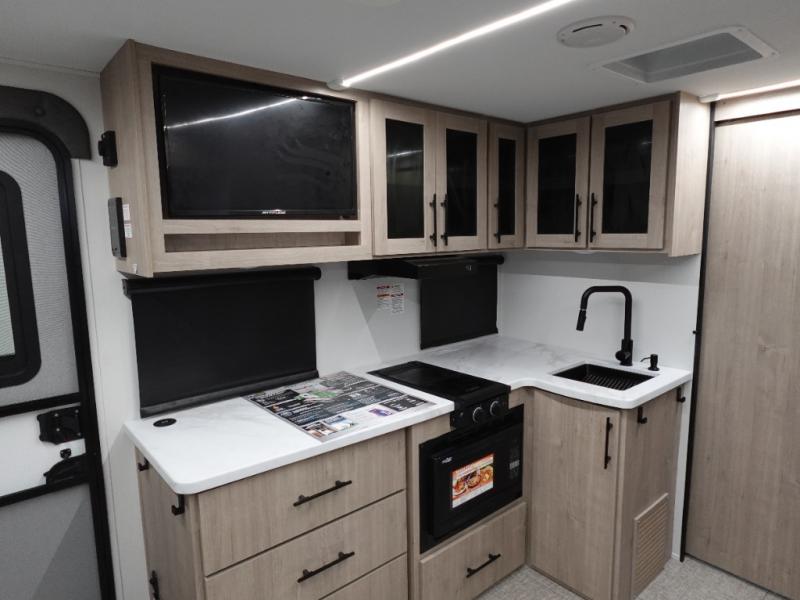 Pack your bags and head out on a fun camping trip in this travel trailer! The front queen bed offers a comfortable place to sleep at night, as well as the roll-over sleeper sofa slide with drawers for storage. You can hang your jacket up on one of the coat hooks when you enter, and then start preparing a delicious meal on the two burner cooktop. You even have an outside griddle to fry up the catch of the day. The full rear bathroom has a walk-in shower with skylight to freshen up in and overhead cabinets for your toiletries!