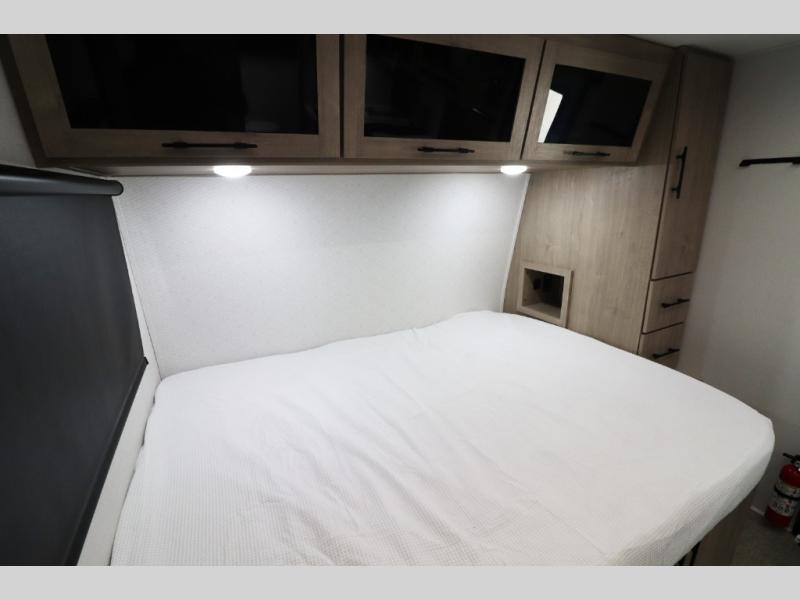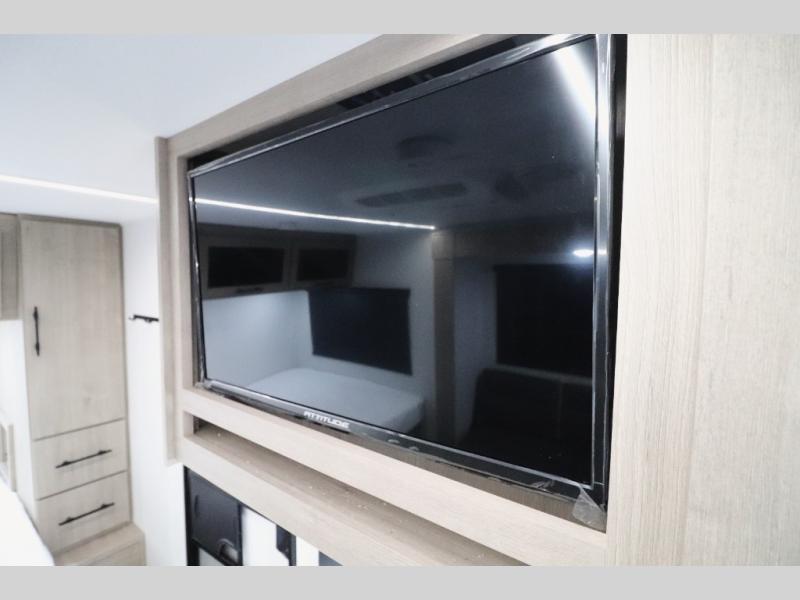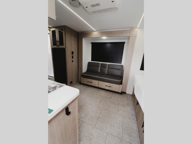 The Imagine AIM 16ML boasts a modern and aerodynamic design with Grand Design’s signature fiberglass exterior. Its compact frame, sleek graphics, and functional design ensure both aesthetic appeal and durability. The power awning with integrated LED lights provides ample outdoor living space, perfect for relaxing under the stars.