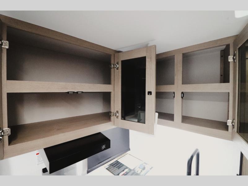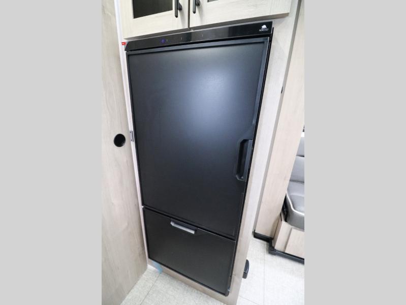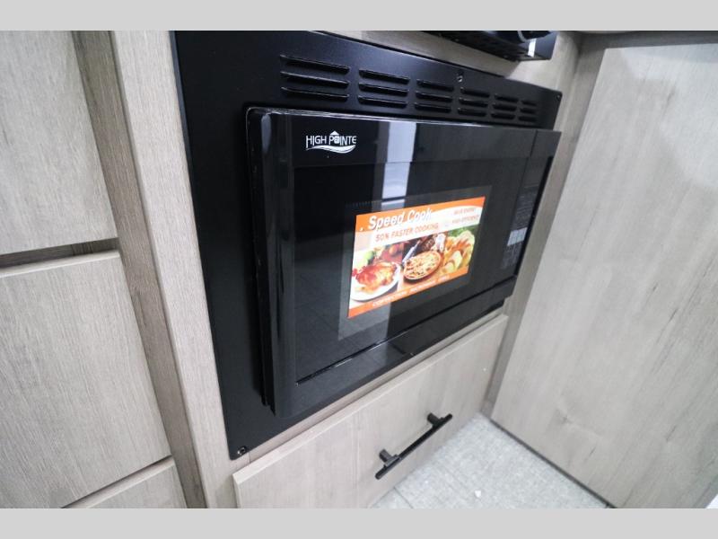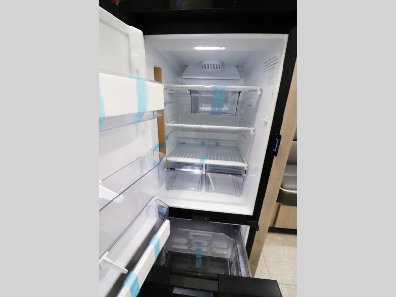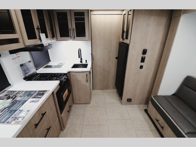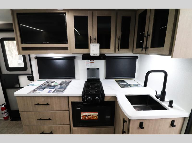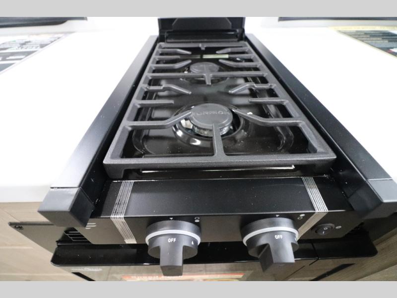 - Gourmet Kitchen: Fully equipped with a two-burner cooktop, convection microwave, and a 6.2 cu. ft. 12V refrigerator.