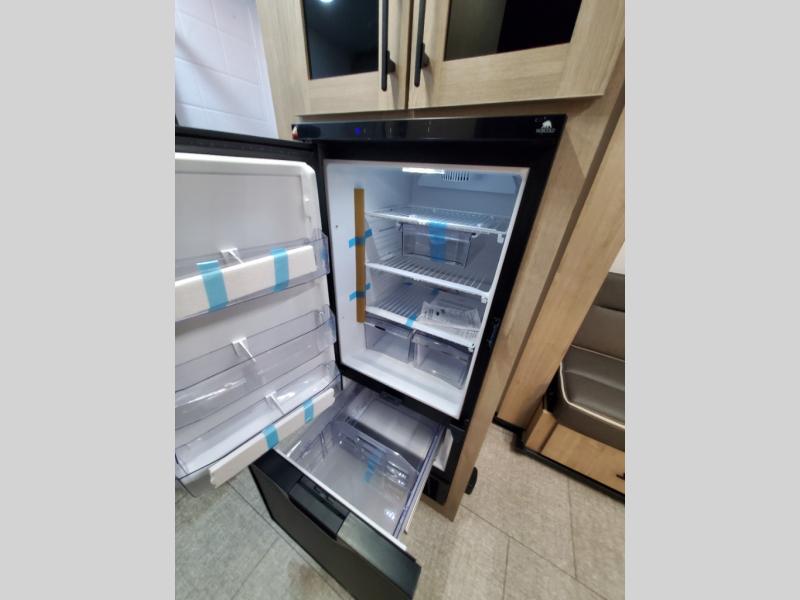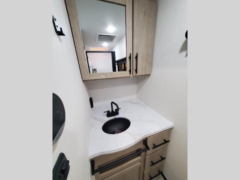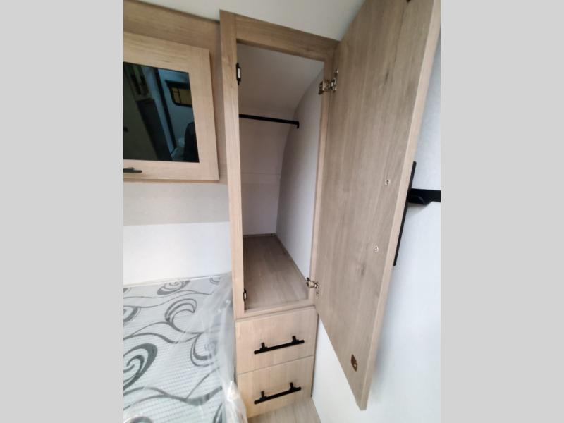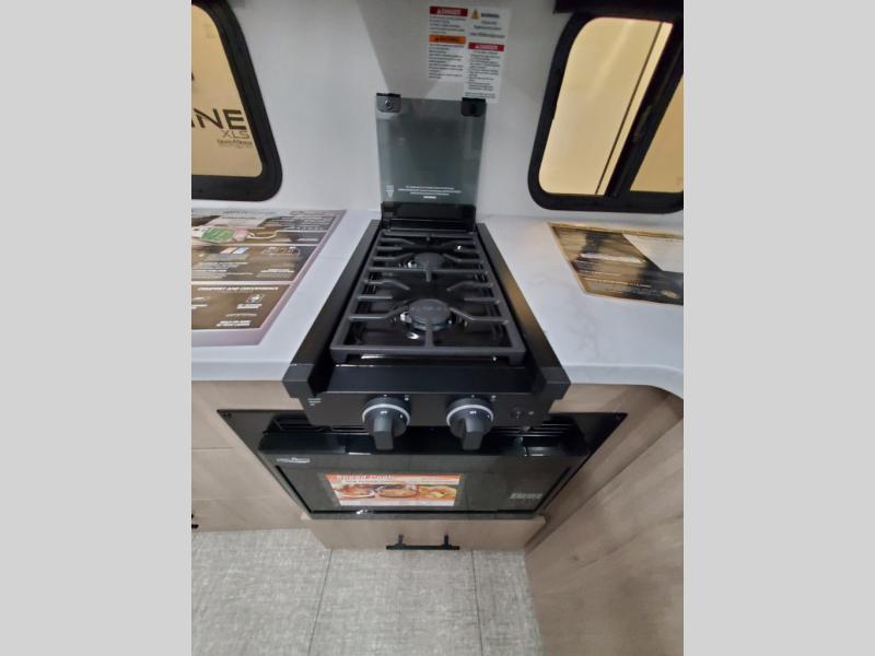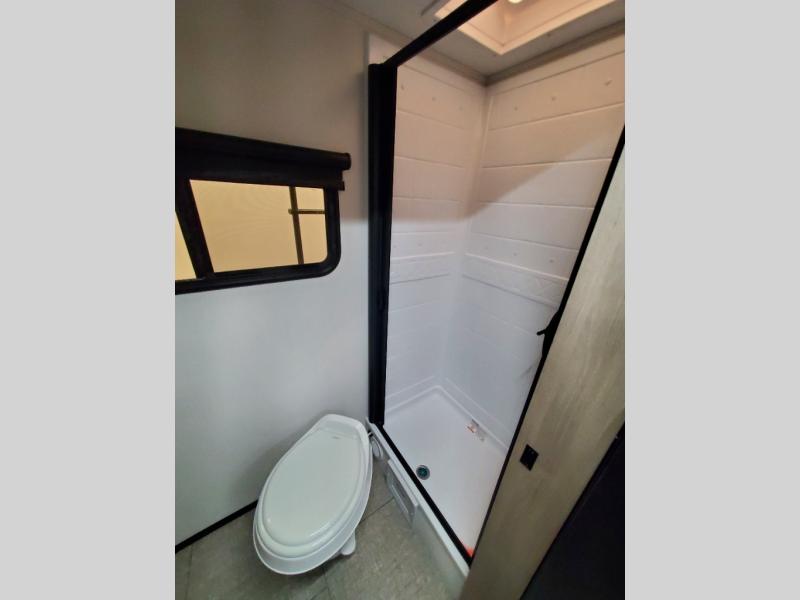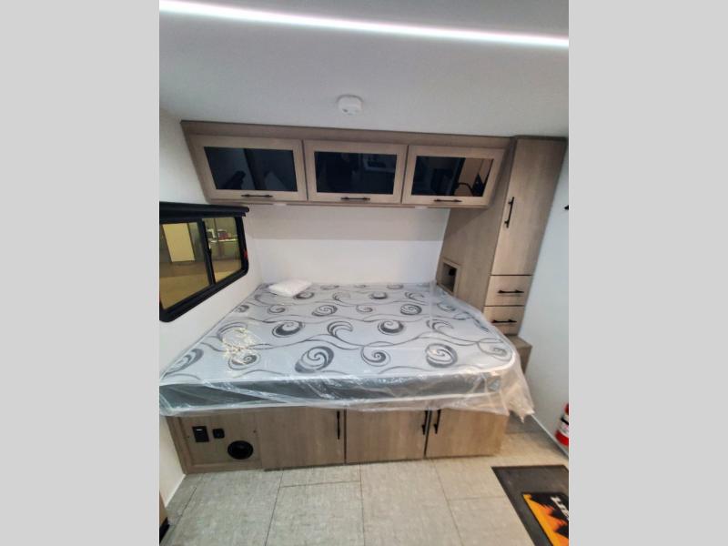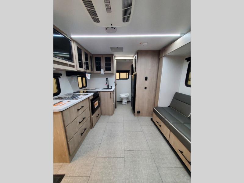Pack your bags and head out on a fun camping trip in this travel trailer! The front queen bed offers a comfortable place to sleep at night, as well as the roll-over sleeper sofa slide with drawers for storage. You can hang your jacket up on one of the coat hooks when you enter, and then start preparing a delicious meal on the two burner cooktop. You even have an outside griddle to fry up the catch of the day. The full rear bathroom has a walk-in shower with skylight to freshen up in and overhead cabinets for your toiletries!