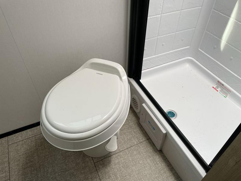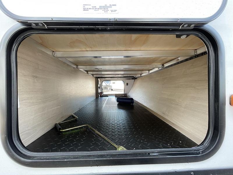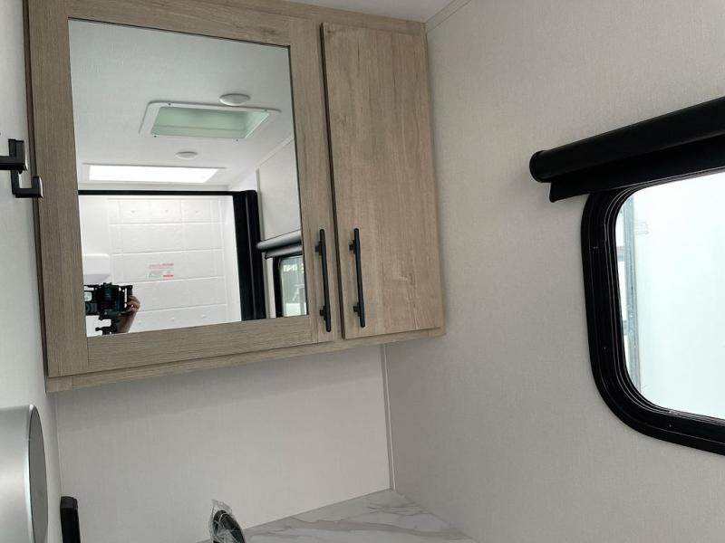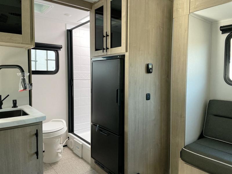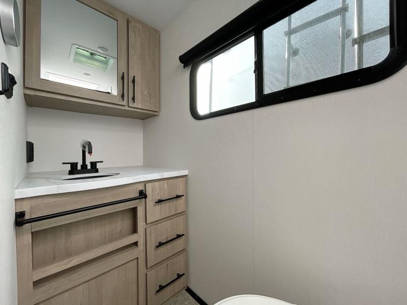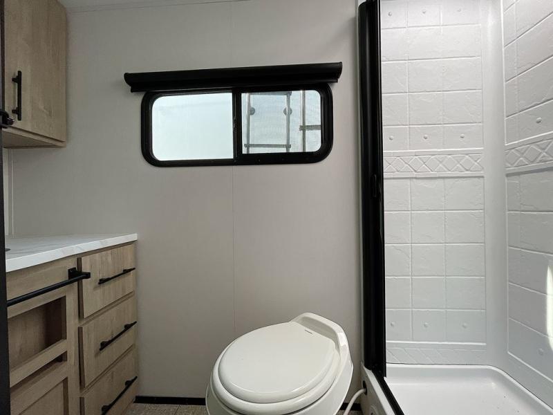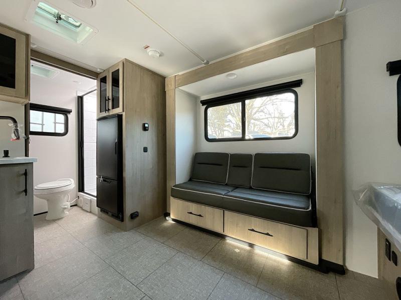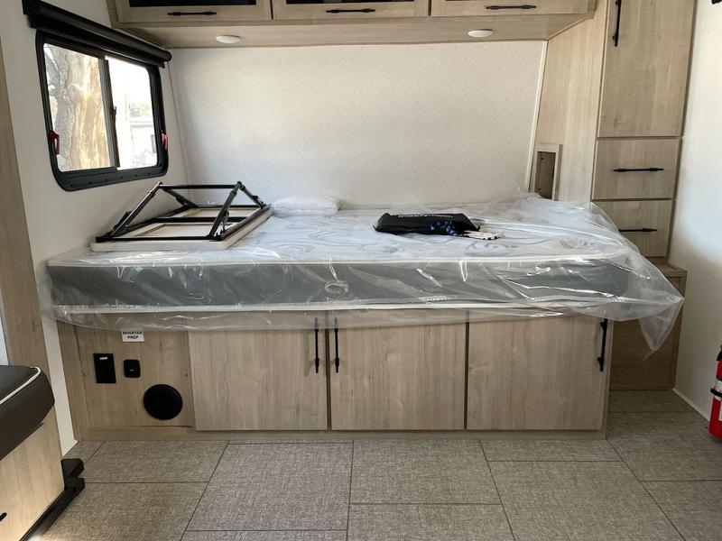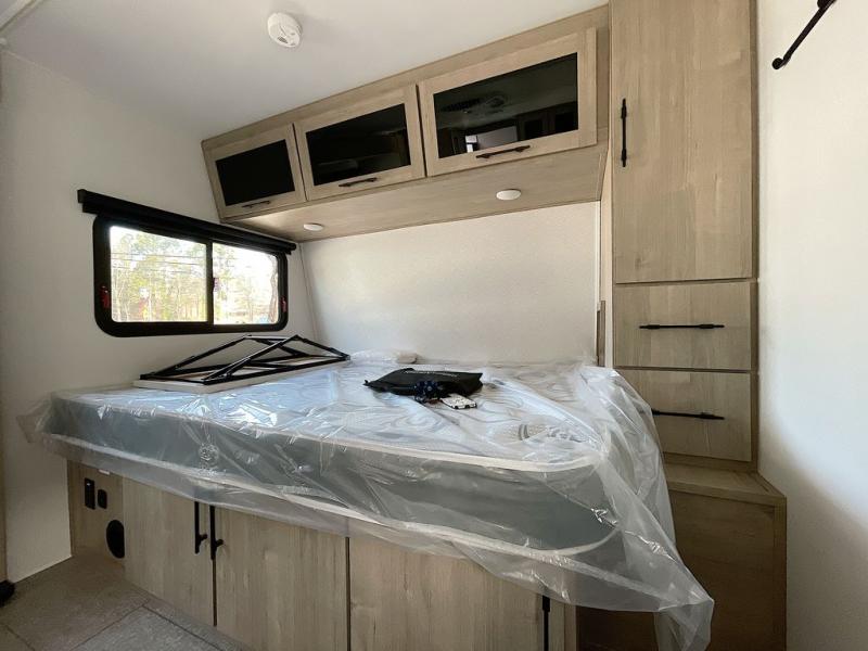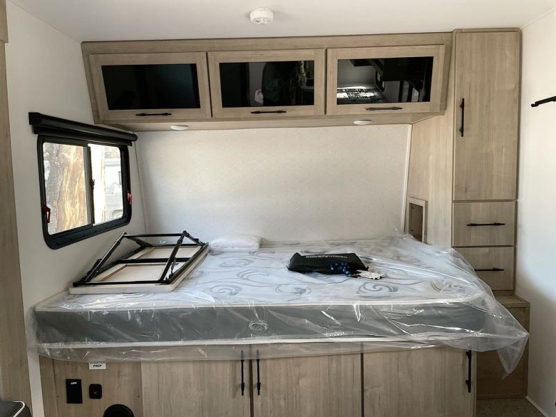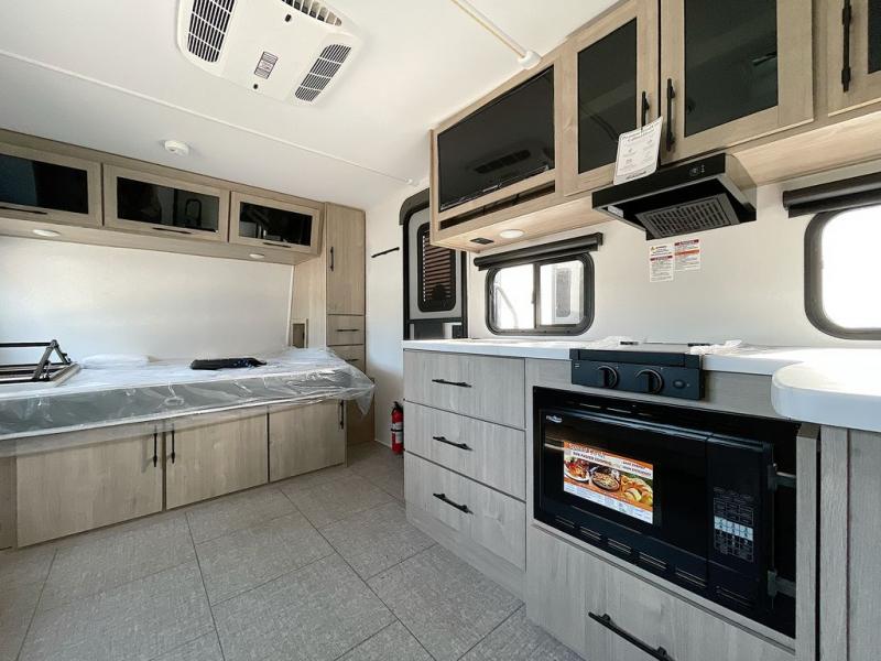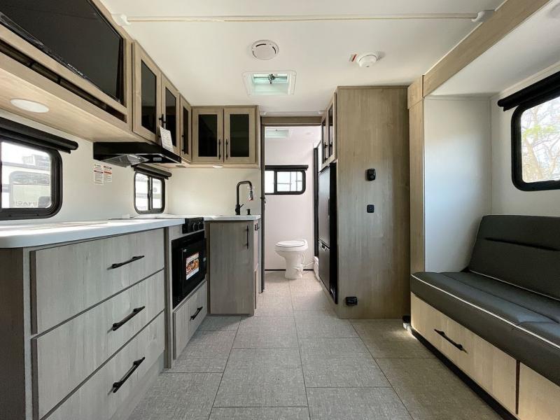 Pack your bags and head out on a fun camping trip in this travel trailer! The front queen bed offers a comfortable place to sleep at night, as well as the roll-over sleeper sofa slide with drawers for storage. You can hang your jacket up on one of the coat hooks when you enter, and then start preparing a delicious meal on the two burner cooktop. You even have an outside griddle to fry up the catch of the day. The full rear bathroom has a walk-in shower with skylight to freshen up in and overhead cabinets for your toiletries!