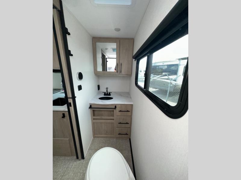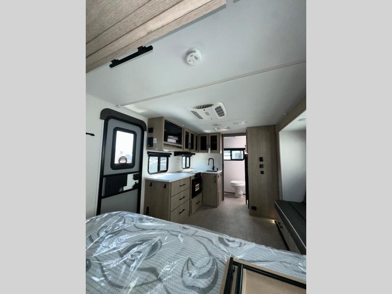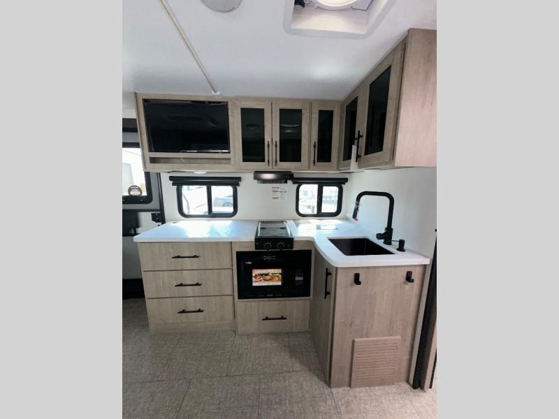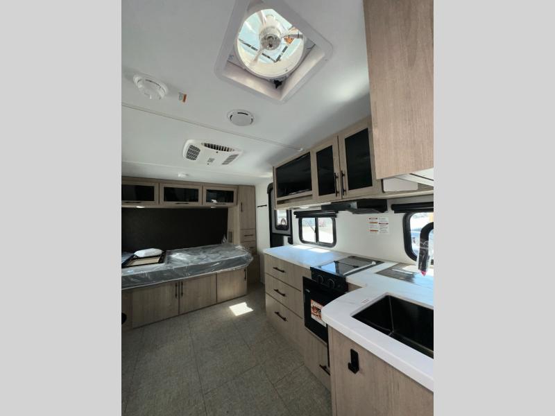 Pack your bags and head out on a fun camping trip in this travel trailer! The front queen bed offers a comfortable place to sleep at night, as well as the roll-over sleeper sofa slide with drawers for storage. You can hang your jacket up on one of the coat hooks when you enter, and then start preparing a delicious meal on the two burner cooktop. You even have an outside griddle to fry up the catch of the day. The full rear bathroom has a walk-in shower with skylight to freshen up in and overhead cabinets for your toiletries!