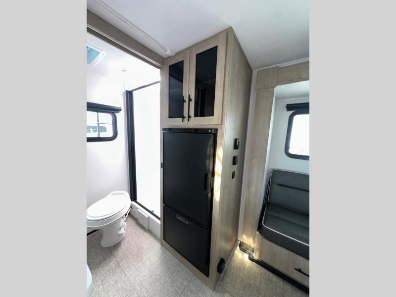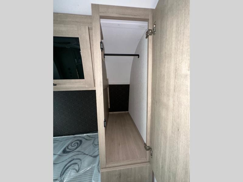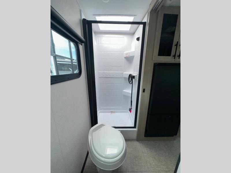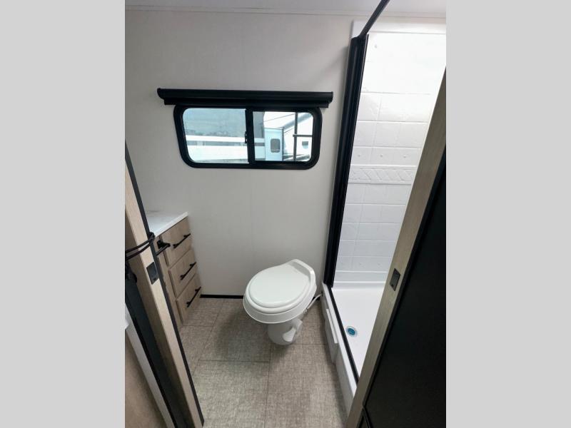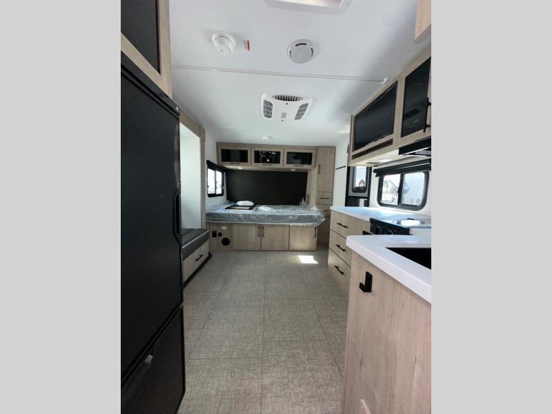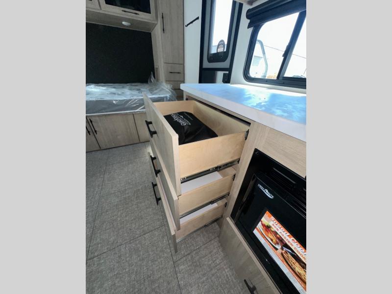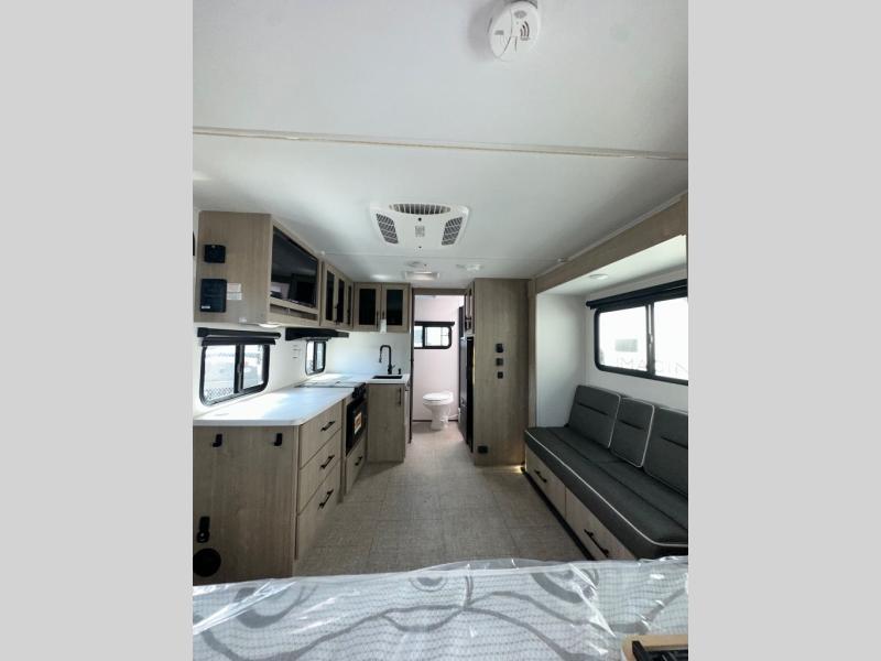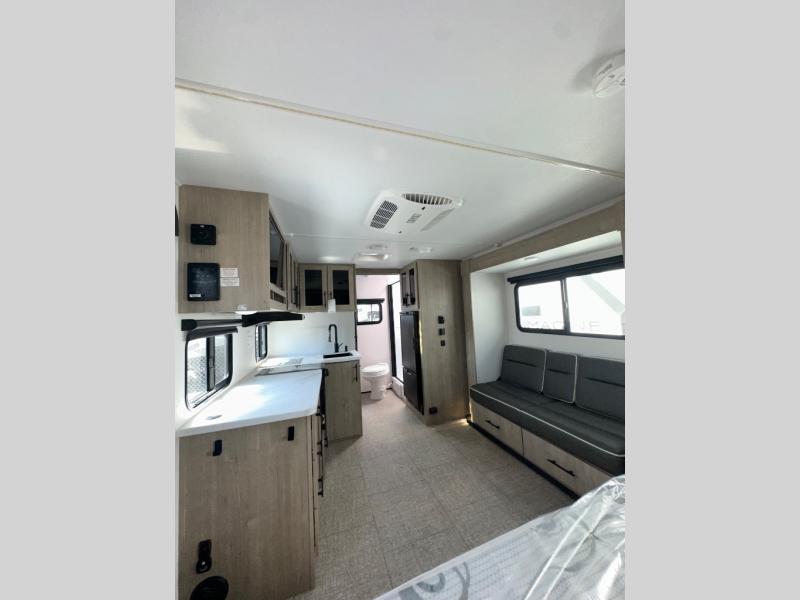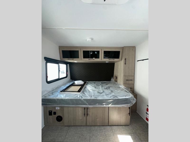 Pack your bags and head out on a fun camping trip in this travel trailer! The front queen bed offers a comfortable place to sleep at night, as well as the roll-over sleeper sofa slide with drawers for storage. You can hang your jacket up on one of the coat hooks when you enter, and then start preparing a delicious meal on the two burner cooktop. You even have an outside griddle to fry up the catch of the day. The full rear bathroom has a walk-in shower with skylight to freshen up in and overhead cabinets for your toiletries!