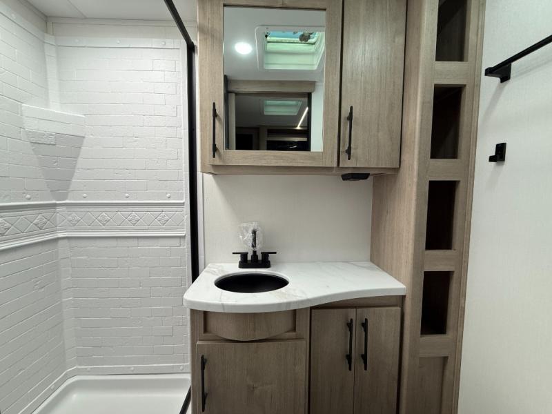 - Full Rear Bathroom – Residential walk-in shower, skylight, linen closet, and power vent fan.