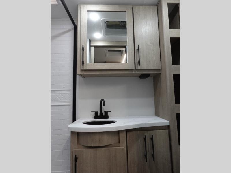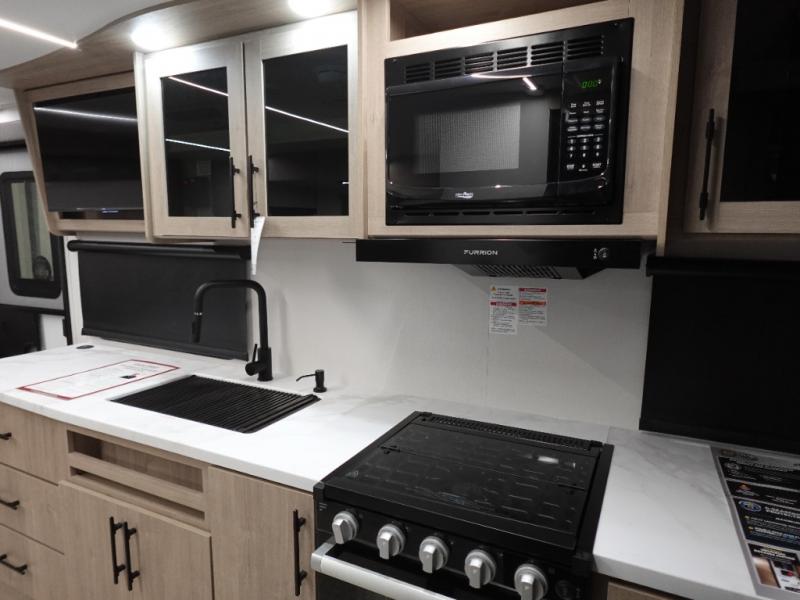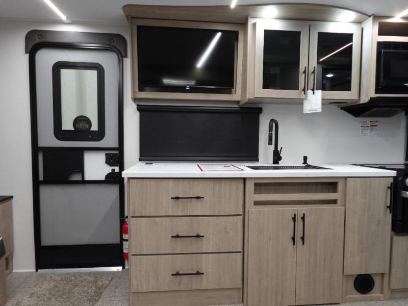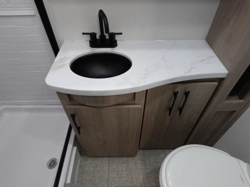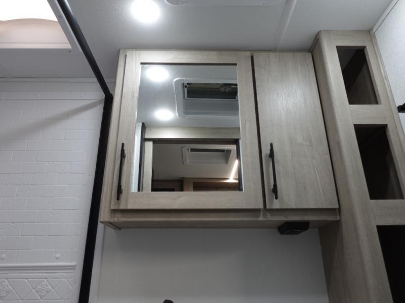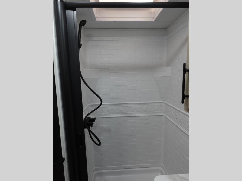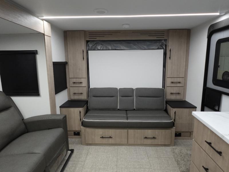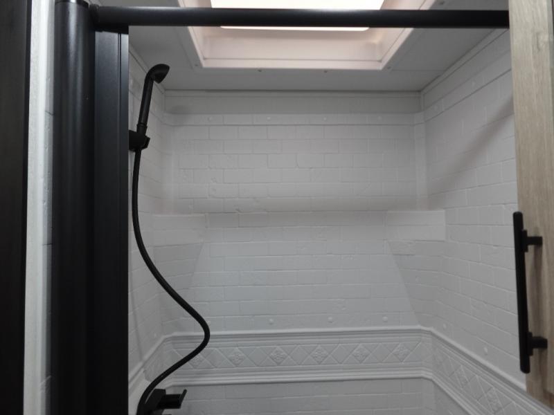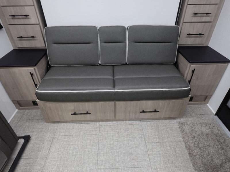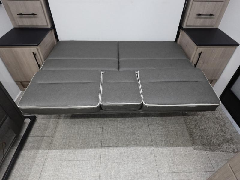 The Murphy bed is the eye-catching feature on this Imagine XLS travel trailer! Not only can it fold away in the morning to reveal a sofa for lounging, but it will also provide you with drawer storage under the sofa. Another functional feature is the theater dinette with a removable table in front or you can choose the optional U-shaped dinette if you like to gather around for game night. It rests on the single slide so that there is more floor space, and it offers you great comfort while you dine across from the LED HDTV. A full bathroom will keep you clean and fresh with its residential walk-in shower, skylight, linen closet, vanity, toilet, and power vent fan.