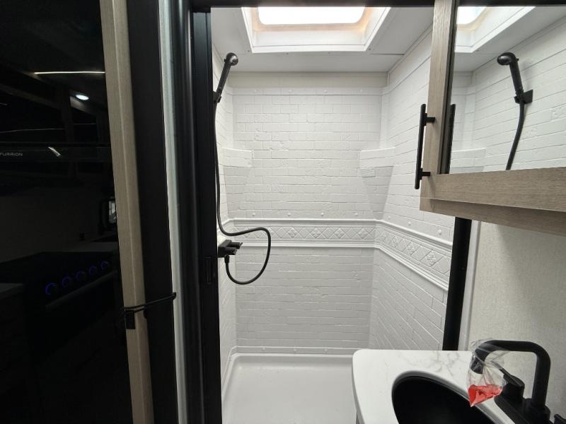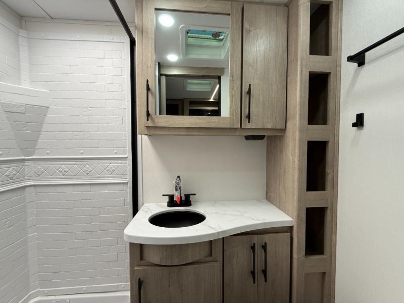 - Full Rear Bathroom – Residential walk-in shower, skylight, linen closet, and power vent fan.