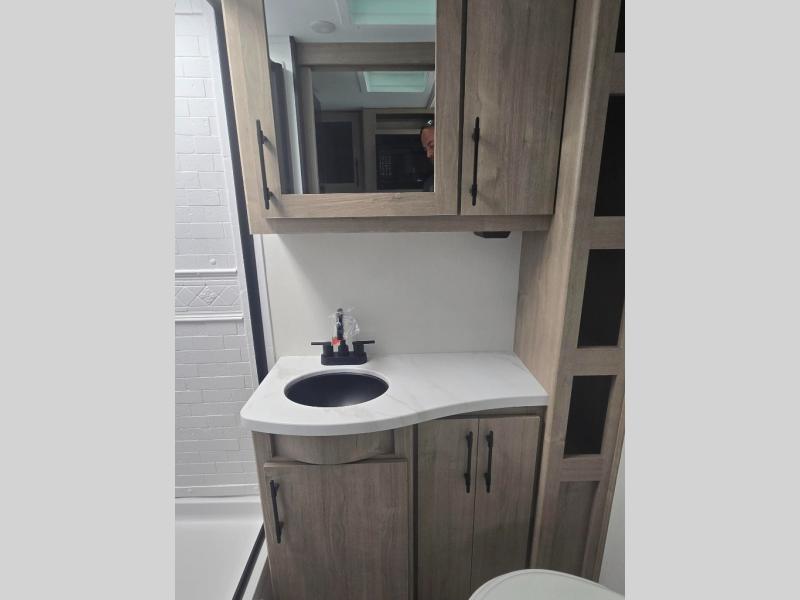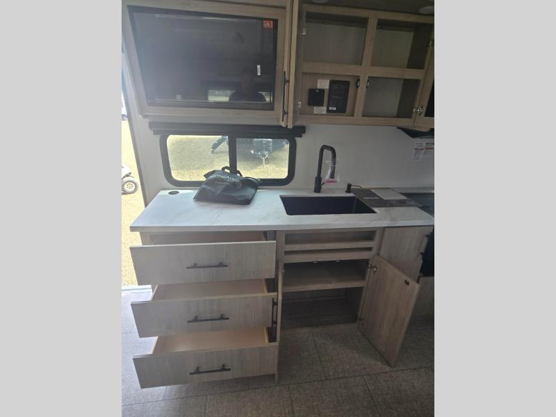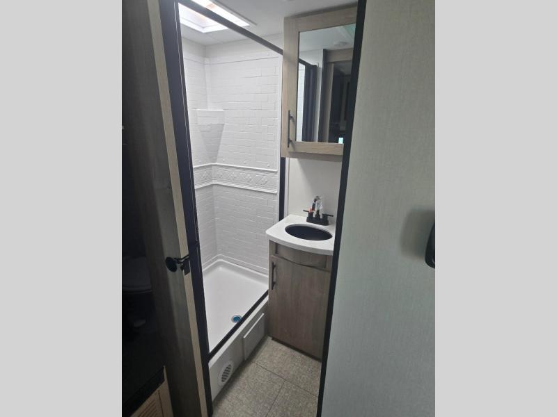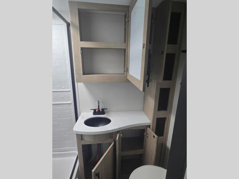 The Murphy bed is the eye-catching feature on this Imagine XLS travel trailer! Not only can it fold away in the morning to reveal a sofa for lounging, but it will also provide you with drawer storage under the sofa. Another functional feature is the theater dinette with a removable table in front or you can choose the optional U-shaped dinette if you like to gather around for game night. It rests on the single slide so that there is more floor space, and it offers you great comfort while you dine across from the LED HDTV. A full bathroom will keep you clean and fresh with its residential walk-in shower, skylight, linen closet, vanity, toilet, and power vent fan.