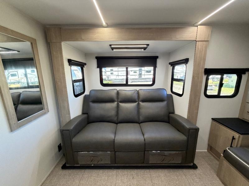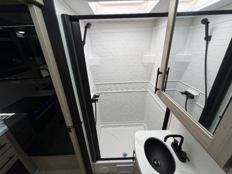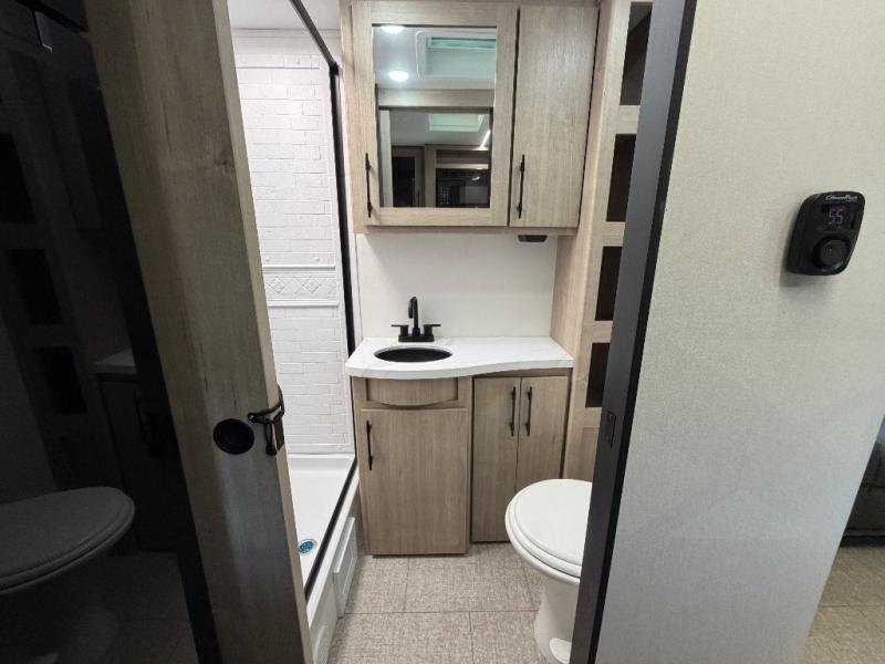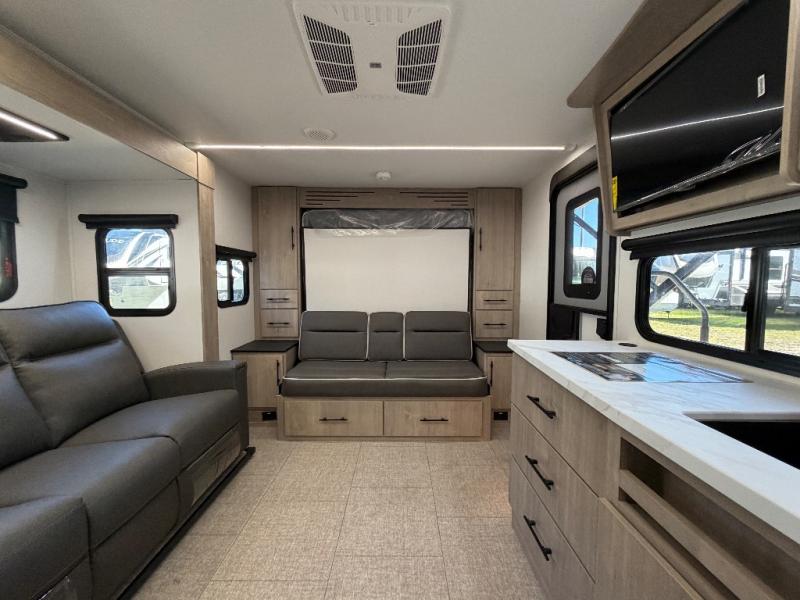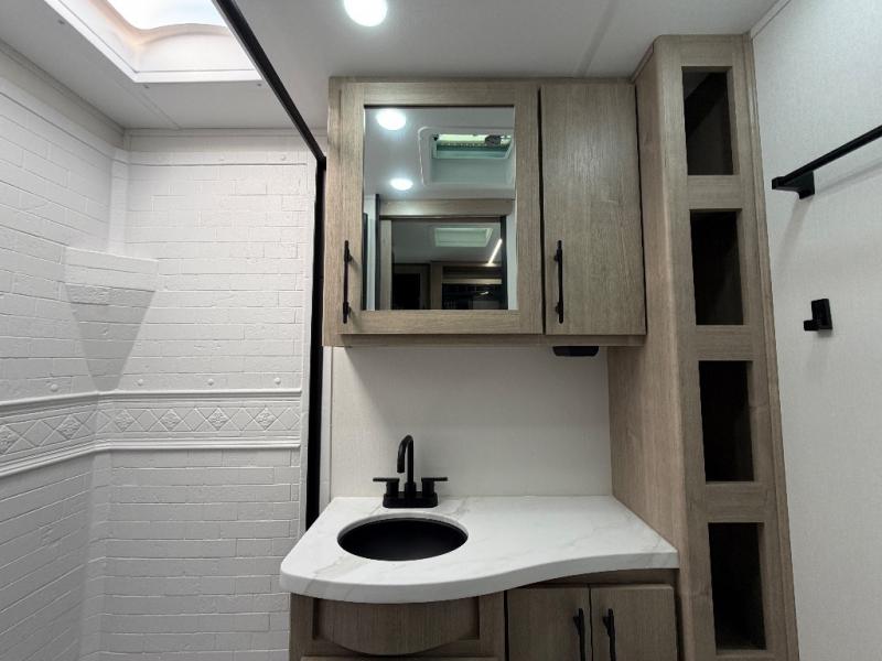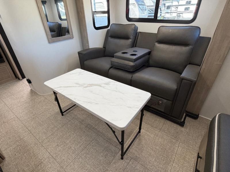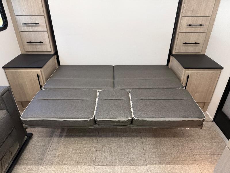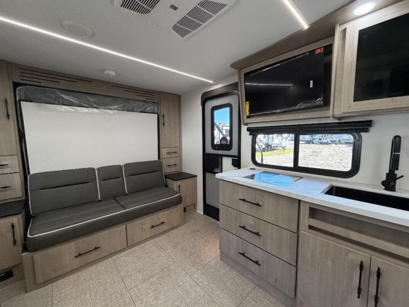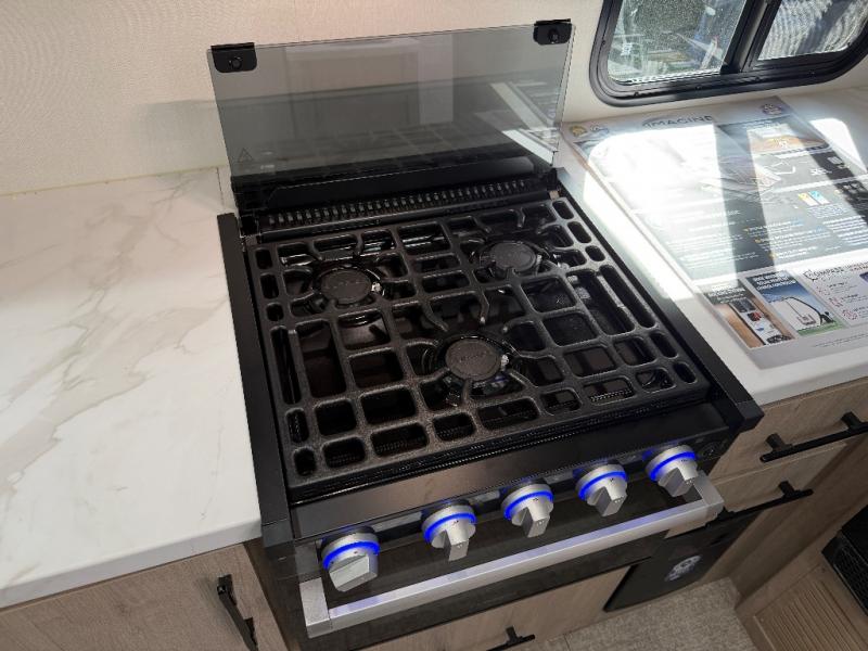 The Murphy bed is the eye-catching feature on this Imagine XLS travel trailer! Not only can it fold away in the morning to reveal a sofa for lounging, but it will also provide you with drawer storage under the sofa. Another functional feature is the theater dinette with a removable table in front or you can choose the optional U-shaped dinette if you like to gather around for game night. It rests on the single slide so that there is more floor space, and it offers you great comfort while you dine across from the LED HDTV. A full bathroom will keep you clean and fresh with its residential walk-in shower, skylight, linen closet, vanity, toilet, and power vent fan.
