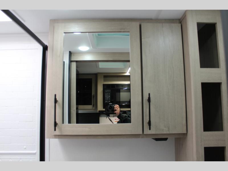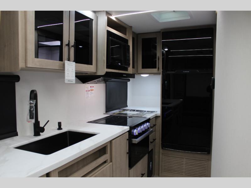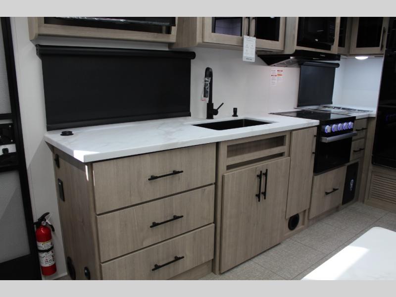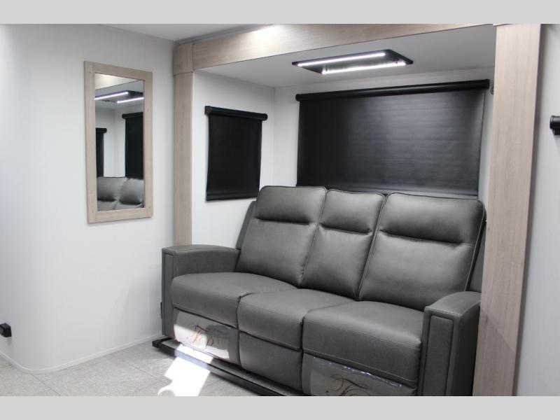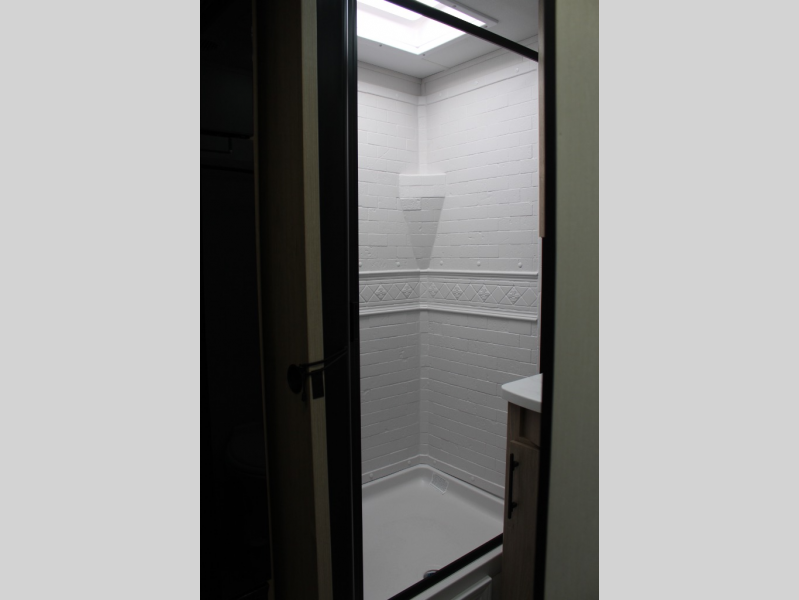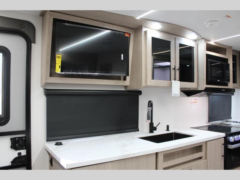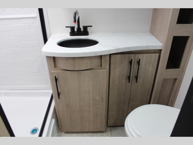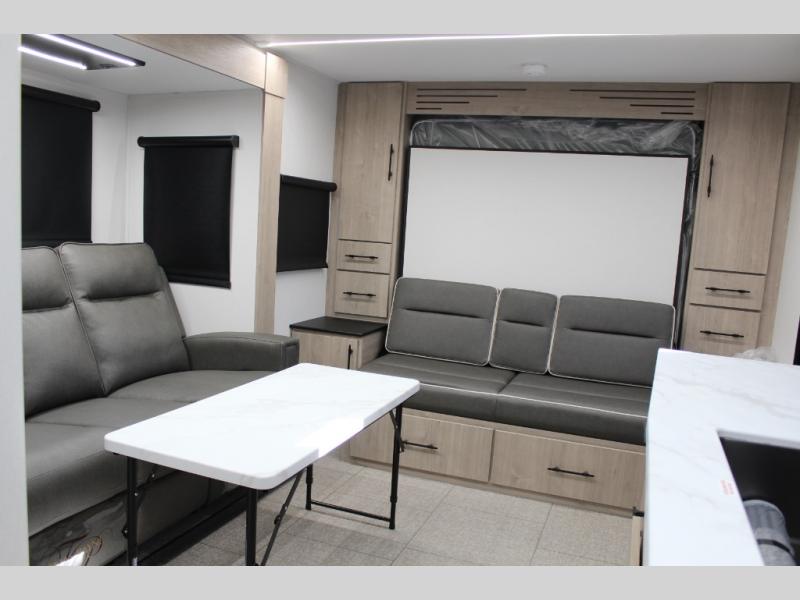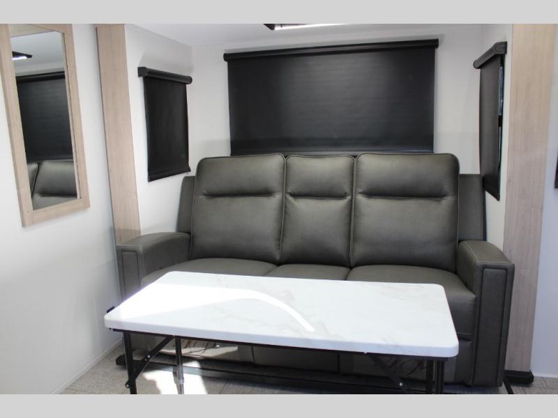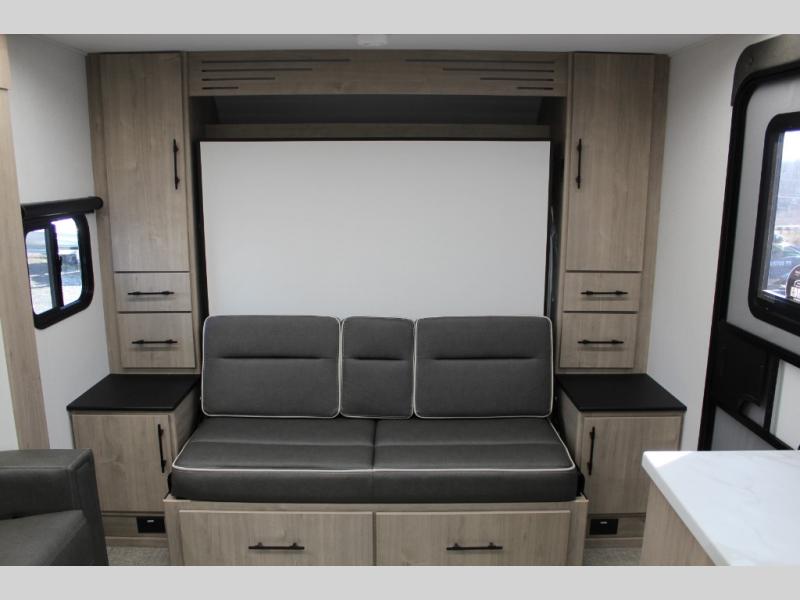 The Murphy bed is the eye-catching feature on this Imagine XLS travel trailer! Not only can it fold away in the morning to reveal a sofa for lounging, but it will also provide you with drawer storage under the sofa. Another functional feature is the theater dinette with a removable table in front or you can choose the optional U-shaped dinette if you like to gather around for game night. It rests on the single slide so that there is more floor space, and it offers you great comfort while you dine across from the LED HDTV. A full bathroom will keep you clean and fresh with its residential walk-in shower, skylight, linen closet, vanity, toilet, and power vent fan.