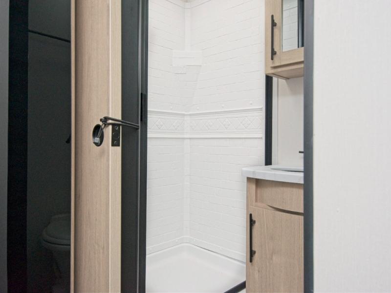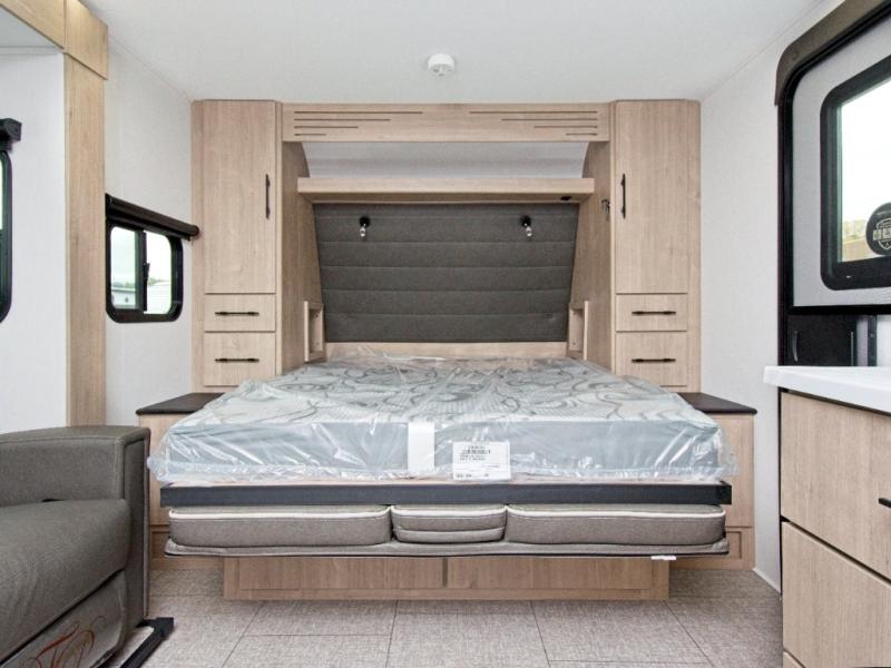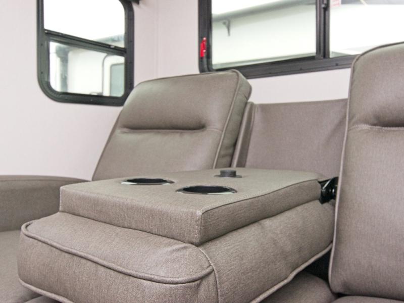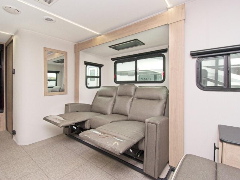 The standout feature of the Imagine XLS 17MKE is the Queen Murphy Bed. By day, it folds away to reveal a cozy sofa with drawer storage underneath, perfect for lounging. The Theater Dinette with a removable table offers flexibility for dining or game nights, and you can opt for a U-shaped dinette if you prefer. This dinette is situated on a single slide, providing extra floor space and comfort while you dine across from the LED HDTV. The full bathroom includes a residential walk-in shower, skylight, linen closet, vanity, toilet, and power vent fan to keep you fresh and clean.