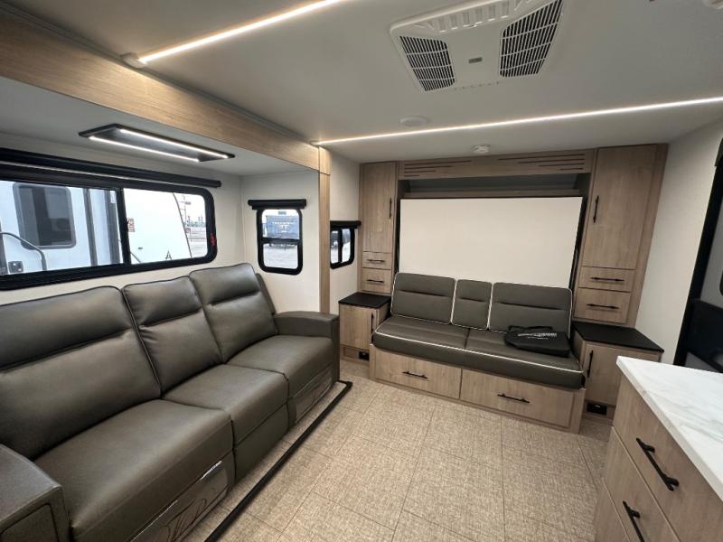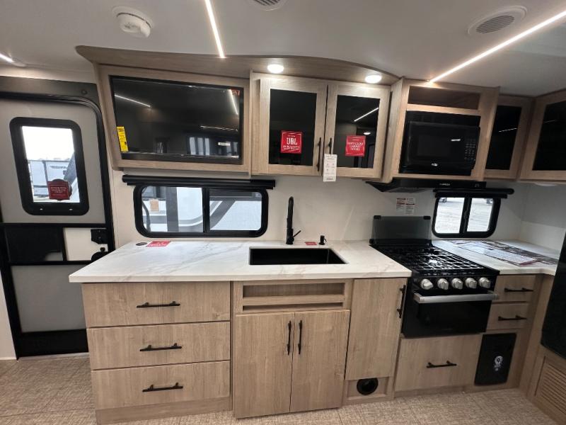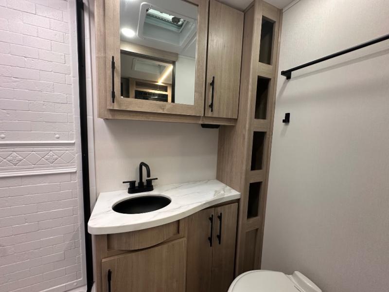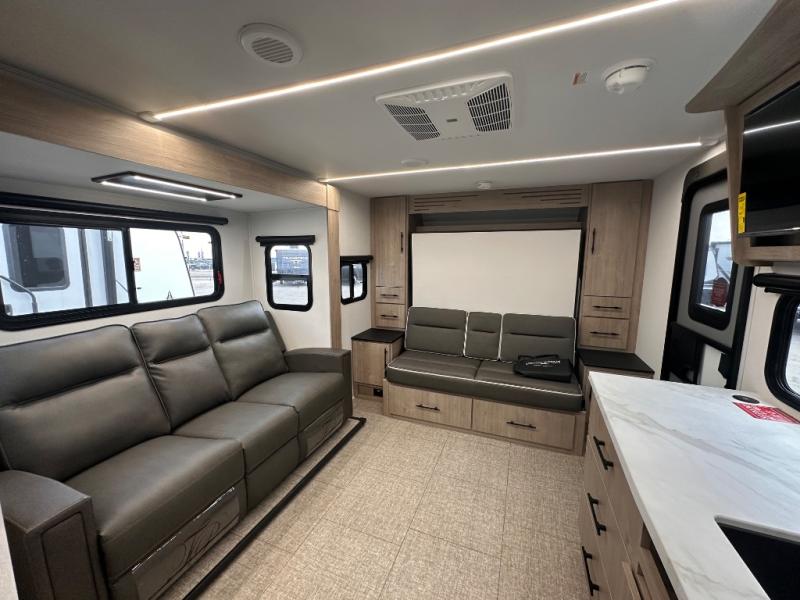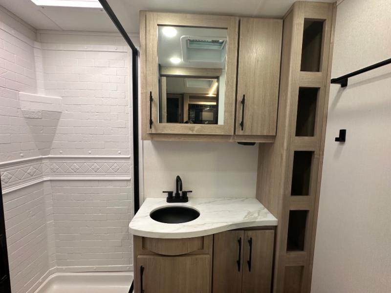 The Murphy bed is the eye-catching feature on this Imagine XLS travel trailer! Not only can it fold away in the morning to reveal a sofa for lounging, but it will also provide you with drawer storage under the sofa. Another functional feature is the theater dinette with a removable table in front or you can choose the optional U-shaped dinette if you like to gather around for game night. It rests on the single slide so that there is more floor space, and it offers you great comfort while you dine across from the LED HDTV. A full bathroom will keep you clean and fresh with its residential walk-in shower, skylight, linen closet, vanity, toilet, and power vent fan.
