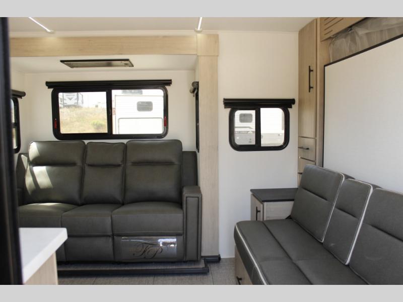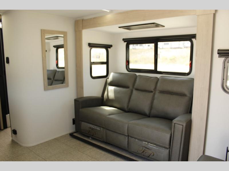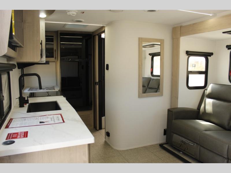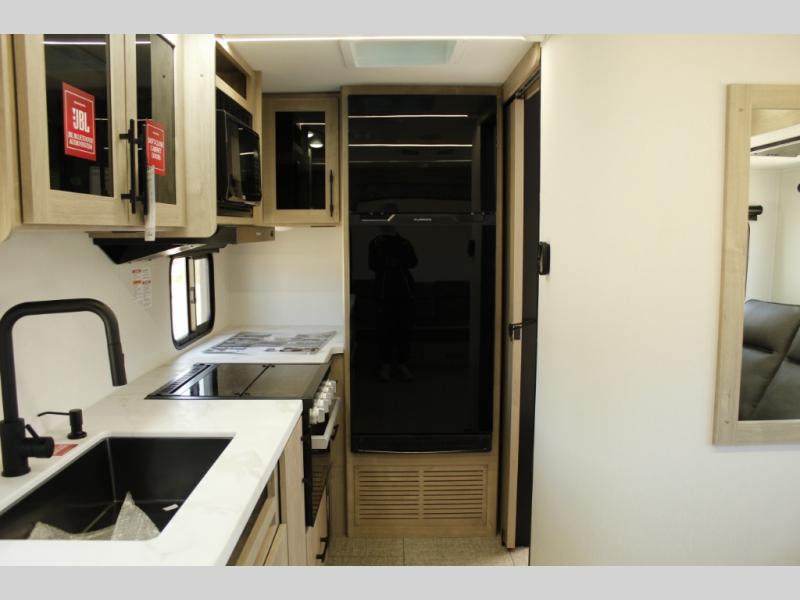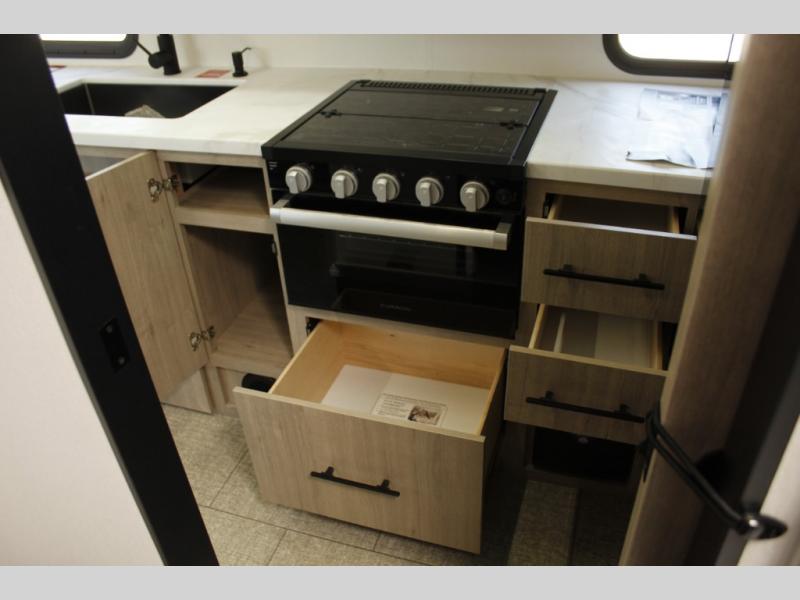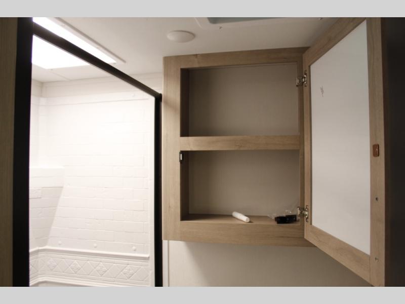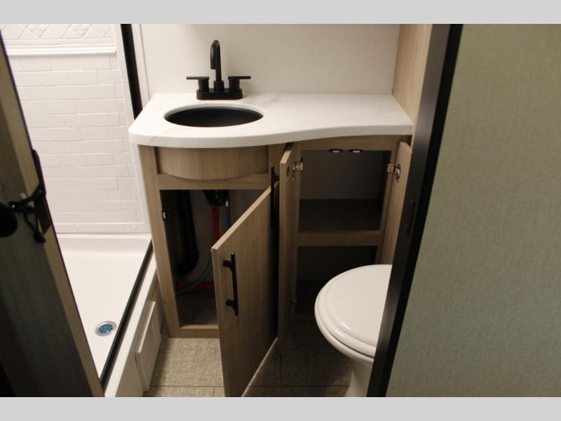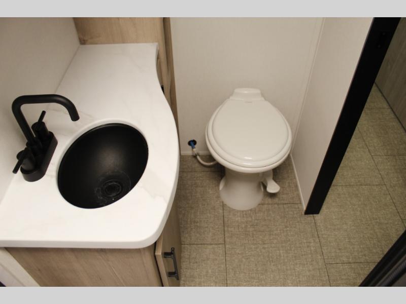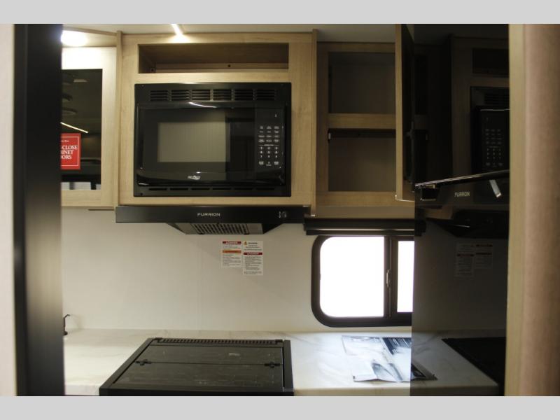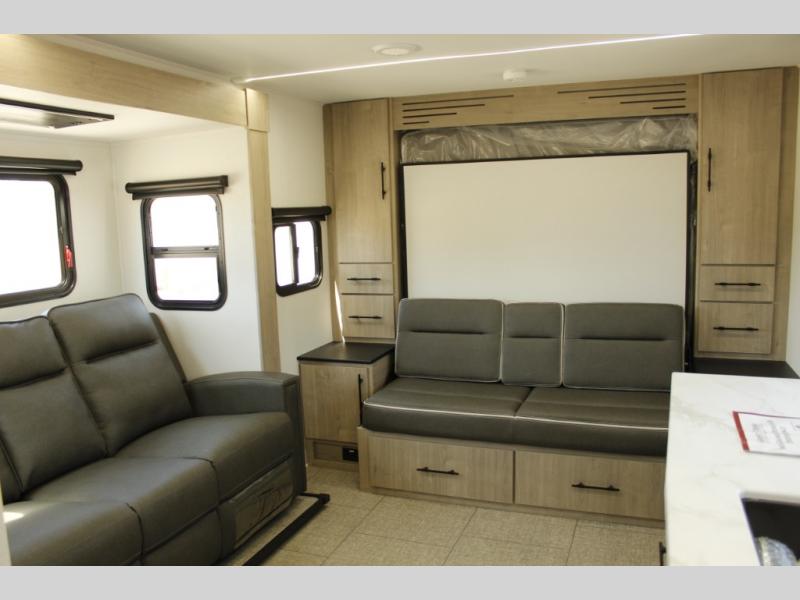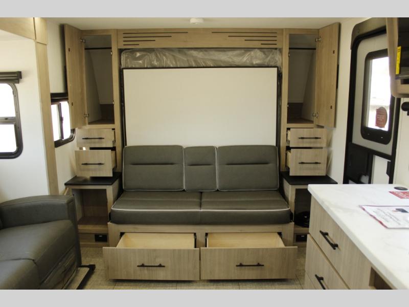 The Murphy bed is the eye-catching feature on this Imagine XLS travel trailer! Not only can it fold away in the morning to reveal a sofa for lounging, but it will also provide you with drawer storage under the sofa. Another functional feature is the theater dinette with a removable table in front or you can choose the optional U-shaped dinette if you like to gather around for game night. It rests on the single slide so that there is more floor space, and it offers you great comfort while you dine across from the LED HDTV. A full bathroom will keep you clean and fresh with its residential walk-in shower, skylight, linen closet, vanity, toilet, and power vent fan.