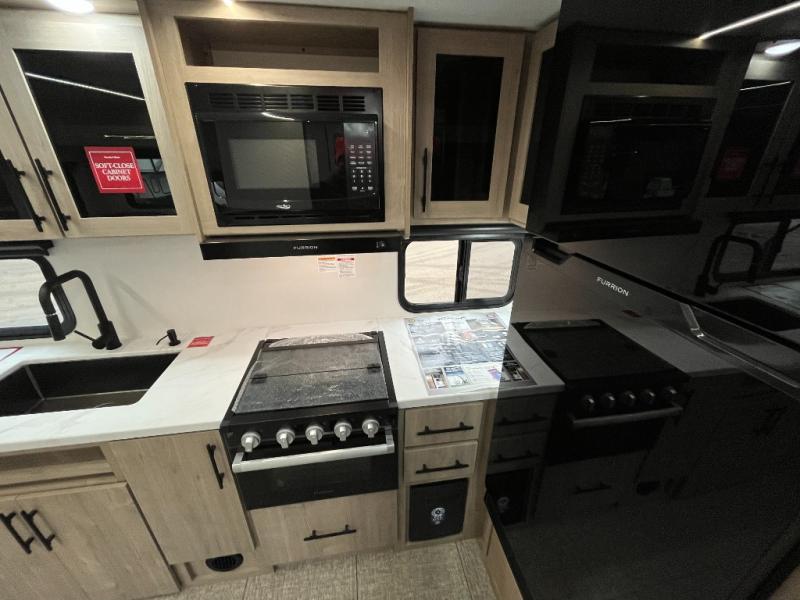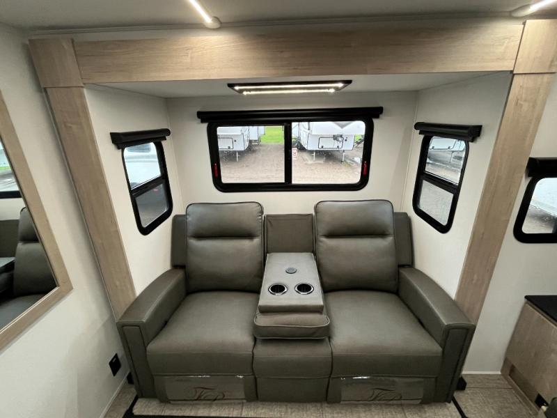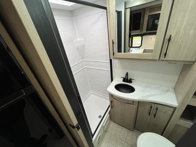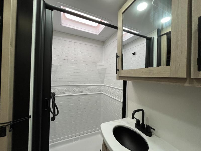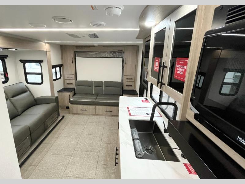 The Murphy bed is the eye-catching feature on this Imagine XLS travel trailer! Not only can it fold away in the morning to reveal a sofa for lounging, but it will also provide you with drawer storage under the sofa. Another functional feature is the theater dinette with a removable table in front or you can choose the optional U-shaped dinette if you like to gather around for game night. It rests on the single slide so that there is more floor space, and it offers you great comfort while you dine across from the LED HDTV. A full bathroom will keep you clean and fresh with its residential walk-in shower, skylight, linen closet, vanity, toilet, and power vent fan.