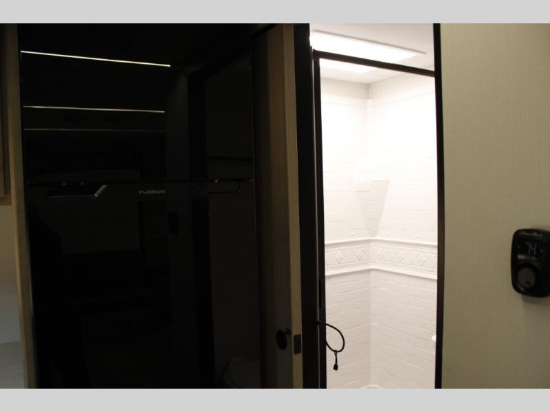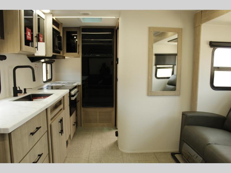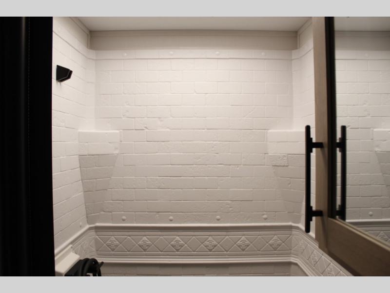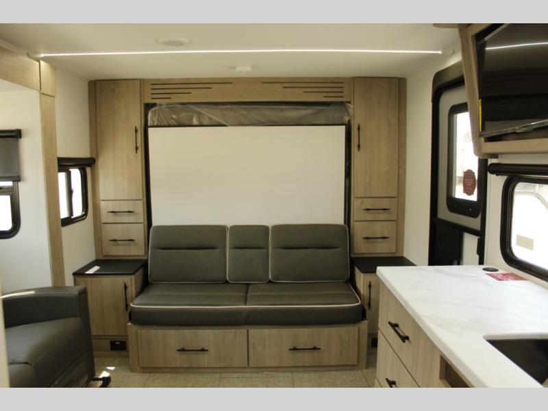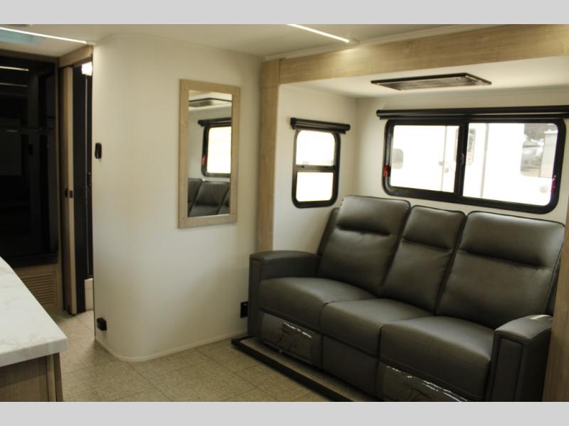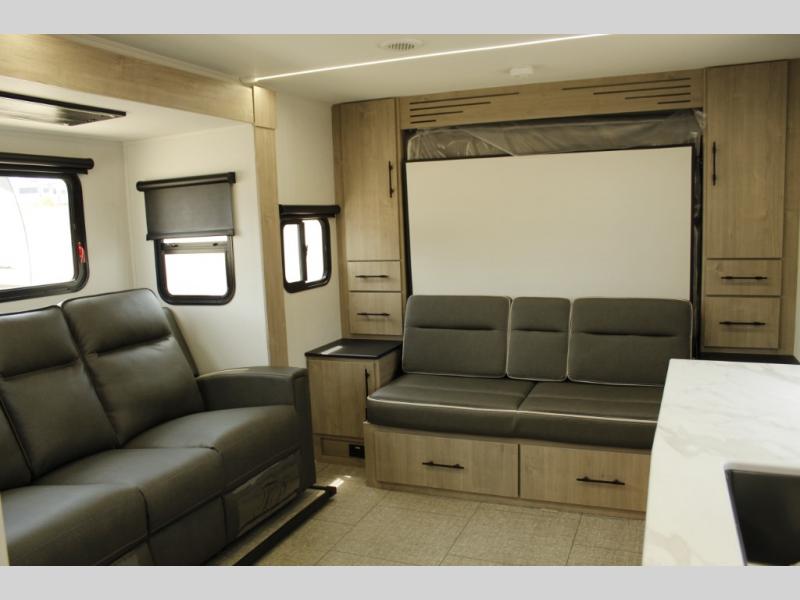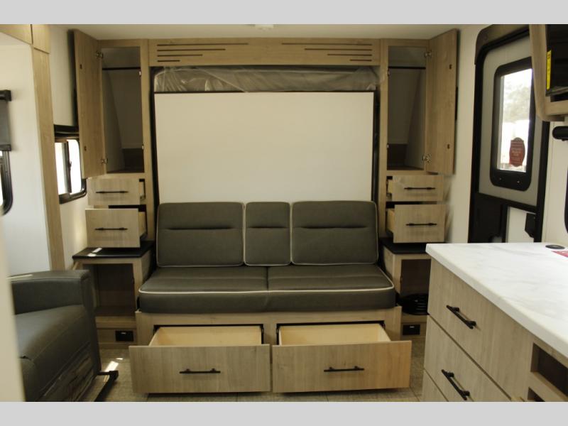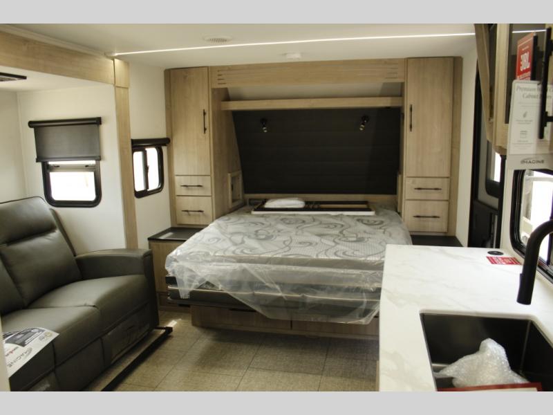 The Murphy bed is the eye-catching feature on this Imagine XLS travel trailer! Not only can it fold away in the morning to reveal a sofa for lounging, but it will also provide you with drawer storage under the sofa. Another functional feature is the theater dinette with a removable table in front or you can choose the optional U-shaped dinette if you like to gather around for game night. It rests on the single slide so that there is more floor space, and it offers you great comfort while you dine across from the LED HDTV. A full bathroom will keep you clean and fresh with its residential walk-in shower, skylight, linen closet, vanity, toilet, and power vent fan.