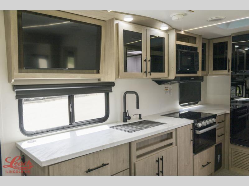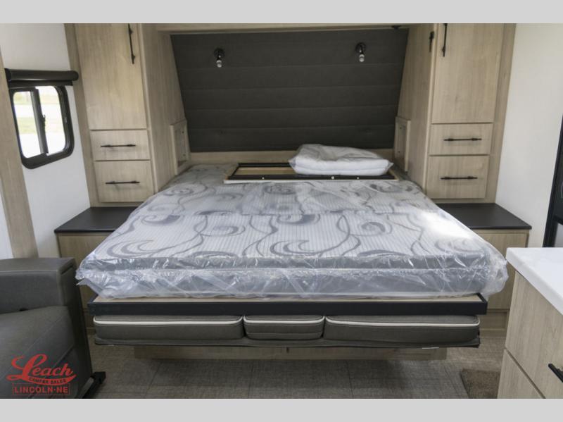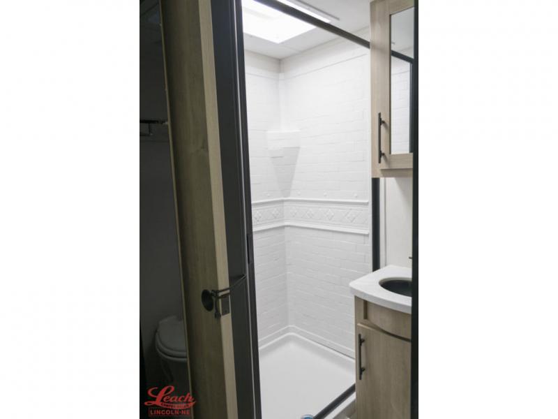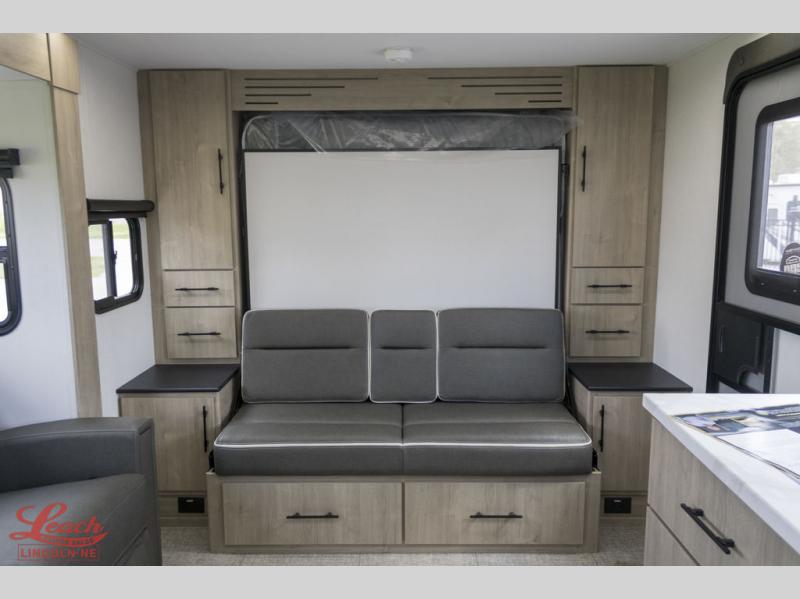 The Murphy bed is the eye-catching feature on this Imagine XLS travel trailer! Not only can it fold away in the morning to reveal a sofa for lounging, but it will also provide you with drawer storage under the sofa. Another functional feature is the theater dinette with a removable table in front or you can choose the optional U-shaped dinette if you like to gather around for game night. It rests on the single slide so that there is more floor space, and it offers you great comfort while you dine across from the LED HDTV. A full bathroom will keep you clean and fresh with its residential walk-in shower, skylight, linen closet, vanity, toilet, and power vent fan.