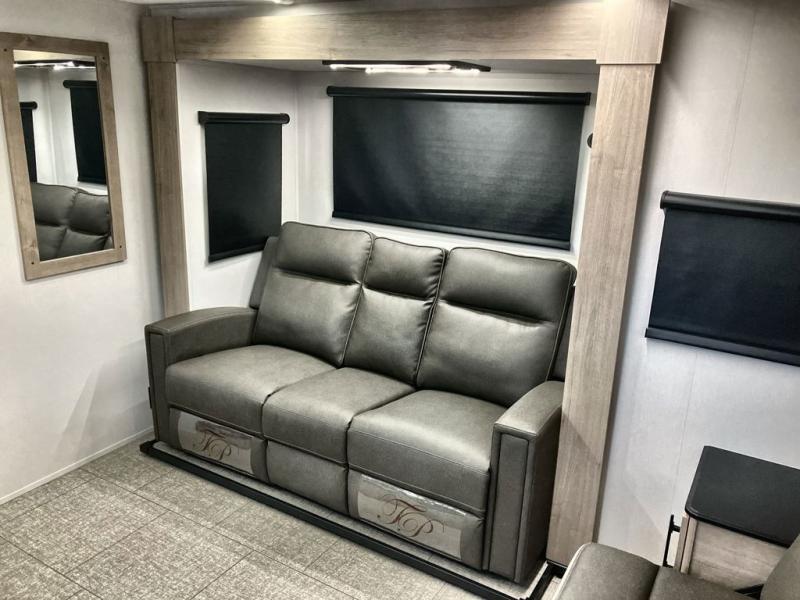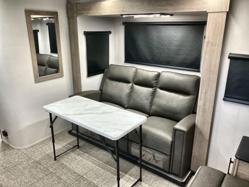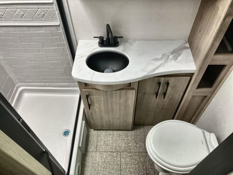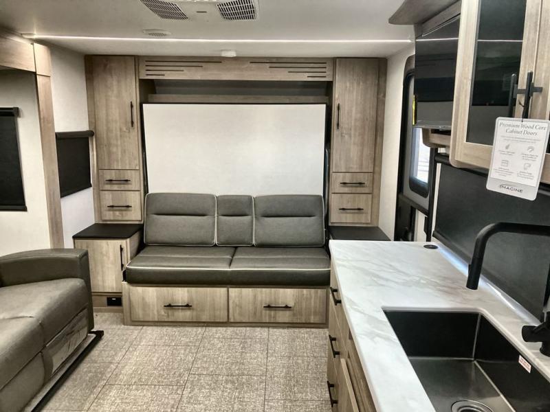 The Murphy bed is the eye-catching feature on this Imagine XLS travel trailer! Not only can it fold away in the morning to reveal a sofa for lounging, but it will also provide you with drawer storage under the sofa. Another functional feature is the theater dinette with a removable table in front or you can choose the optional U-shaped dinette if you like to gather around for game night. It rests on the single slide so that there is more floor space, and it offers you great comfort while you dine across from the LED HDTV. A full bathroom will keep you clean and fresh with its residential walk-in shower, skylight, linen closet, vanity, toilet, and power vent fan.