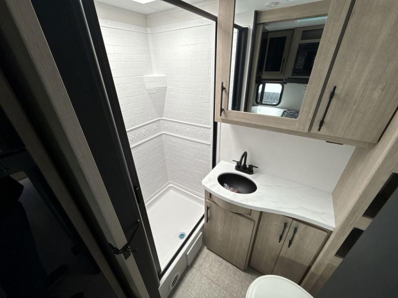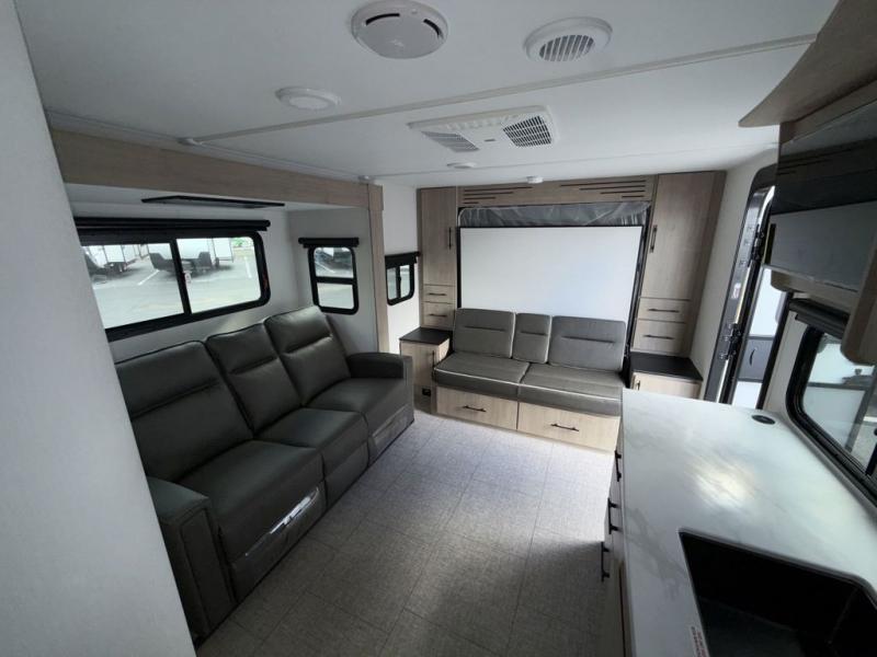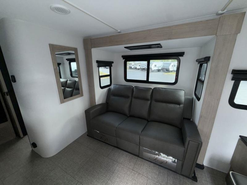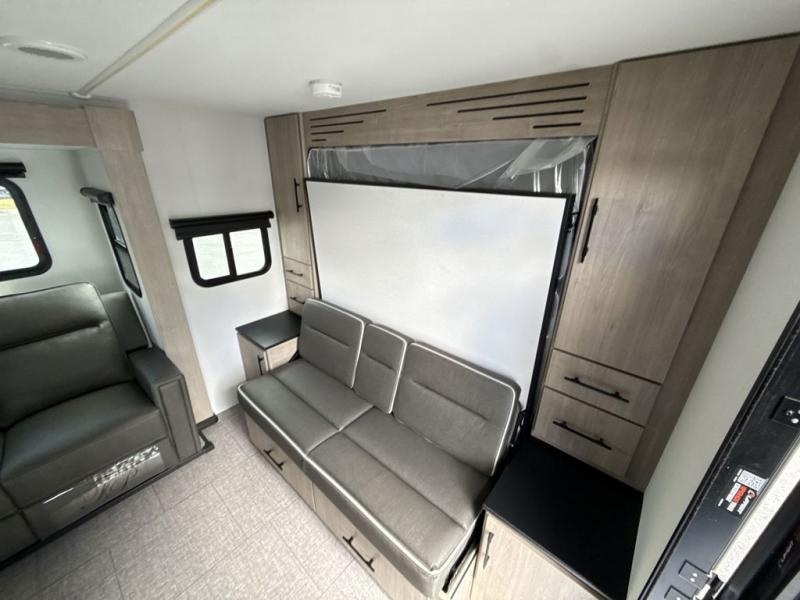 The Murphy bed is the eye-catching feature on this Imagine XLS travel trailer! Not only can it fold away in the morning to reveal a sofa for lounging, but it will also provide you with drawer storage under the sofa. Another functional feature is the theater dinette with a removable table in front or you can choose the optional U-shaped dinette if you like to gather around for game night. It rests on the single slide so that there is more floor space, and it offers you great comfort while you dine across from the LED HDTV. A full bathroom will keep you clean and fresh with its residential walk-in shower, skylight, linen closet, vanity, toilet, and power vent fan.