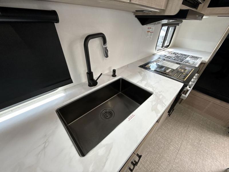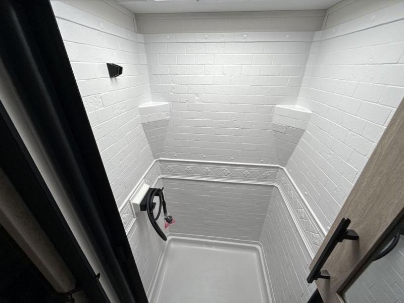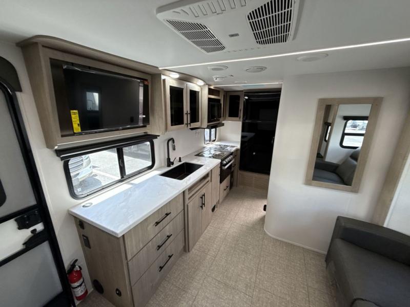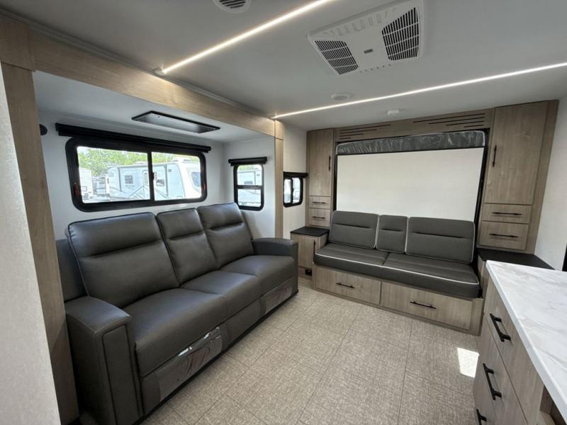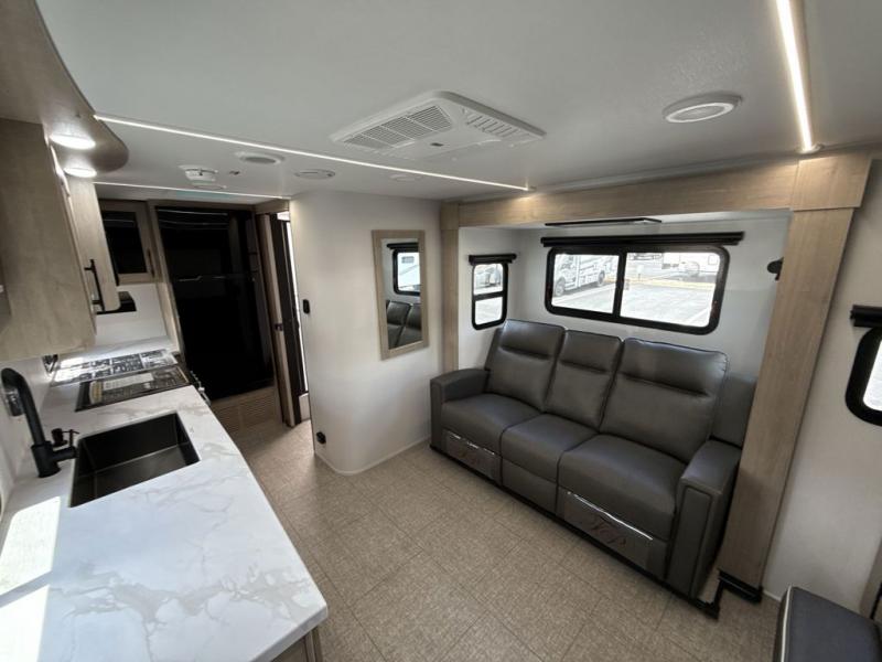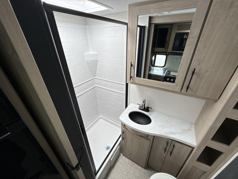 The Murphy bed is the eye-catching feature on this Imagine XLS travel trailer! Not only can it fold away in the morning to reveal a sofa for lounging, but it will also provide you with drawer storage under the sofa. Another functional feature is the theater dinette with a removable table in front or you can choose the optional U-shaped dinette if you like to gather around for game night. It rests on the single slide so that there is more floor space, and it offers you great comfort while you dine across from the LED HDTV. A full bathroom will keep you clean and fresh with its residential walk-in shower, skylight, linen closet, vanity, toilet, and power vent fan.