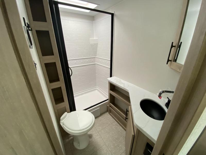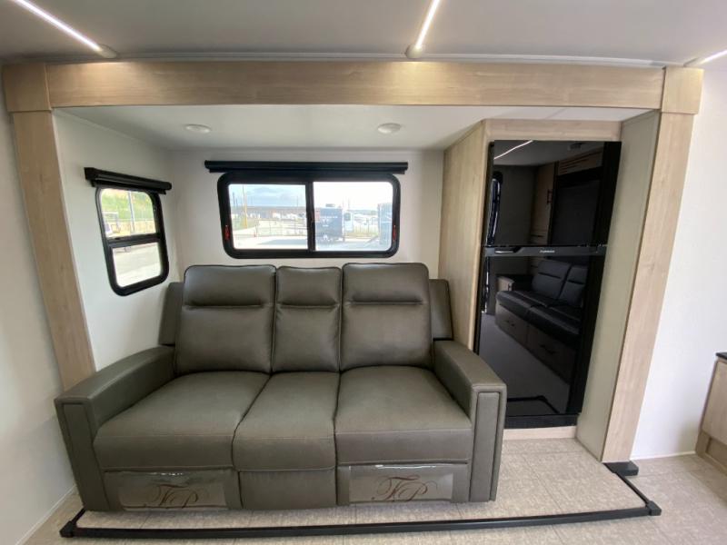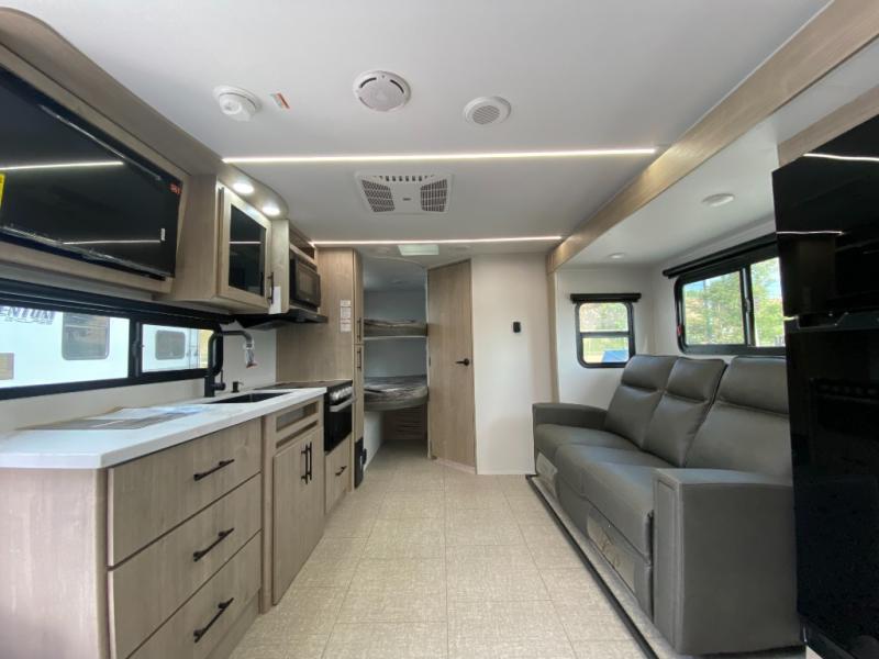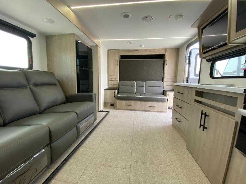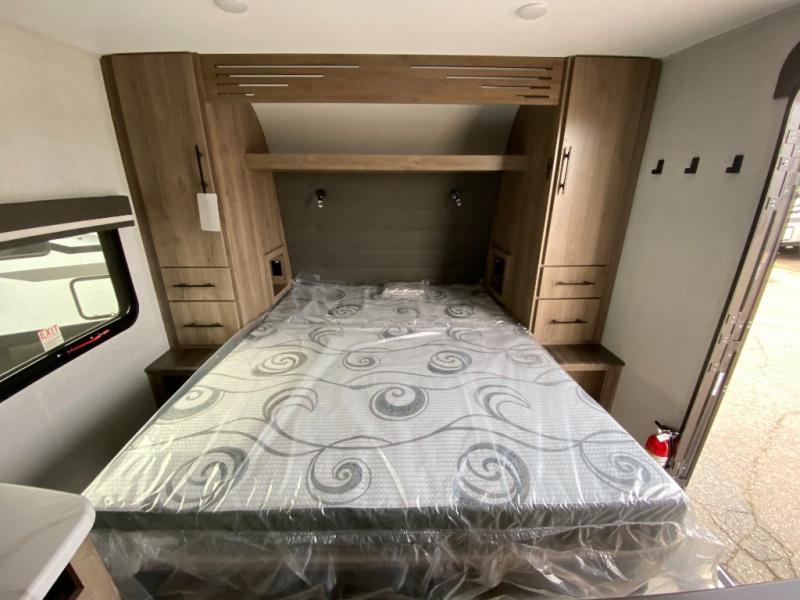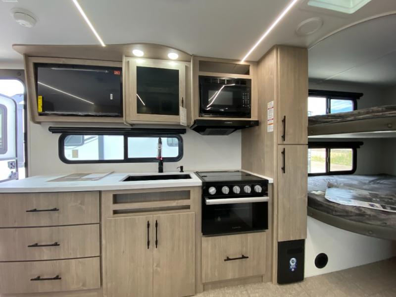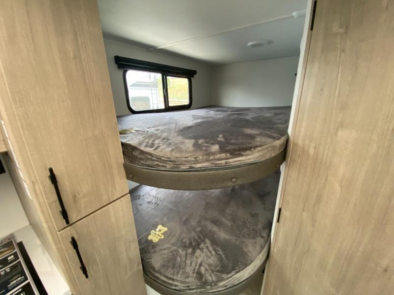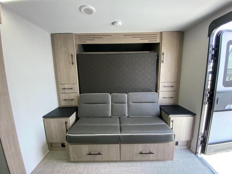 This travel trailer has everything you need for a great vacation! You will never miss home when you see all of the amenities included on this trailer. There is a full bathroom for easy morning routines, a set of 47" x 76" double over double-size bunks with privacy curtains for compact sleeping, a U-shaped dinette for meal times, and a full kitchen with all of the appliances needed for filling meals. You could even switch out the dinette for an optional theater dinette. The front Murphy bed not only provides versatility with a bed to sleep on at night, and a seating area during the day, but also a removable interior/exterior table. In addition to all of that, you'll also find an outdoor griddle and 1.6 cu. ft. refrigerator that you can use when the weather is nice. The unobstructed pass-through storage will be able to store your fishing poles and sports equipment while you travel.
