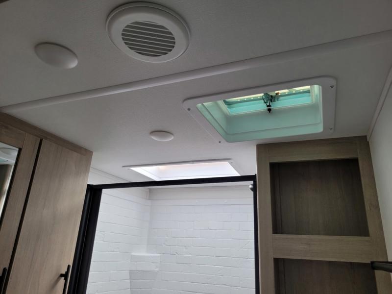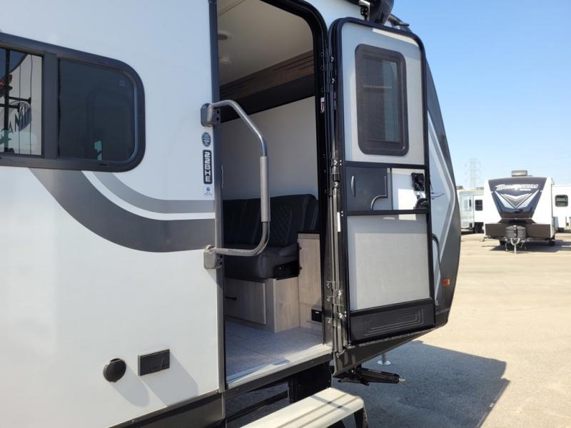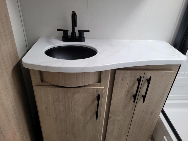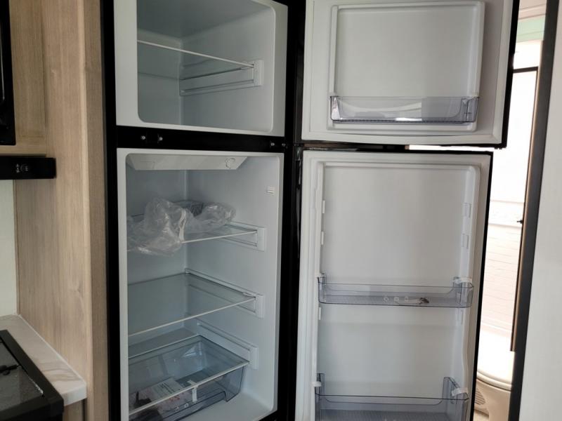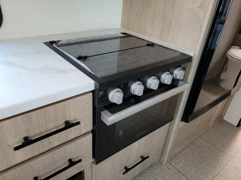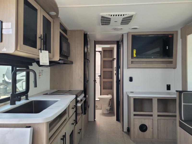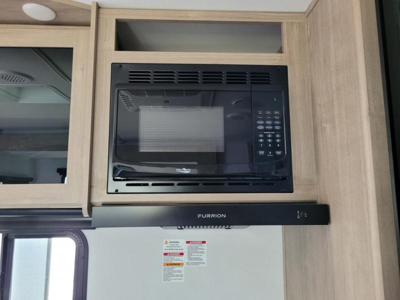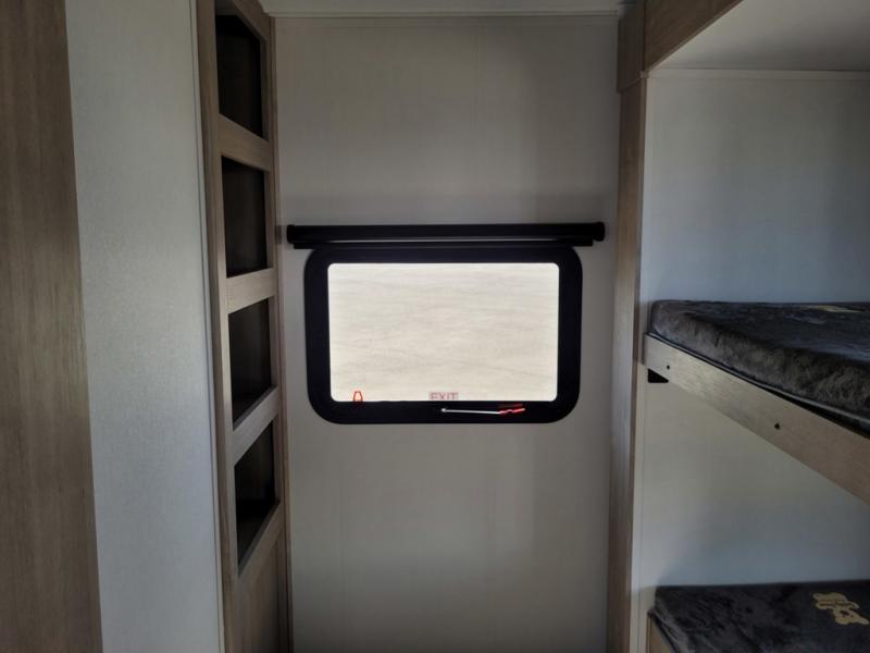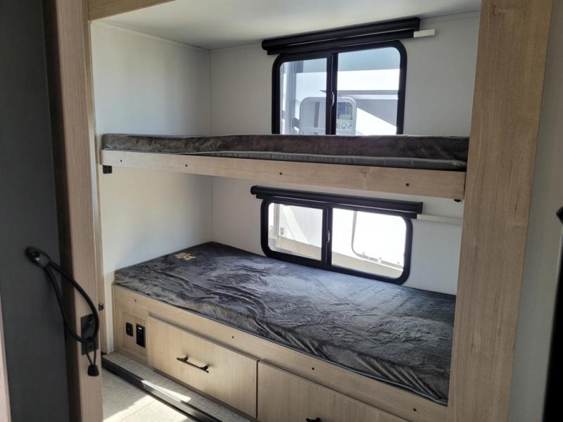 Your family will love camping in this spacious and versatile trailer thanks to the double slides and Murphy bed provided. During the day the Murphy bed is tucked away to provide more space and seating, and at night when folded down, there is a curtain for some privacy as you sleep. The booth dinette slides out to provide even more space and features windows on three sides so you can look out at your surroundings while you enjoy breakfast. The 30" flip top and bottom bunks each have some privacy with the sliding door, and the bunks are right next to the full bathroom for easy access in the middle of the night. The kitchen features everything you need to create meals and snacks as you travel, and you can have some more prep space by using the flip-up countertop extension.