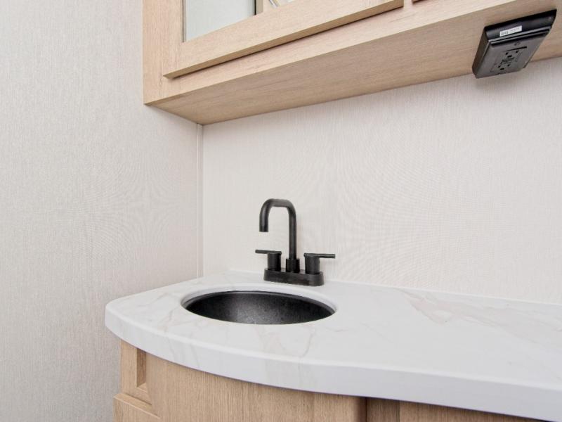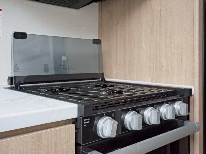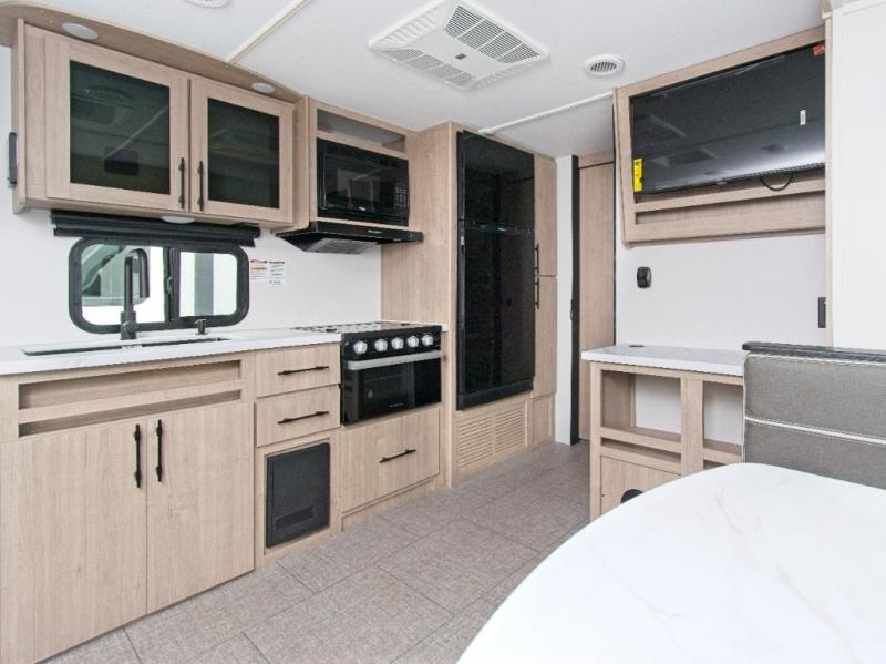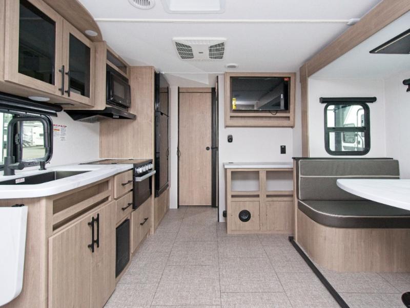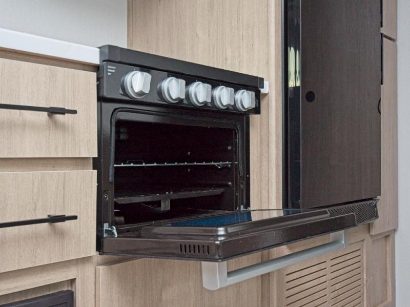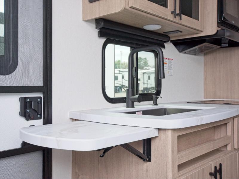 The kitchen is equipped with everything you need to prepare meals and snacks on the go. The flip-up countertop extension provides extra prep space, making cooking a breeze.