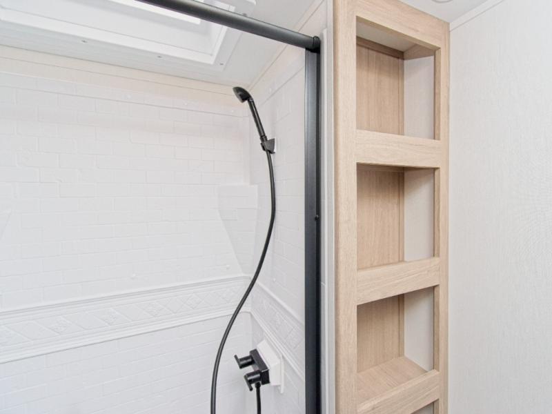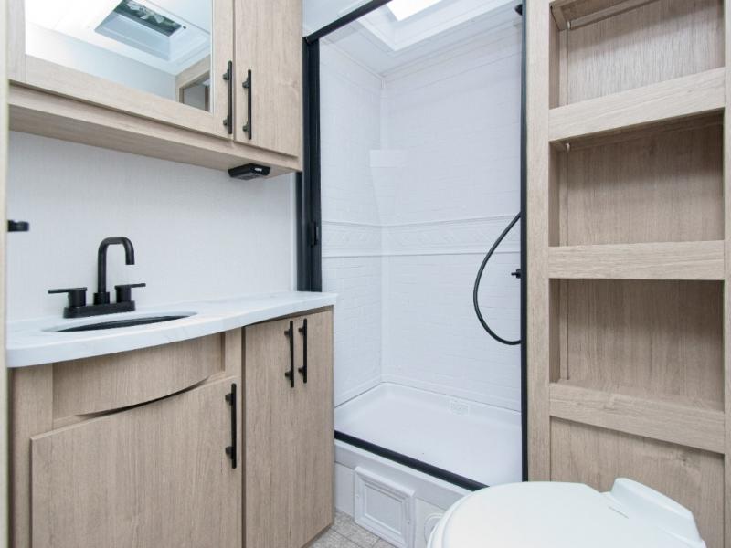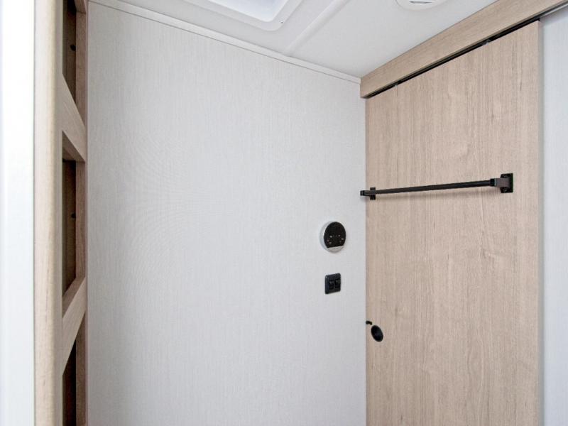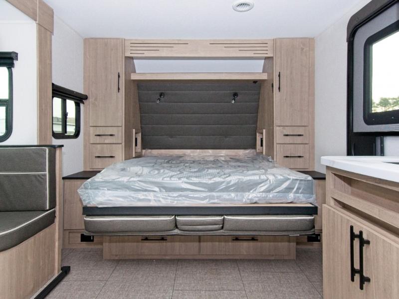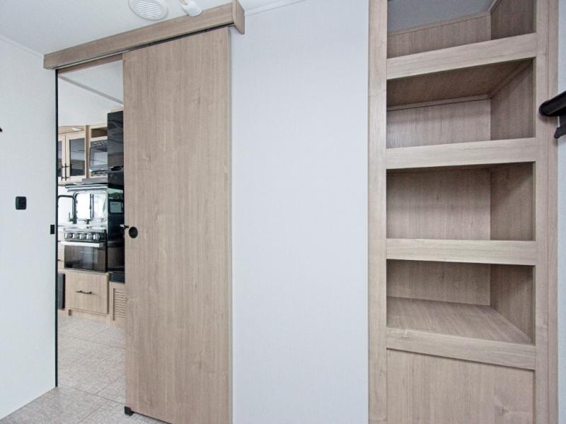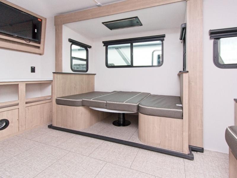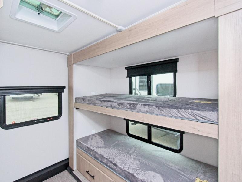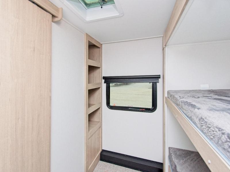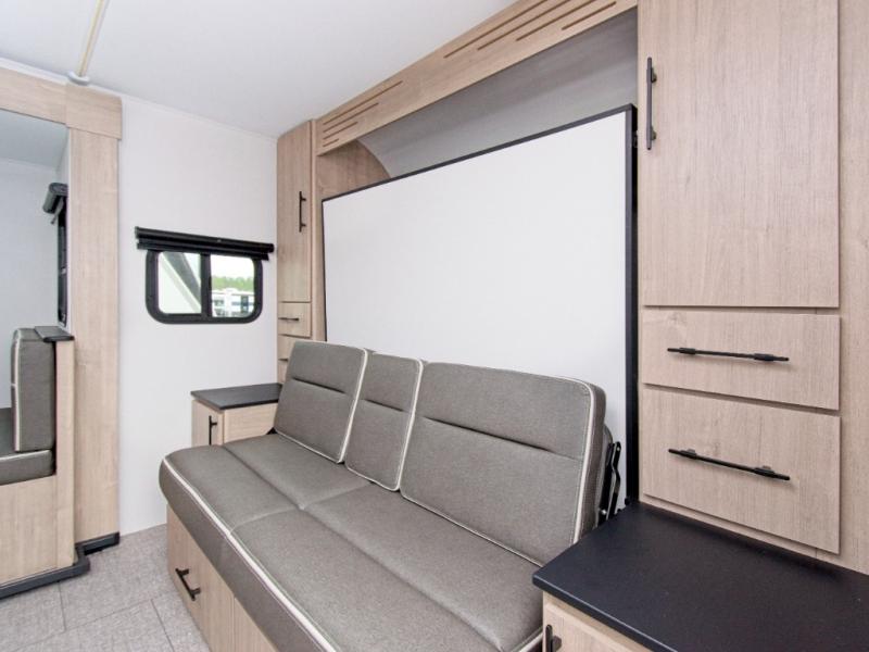 The 30" flip top and bottom bunks offer privacy with a sliding door and are conveniently located next to the full bathroom for easy access during the night. The Murphy bed tucks away during the day to provide additional seating space.