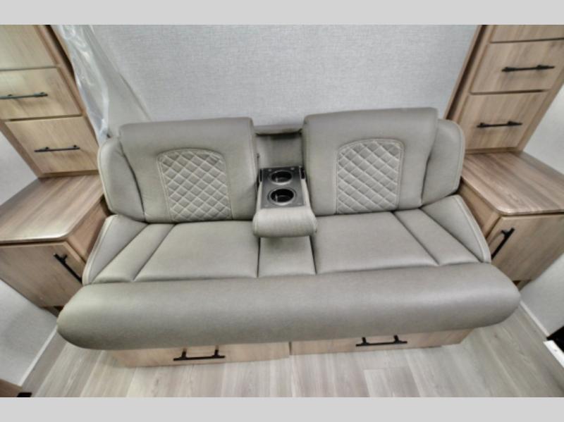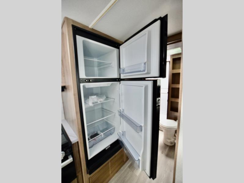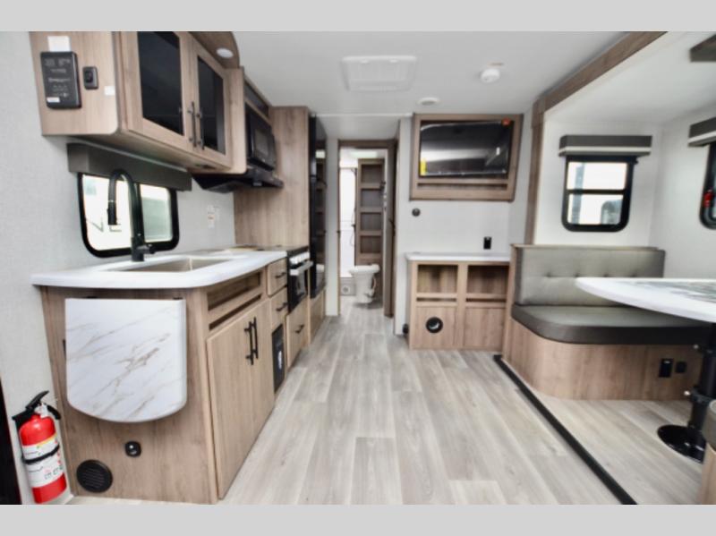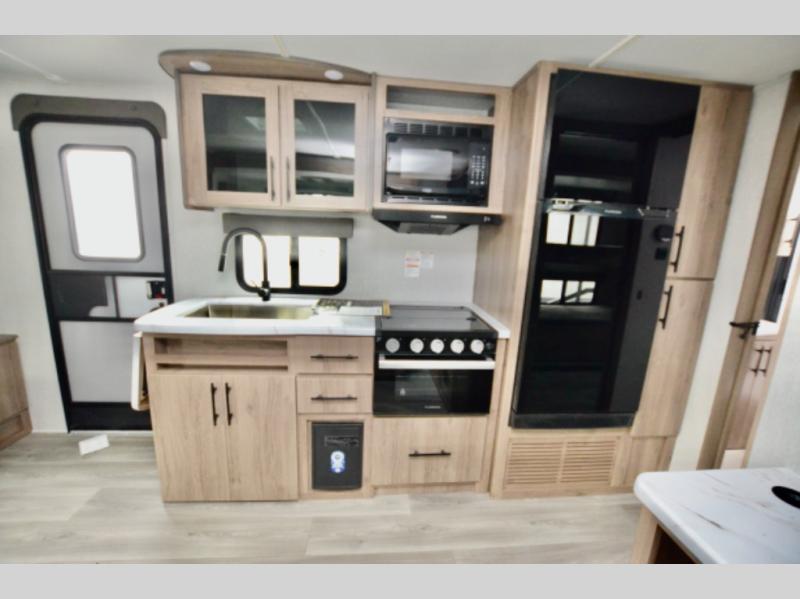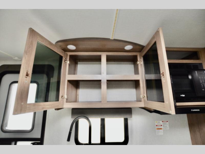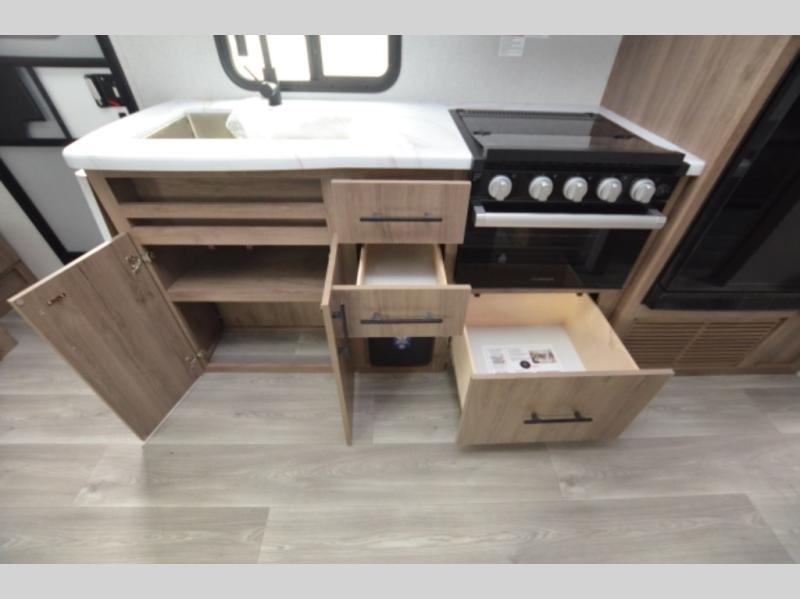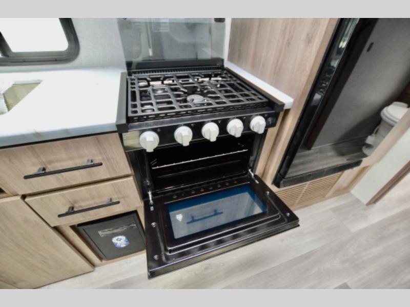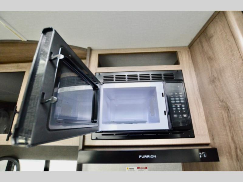 - Modern Kitchen: With a three-burner cooktop, microwave, and a 12V 10 cu. ft. refrigerator, the kitchen has everything you need to prepare meals on the go. The flip-up countertop extension provides more room for meal prep or serving food.