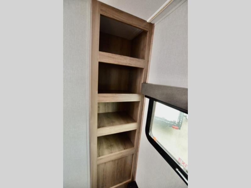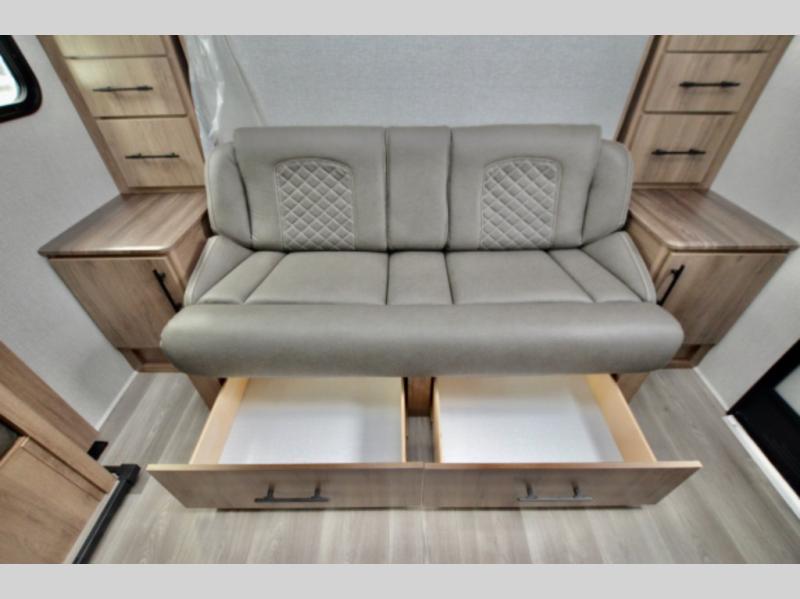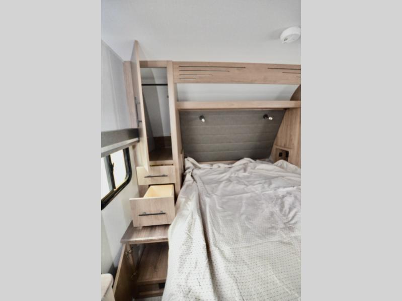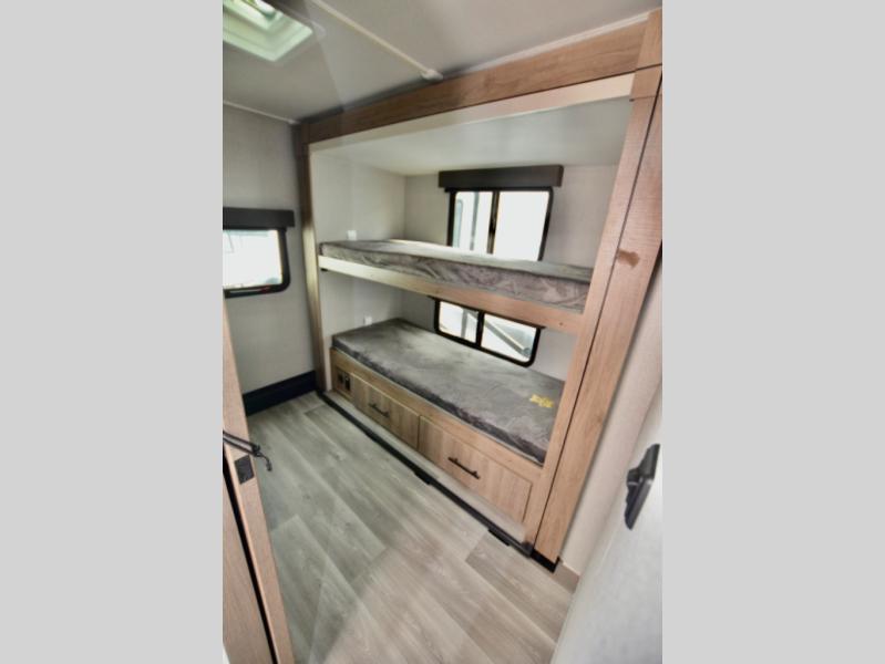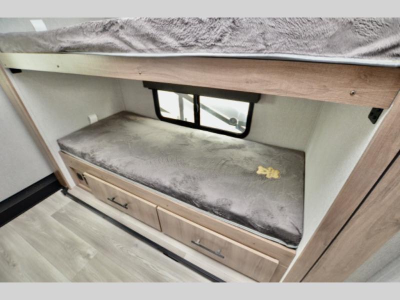 - 30” Bunk Beds in Slide: The bunk bed slide-out design maximizes floor space and allows for spacious sleeping accommodations without compromising on living area. Each bunk features a flip-top for easy storage access and privacy curtains, making it the perfect place for kids or guests to relax.