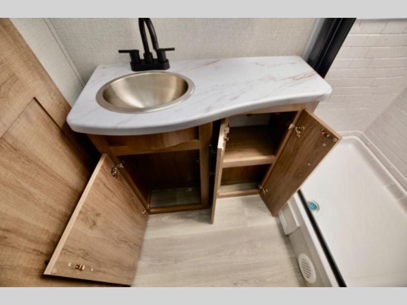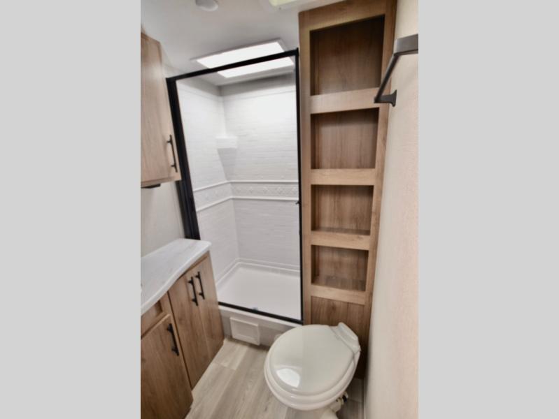 - Full Bathroom: The bathroom, conveniently located next to the bunk area, includes a residential shower with skylight, toilet, vanity with sink, and additional storage. Having the bathroom close to the bunks ensures easy access for everyone, especially during the night.