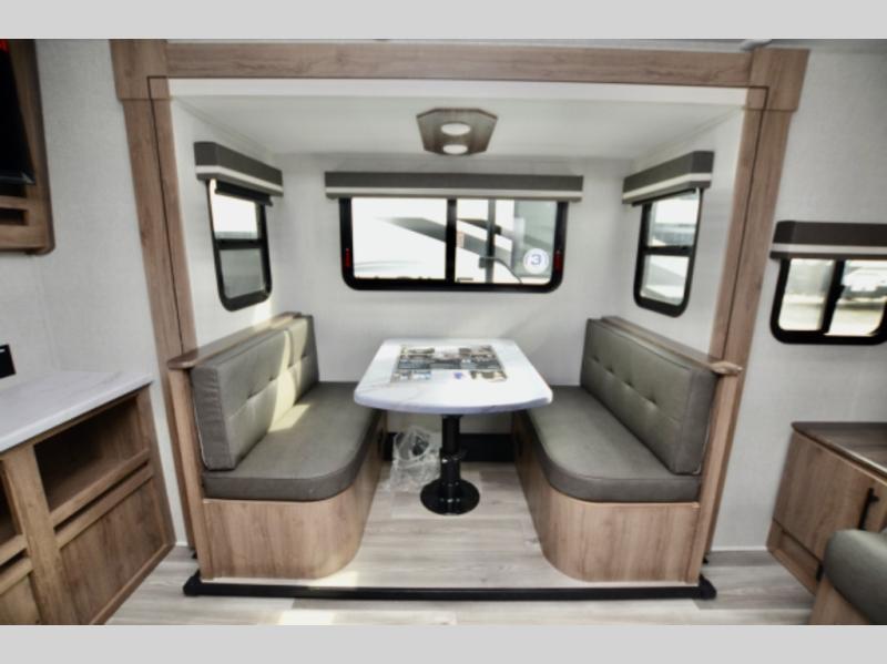 - Booth Dinette: The booth dinette not only serves as a dining area but also converts into an additional sleeping space if needed. With windows on three sides, it’s a bright and inviting spot to enjoy your morning coffee while taking in the view.