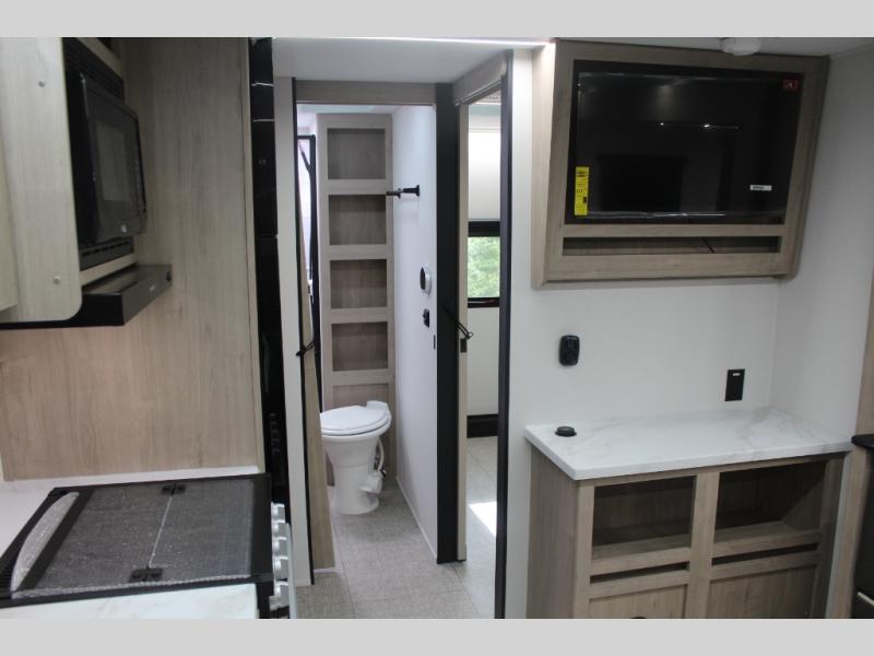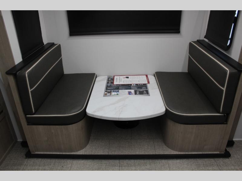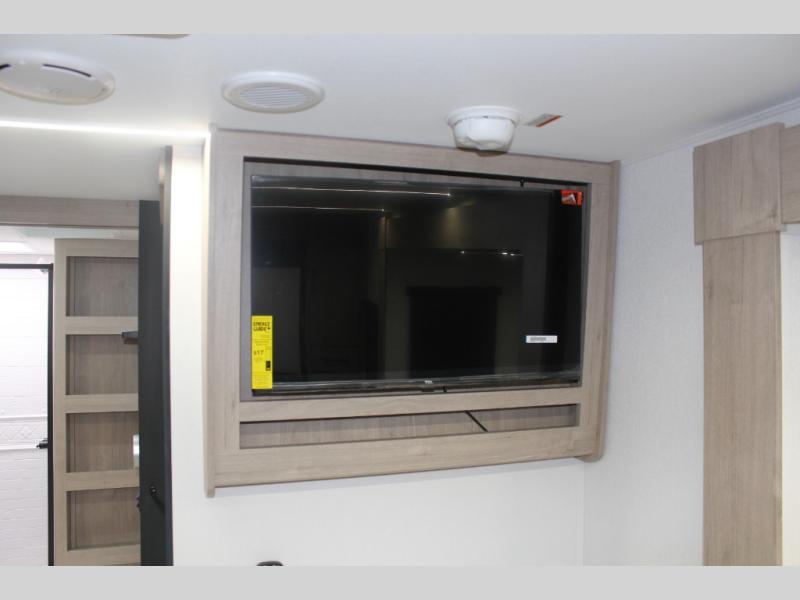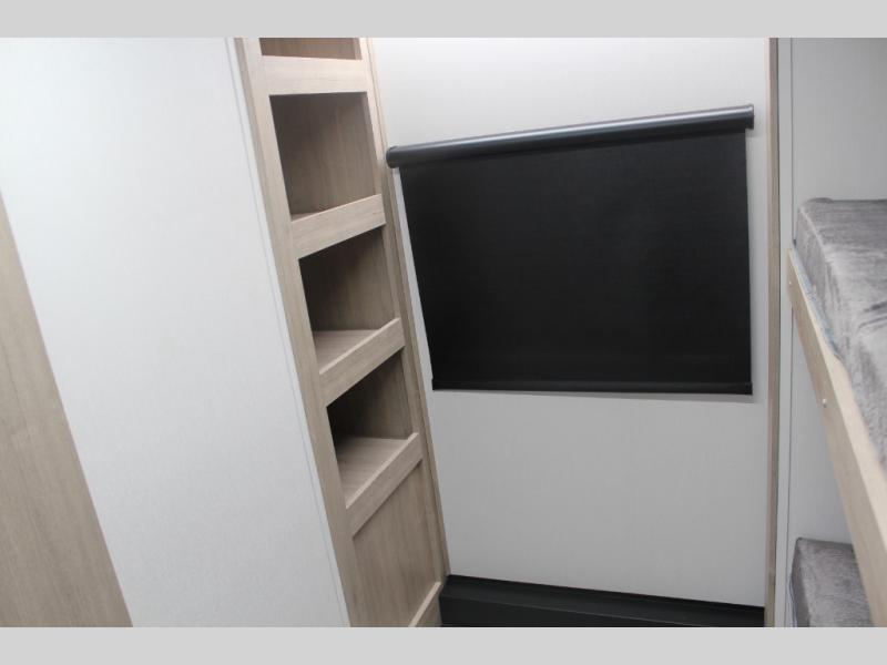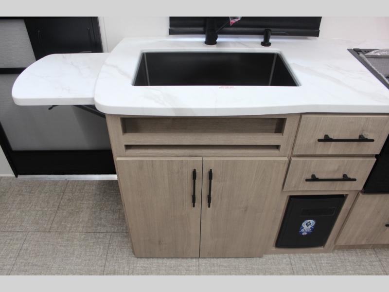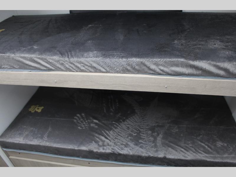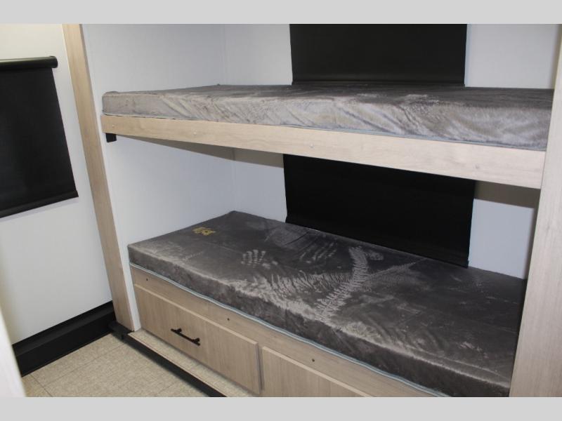 Your family will love camping in this spacious and versatile trailer thanks to the double slides and Murphy bed provided. During the day the Murphy bed is tucked away to provide more space and seating, and at night when folded down, there is a curtain for some privacy as you sleep. The booth dinette slides out to provide even more space and features windows on three sides so you can look out at your surroundings while you enjoy breakfast. The 30" flip top and bottom bunks each have some privacy with the sliding door, and the bunks are right next to the full bathroom for easy access in the middle of the night. The kitchen features everything you need to create meals and snacks as you travel, and you can have some more prep space by using the flip-up countertop extension.