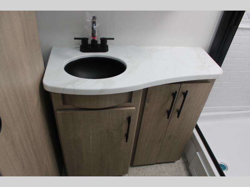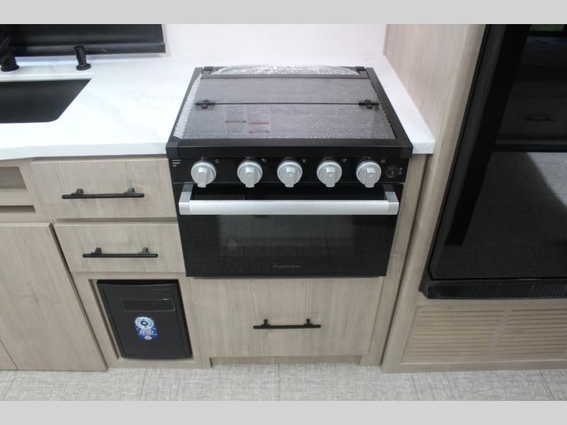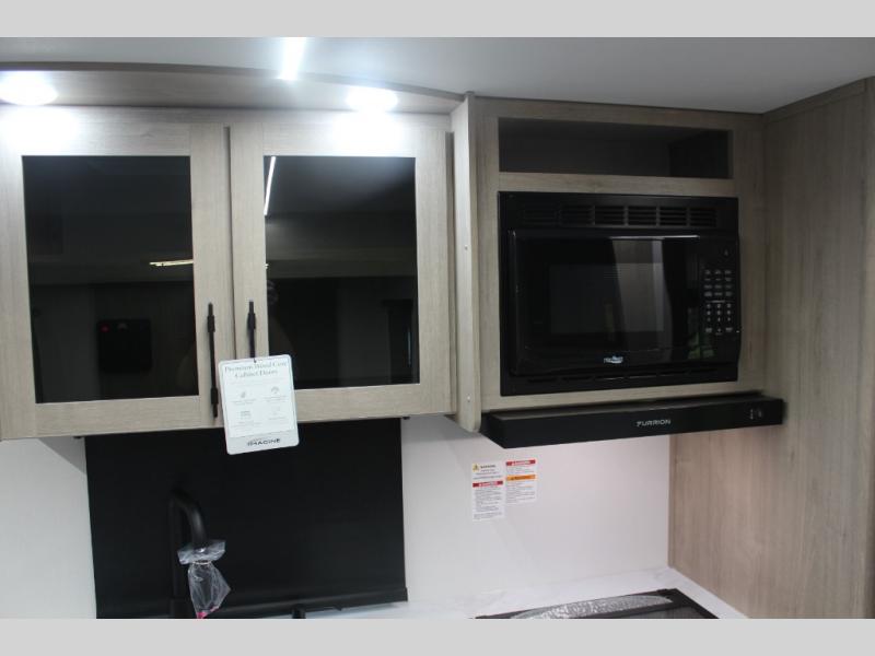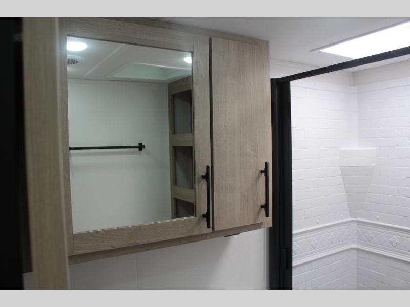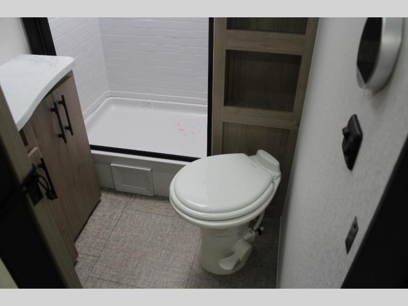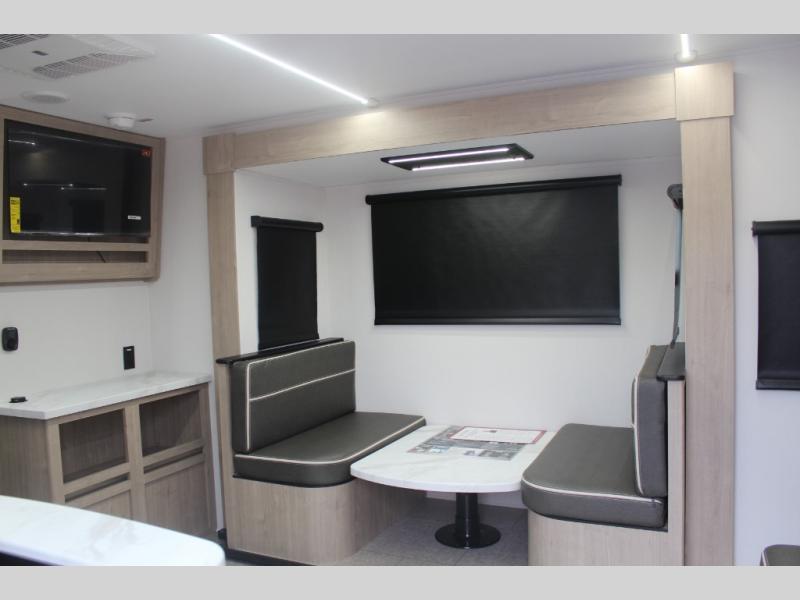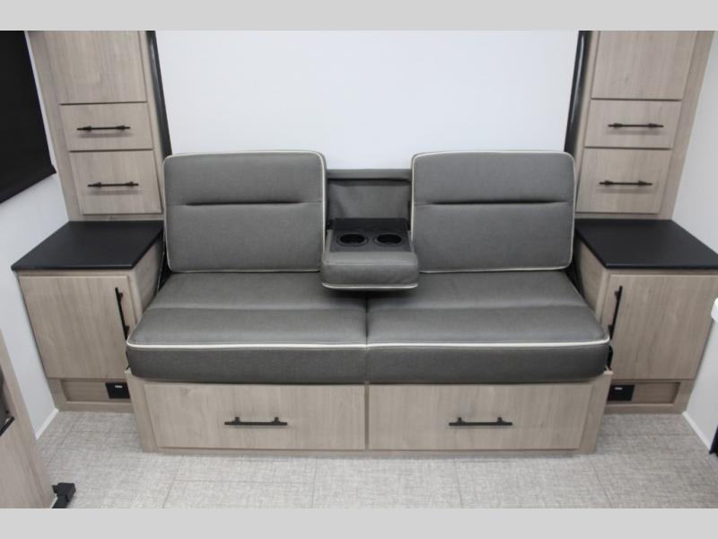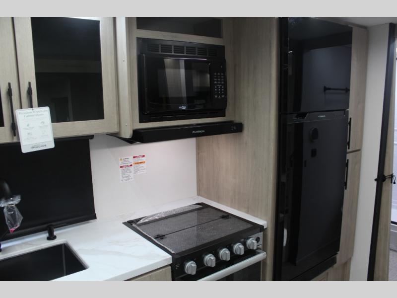 Your family will love camping in this spacious and versatile trailer thanks to the double slides and Murphy bed provided. During the day the Murphy bed is tucked away to provide more space and seating, and at night when folded down, there is a curtain for some privacy as you sleep. The booth dinette slides out to provide even more space and features windows on three sides so you can look out at your surroundings while you enjoy breakfast. The 30" flip top and bottom bunks each have some privacy with the sliding door, and the bunks are right next to the full bathroom for easy access in the middle of the night. The kitchen features everything you need to create meals and snacks as you travel, and you can have some more prep space by using the flip-up countertop extension.